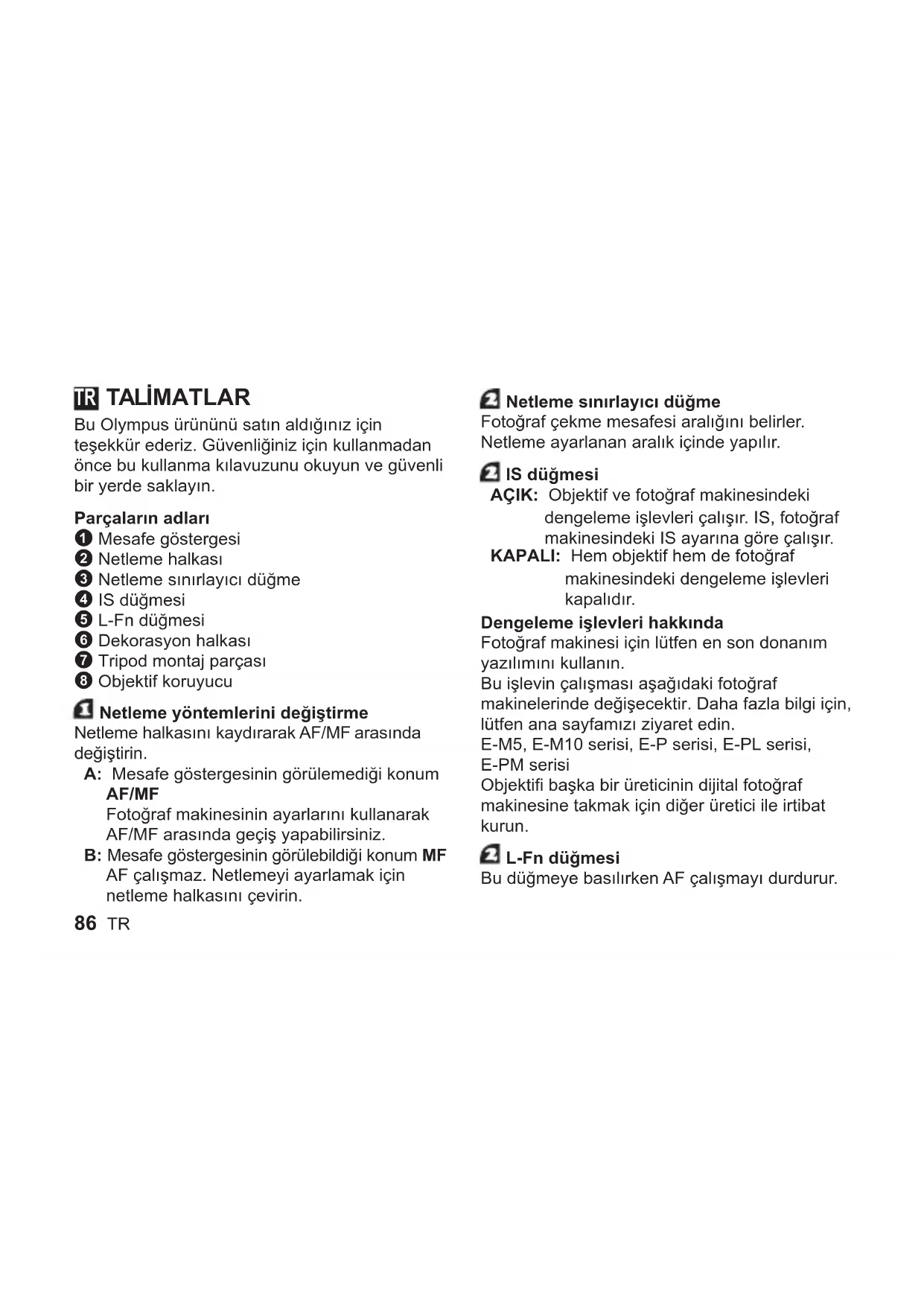 - 86 TR TALİMATLAR Bu Olympus ürününü satın aldığınız için teşekkür ederiz. Güvenliğiniz için kullanmadan önce bu kullanma kılavuzunu okuyun ve güvenli bir yerde saklayın. Parçaların adları 1 Mesafe göstergesi 2 Netleme halkası 3 Netleme sınırlayıcı düğme 4 IS düğmesi 5 L-Fn düğmesi 6 Dekorasyon halkası 7 Tripod montaj parçası 8 Objektif koruyucu Netleme yöntemlerini değiştirme Netleme halkasını kaydırarak AF/MF arasında değiştirin. A: Mesafe göstergesinin görülemediği konum AF/MF Fotoğraf makinesinin ayarlarını kullanarak AF/MF arasında geçiş yapabilirsiniz. B: Mesafe göstergesinin görülebildiği konum MF AF çalışmaz. Netlemeyi ayarlamak için netleme halkasını çevirin. Netleme sınırlayıcı düğme Fotoğraf çekme mesafesi aralığını belirler. Netleme ayarlanan aralık içinde yapılır. IS düğmesi AÇIK: Objektif ve fotoğraf makinesindeki dengeleme işlevleri çalışır. IS, fotoğraf makinesindeki IS ayarına göre çalışır. KAPALI: Hem objektif hem de fotoğraf makinesindeki dengeleme işlevleri kapalıdır. Dengeleme işlevleri hakkında Fotoğraf makinesi için lütfen en son donanım yazılımını kullanın. Bu işlevin çalışması aşağıdaki fotoğraf makinelerinde değişecektir. Daha fazla bilgi için, lütfen ana sayfamızı ziyaret edin. E-M5, E-M10 serisi, E-P serisi, E-PL serisi, E-PM serisi Objektifi başka bir üreticinin dijital fotoğraf makinesine takmak için diğer üretici ile irtibat kurun. L-Fn düğmesi Bu düğmeye basılırken AF çalışmayı durdurur. TRTR 87 Tripod montaj parçasını çıkarma ve dekorasyon halkasını takma Tripod montaj parçasını çıkarma: Gevşetmek için tripod montaj parçasının düğmesini sola çevirin 1. Tripod montaj parçasını sola çevirerek işaretle hizalayın 2 ve tripod montaj parçasını objektif gövdesinden çıkarın 3. Dekorasyon halkasını takma: İşaretleri hizalayın ve dekorasyon halkasını takın 1, ardından durana kadar halkayı sağa çevirin 2. Objektif koruyucu nasıl kullanılır Durana kadar dışarıya doğru çekin 1 ve ardından onu sağa çevirin 2. Objektif koruyucu objektiften çıkarılamaz. Çekim konusunda notlar