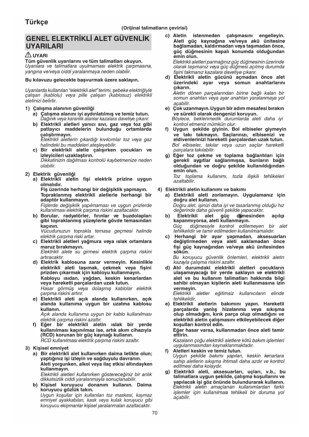 a) Elektrikli aleti zorlamayın. Uygulamanız için doğru alet kullanın. Doğru alet, işinizi daha iyi ve tasarlanmış olduğu hız değerinde daha güvenli şekilde yapacaktır. b) Elektrikli alet güç dü ğmesinden açılıp kapanmıyorsa, aleti kullanmayın. Güç düğmesiyle kontrol edilemeyen bir alet tehlikelidir ve tamir edilmeden kullanılmamalıdır. c) Herhangi bir ayar yapmadan, aksesuarları değiştirmeden veya aleti saklamadan önce fi şi güç kaynağından ve/veya akü ünitesinden sökün. Bu koruyucu güvenlik önlemleri, elektrikli aletin kazayla çalışma riskini azaltır. d) Atıl durumdaki elektrikli aletleri çocukların ulaşamayacağı bir yerde saklayın ve elektrikli alet ve bu kullanım talimatları hakkında bilgi sahibi olmayan kişilerin aleti kullanmasına izin vermeyin. Elektrikli aletler eğitimsiz kullanıcıların elinde tehlikelidir. e) Elektrikli aletlerin bakımını yapın. Hareketli parçalarda yanlış hizalanma veya sıkışma olup olmadığ ını, kırık parça olup olmadığını ve elektrikli aletin çalışmasını etkileyebilecek diğer koşulları kontrol edin. Eğer hasar varsa, kullanmadan önce aleti tamir ettirin. Kazaların çoğu elektrikli aletlere kötü bakım işlemleri uygulanmasından kaynaklanmaktadır. f) Aletleri keskin ve temiz tutun. Uygun şekilde bakımı yapılan, keskin kenarlara sahip aletlerin sıkışma ihtimali daha azdır ve kontrol edilmesi daha kolaydır. g) Elektrikli aleti, aksesuarları, uçları, v.b., bu talimatlara uygun şekilde, çalışma koşullarını ve yapılacak işi göz önünde bulundurarak kullanın. Elektrikli aletin amaçlanan kullanımlardan farklı işlemler için kullanılmas ı tehlikeli bir duruma yol açabilir. GENEL ELEKTRİKLİ ALET GÜVENLİK UYARILARI UYARI Tüm güvenlik uyarılarını ve tüm talimatları okuyun. Uyarılara ve talimatlara uyulmaması elektrik çarpmasına, yangına ve/veya ciddi yaralanmaya neden olabilir. Bu kılavuzu gelecekte başvurmak üzere saklayın. Uyarılarda kullanılan “elektrikli alet” terimi, şebeke elektriğiyle çalışan (kablolu) veya pille çalışan (kablosuz) elektrikli aletinizi belirtir.