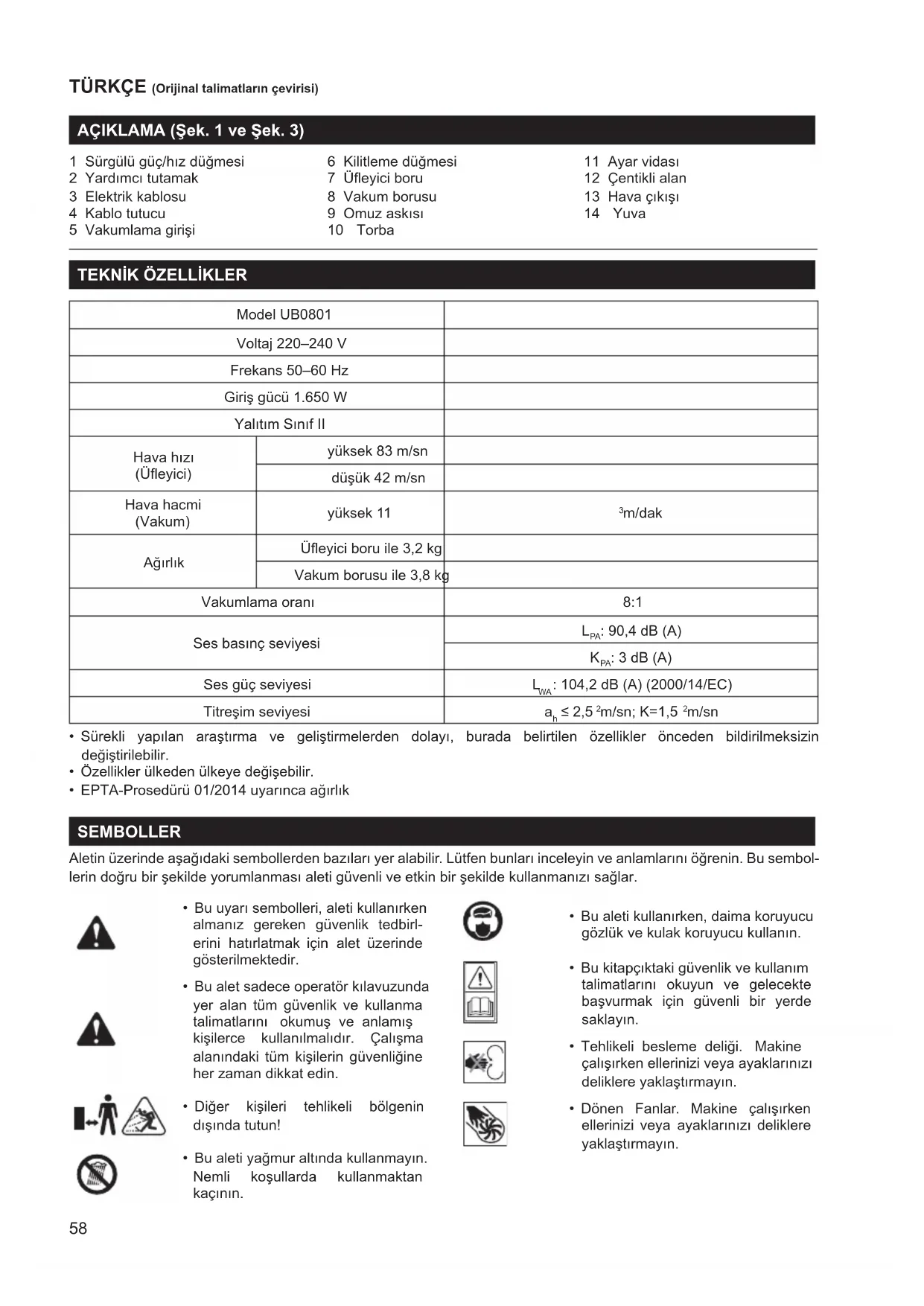 - Bu alet üfleme ve vakumlama icin tasarlanmistir. Aleti tasarlanan amaci disinda, orneigin balon siirmek icin kullanmayin.