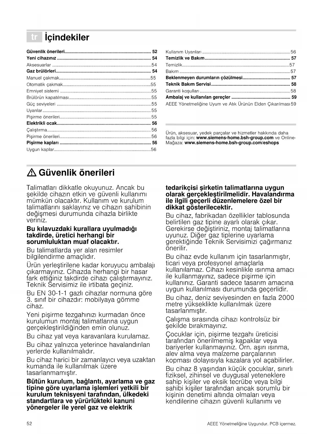 Üretici Firma : BSH Hausgeräte GmbH Carl-Wery Straße 34 81739 München, Germany www.siemens-home.bsh-group.com Phone : 00 49 89 4590-0159 Ambalaj ve kullanılan gereçler Özellikler tablosunda ) sembolü görülüyorsa aşağıdaki göstergelere dikkat ediniz. AEEE Yönetmeliğine Uyum ve Atık Ürünün Elden Çıkarılması Ambalaj malzemesini çevre kurallarına uygun şekilde imha ediniz. Cihazınızın ambalajı, nakliye sırasında etkin korumayı garanti etmek açısından çok gerekli olan malzemelerden üretilmiştir. Bu malzemeler tamamen geri dönüşebilir ve böylece çevreye verilen zarar azaltılmaktadır. Sizleri de aşağıdaki tavsiyelere uyarak çevrenin korunmasına katkıda bulunmaya davet ediyoruz: ■ ambalajı uygun geri dönüşüm kutusuna atınız, ■ cihazı hurdaya çıkarmadan önce kullanılmaz hale getiriniz. Bulunduğunuz yerin yerel yönetimine, geri dönüşebilen malzemelerin toplandığı en yakın merkeze danışınız ve cihazınızı oraya ulaştırınız, ■ kullanılmış yağı lavaboya dökmeyiniz. Yağı kapalı bir kaba koyarak çöp toplama noktasına veya bir çöp konteynerine bırakınız (kontrollü bir çöplüğe ulaşacaktır; bu en iyi çözüm olmasa da bu sayede suyun kirlenmesini engelleriz). Bu ürün T.C. Çevre ve Şehircilik Bakanlığı tarafından yayımlanan “Atık Elektrikli ve Elektronik Eşyaların Kontrolü Yönetmeliği’’nde belirtilen zararlı ve yasaklı maddeleri içermez. AEEE yönetmeliğine uygundur. Bu ürün, geri dönüşümlü ve tekrar kullanılabilir nitelikteki yüksek kaliteli parça ve malzemelerden üretilmiştir. Bu nedenle, ürünü, hizmet ömrünün sonunda evsel veya diğer atıklarla birlikte atmayın. Elektrikli ve elektronik cihazların geri dönüşümü için bir toplama noktasına götürün. Bu toplama noktalarını bölgenizdeki yerel yönetime sorun. Kullanılmış ürünleri geri kazanıma vererek çevrenin ve doğal kaynakların korunmas ına yardımcı olun. Ürünü atmadan önce çocukların güvenliği için elektrik fişini kesin ve kilit mekanizmasını kırarak çalışmaz duruma getirin.BSH Hausgeräte GmbH Carl-Wery-Straße 34 81739 München GERMANY *9000802377* 9000802377 (E) 971116 +HUJHVWHOOWYRQ%6++DXVJHUlWH*PE+XQWHU0DUNHQOL]HQ]GHU6LHPHQV$* 0DQXIDFWXUHGE\%6++DXVJHUlWH*PE+XQGHU7UDGHPDUN/LFHQVHRI6LHPHQV$* )DEULFDGRSRU%6++DXVJHUlWH*PE+EDMROLFHQFLDGHPDUFDGH6LHPHQV$* )DEULTXpSDU%6++DXVJHUlWH*PE+WLWXODLUHGHVGURLWVG·XWLOLVDWLRQGHODĂPDUTXH6LHPHQV$* 3URGRWWRGD%6++DXVJHUlWH*PE+LQTXDQWROLFHQ]LDWDULRGHOPDUFKLRGL6LHPHQV$* *HIDEULFHHUGGRRU%6++DXVJHUlWH*PE+RQGHUKDQGHOVPHUNOLFHQWLHYDQ6LHPHQV$* )DEULFDGRSHOD%6++DXVJHUlWH*PE+VREOLFHQoDGHPDUFDFRPHUFLDOGD6LHPHQV$* %6+(Y$OHWOHUL6DQD\LYH7LFDUHW$ûWDUDI×QGDQ6LHPHQV$*QLQ7LFDUL0DUND/LVDQV×LOHUHWLOPLüWLU