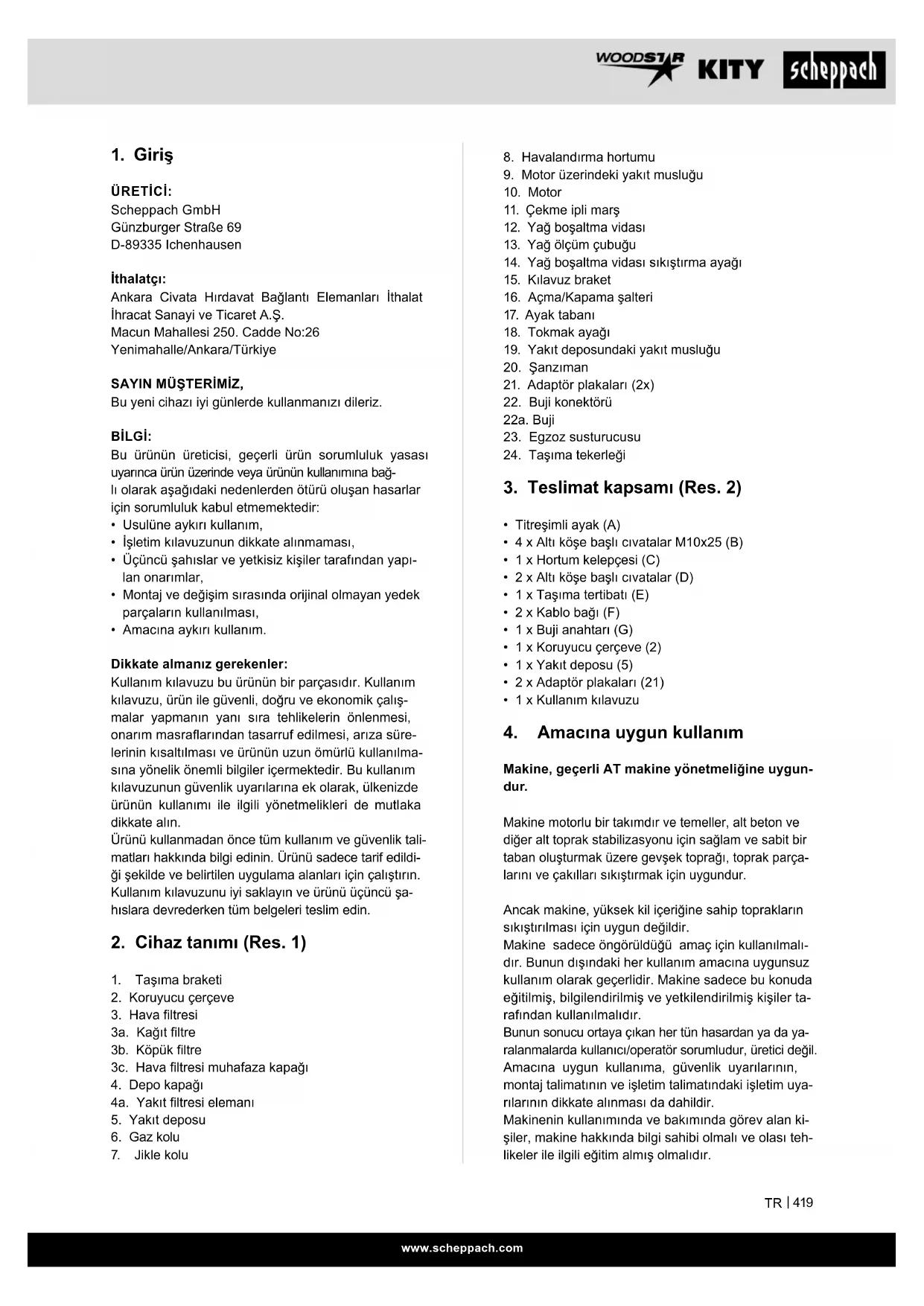ÜRETİCİ: Scheppach GmbH Günzburger Straße 69 D-89335 Ichenhausen İthalatçı: Ankara Civata Hırdavat Bağlantı Elemanları İthalat İhracat Sanayi ve Ticaret A.Ş. Macun Mahallesi 250. Cadde No:26 Yenimahalle/Ankara/Türkiye SAYIN MÜŞTERİMİZ, Bu yeni cihazı iyi günlerde kullanmanızı dileriz. BİLGİ: Bu ürünün üreticisi, geçerli ürün sorumluluk yasası uyarınca ürün üzerinde veya ürünün kullanımına bağ- lı olarak aşağıdaki nedenlerden ötürü oluşan hasarlar için sorumluluk kabul etmemektedir: