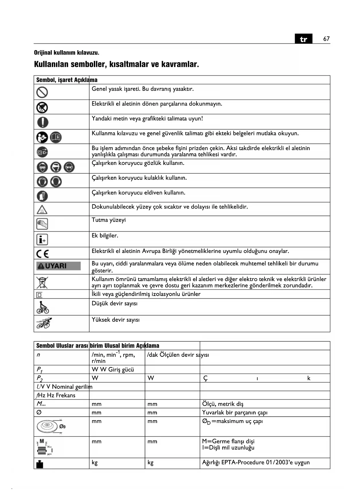 el aletini kullanmayin. Anilan belgeleri ileride kullanmak üzere saklayin ve elektrikli el aletini baskalarina verdiginizde veya devrettiginizde bu belgeleri de verin. Ilgili ulusal calisma hukumlinerine de uyun.