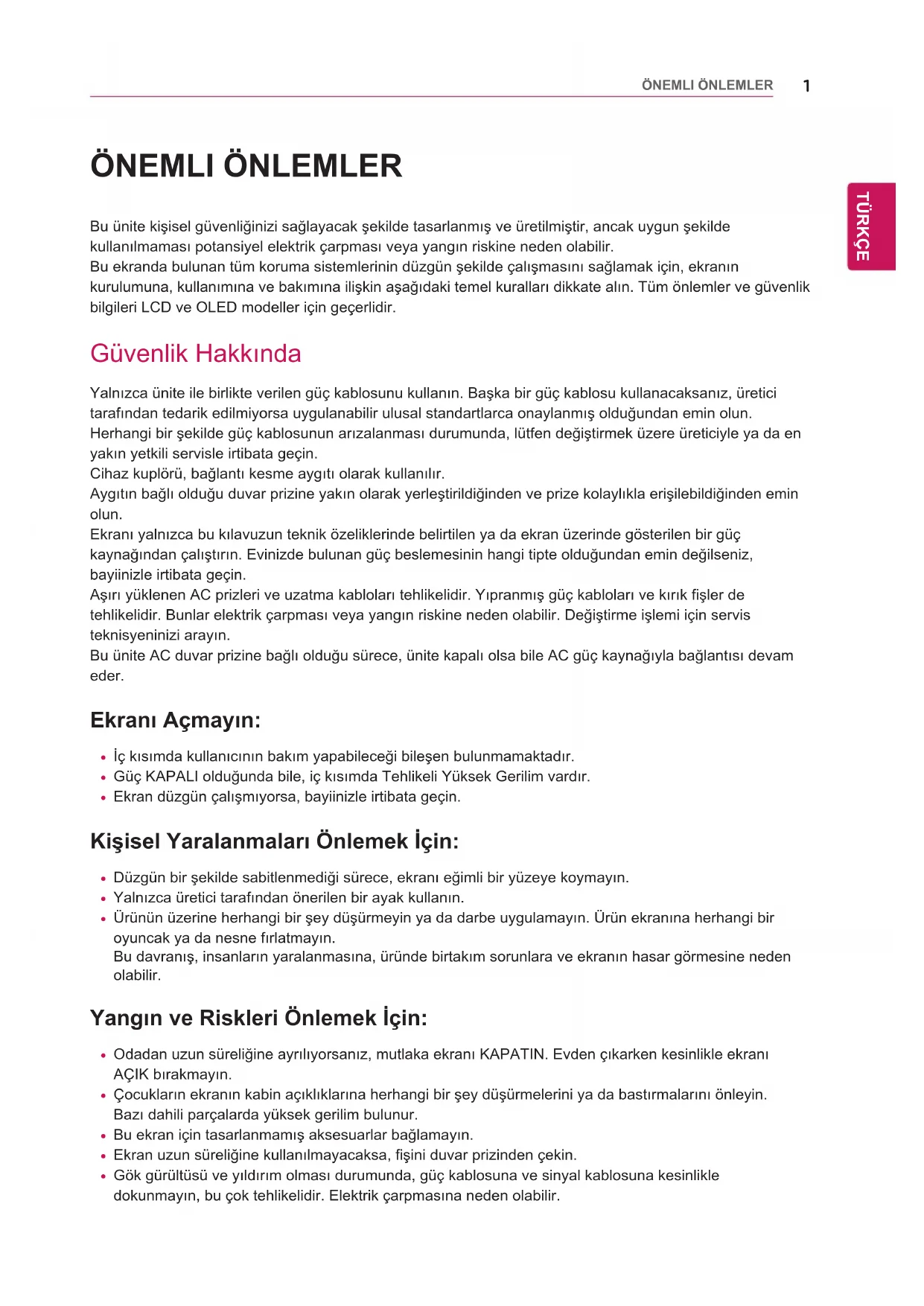 ÖNEMLI ÖNLEMLER Bu ünite kişisel güvenliğinizi sağlayacak şekilde tasarlanmış ve üretilmiştir, ancak uygun şekilde kullanılmaması potansiyel elektrik çarpması veya yangın riskine neden olabilir.Bu ekranda bulunan tüm koruma sistemlerinin düzgün şekilde çalışmasını sağlamak için, ekranın kurulumuna, kullanımına ve bakımına ilişkin aşağıdaki temel kuralları dikkate alın. Tüm önlemler ve güvenlik bilgileri LCD ve OLED modeller için geçerlidir. Güvenlik Hakkında Yalnızca ünite ile birlikte verilen güç kablosunu kullanın. Başka bir güç kablosu kullanacaksanız, üretici tarafından tedarik edilmiyorsa uygulanabilir ulusal standartlarca onaylanmış olduğundan emin olun. Herhangi bir şekilde güç kablosunun arızalanması durumunda, lütfen değiştirmek üzere üreticiyle ya da en yakın yetkili servisle irtibata geçin.Cihaz kuplörü, bağlantı kesme aygıtı olarak kullanılır. Aygıtın bağlı olduğu duvar prizine yakın olarak yerleştirildiğinden ve prize kolaylıkla erişilebildiğinden emin olun.Ekranı yalnızca bu kılavuzun teknik özeliklerinde belirtilen ya da ekran üzerinde gösterilen bir güç kaynağından çalıştırın. Evinizde bulunan güç beslemesinin hangi tipte olduğundan emin değilseniz, bayiinizle irtibata geçin.Aşırı yüklenen AC prizleri ve uzatma kabloları tehlikelidir. Yıpranmış güç kabloları ve kırık fişler de tehlikelidir. Bunlar elektrik çarpması veya yangın riskine neden olabilir. Değiştirme işlemi için servis teknisyeninizi arayın.Bu ünite AC duvar prizine bağlı olduğu sürece, ünite kapalı olsa bile AC güç kaynağıyla bağlantısı devam eder. Ekranı Açmayın: