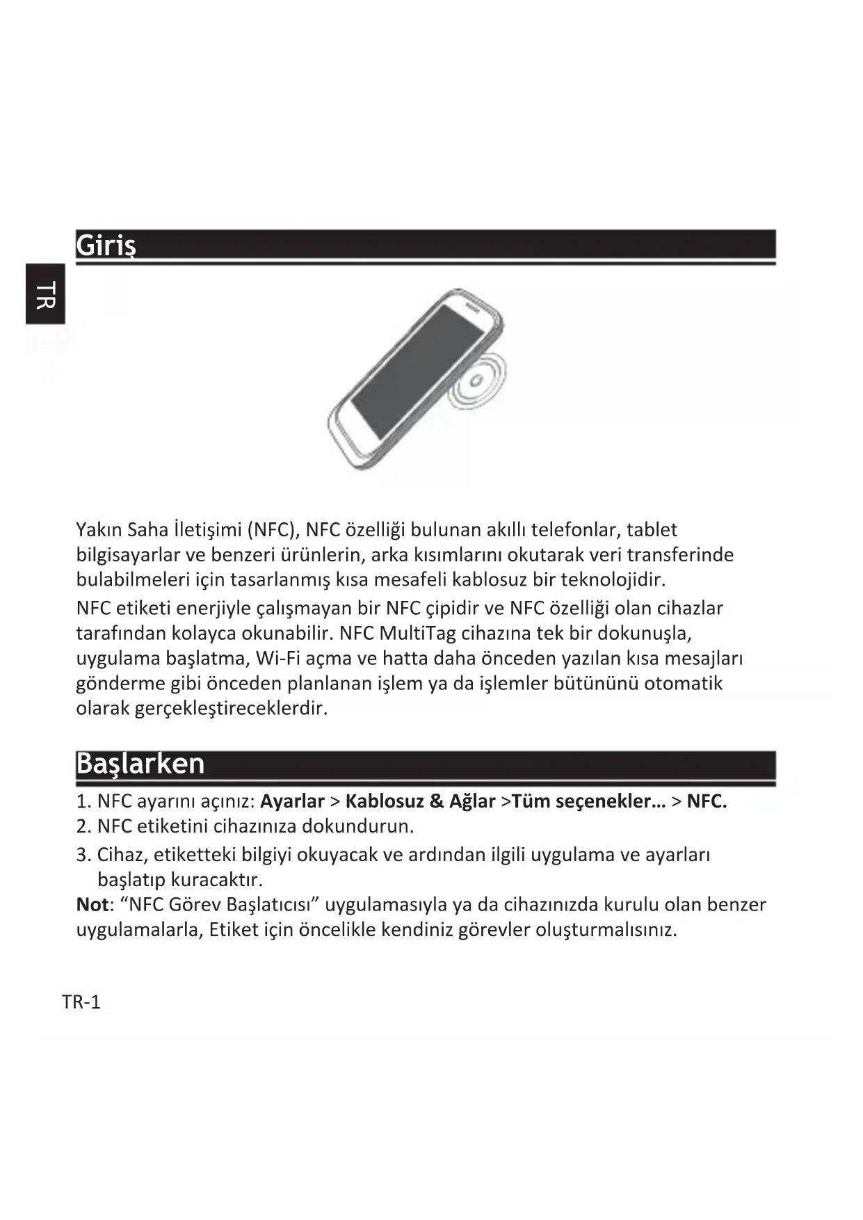Giriş Yakın Saha İletişimi (NFC), NFC özelliği bulunan akıllı telefonlar, tablet bilgisayarlar ve benzeri ürünlerin, arka kısımlarını okutarak veri transferinde bulabilmeleri için tasarlanmış kısa mesafeli kablosuz bir teknolojidir. NFC etiketi enerjiyle çalışmayan bir NFC çipidir ve NFC özelliği olan cihazlar tarafından kolayca okunabilir. NFC MultiTag cihazına tek bir dokunuşla, uygulama başlatma, Wi-Fi açma ve hatta daha önceden yazılan kısa mesajları gönderme gibi önceden planlanan işlem ya da işlemler bütününü otomatik olarak gerçekleştireceklerdir. Başlarken