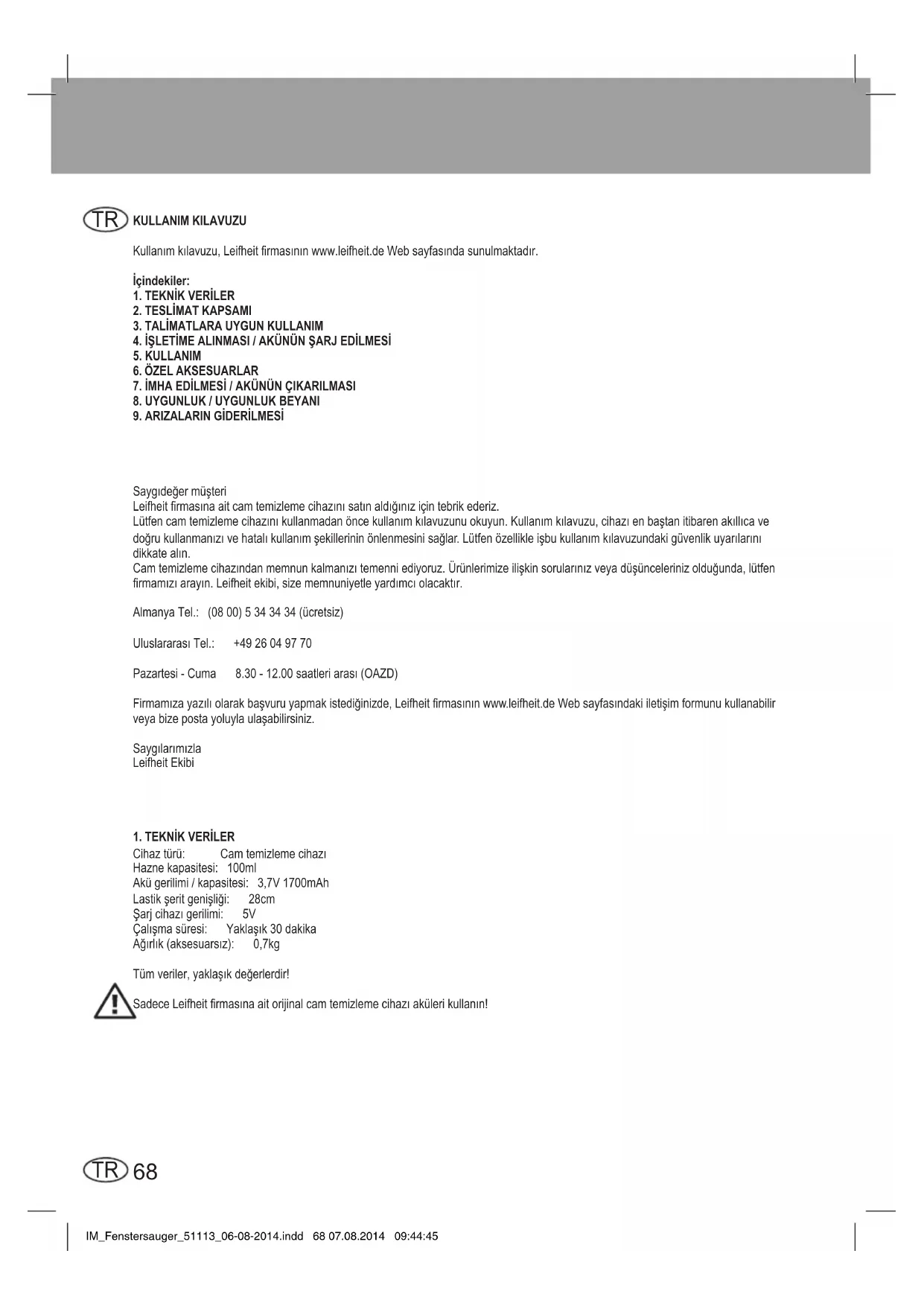 Saygıdeğermüşteri Leifheitrmasınaaitcamtemizlemecihazınısatınaldığınıziçintebrikederiz. Lütfencamtemizlemecihazınıkullanmadanöncekullanımkılavuzunuokuyun.Kullanımkılavuzu,cihazıenbaştanitibarenakıllıcave doğrukullanmanızıvehatalıkullanımşekillerininönlenmesinisağlar.Lütfenözellikleişbukullanımkılavuzundakigüvenlikuyarılarını dikkatealın. Camtemizlemecihazındanmemnunkalmanızıtemenniediyoruz.Ürünlerimizeilişkinsorularınızveyadüşüncelerinizolduğunda,lütfen rmamızıarayın.Leifheitekibi,sizememnuniyetleyardımcıolacaktır. Almanya Tel.: (08 00) 5 34 34 34 (ücretsiz) UluslararasıTel.: +4926049770 Pazartesi-Cuma 8.30-12.00saatleriarası(OAZD) Firmamızayazılıolarakbaşvuruyapmakistediğinizde,Leifheitrmasınınwww.leifheit.deWebsayfasındakiiletişimformunukullanabilir veyabizepostayoluylaulaşabilirsiniz. Saygılarımızla Leifheit Ekibi