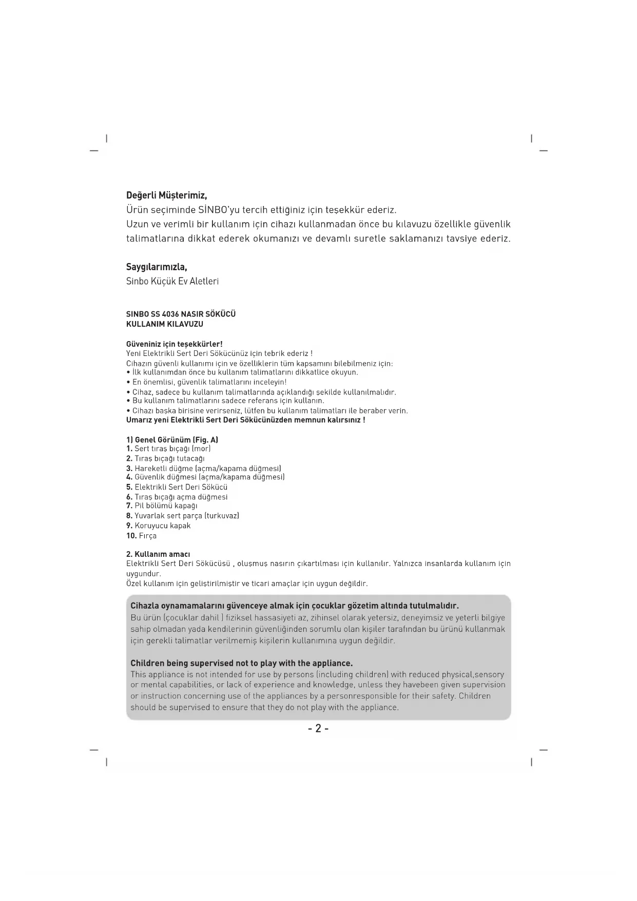 HR- 1 - Slika A /- 2 - De¤erli Müflterimiz, Ürün seçiminde S‹NBO'yu tercih etti¤iniz için teflekkür ederiz. Uzun ve verimli bir kullan›m için cihaz› kullanmadan önce bu k›lavuzu özellikle güvenlik talimatlar›na dikkat ederek okuman›z› ve devaml› suretle saklaman›z› tavsiye ederiz. Sayg›lar›m›zla, Sinbo Küçük Ev Aletleri Cihazla oynamamalarını güvenceye almak için çocuklar gözetim altında tutulmalıdır. Bu ürün (çocuklar dahil ) fiziksel hassasiyeti az, zihinsel olarak yetersiz, deneyimsiz ve yeterli bilgiye sahip olmadan yada kendilerinin güvenli¤inden sorumlu olan kifliler tarafından bu ürünü kullanmak için gerekli talimatlar verilmemifl kiflilerin kullanımına uygun de¤ildir. Children being supervised not to play with the appliance. This appliance is not intended for use by persons (including children) with reduced physical,sensory or mental capabilities, or lack of experience and knowledge, unless they havebeen given supervision or instruction concerning use of the appliances by a personresponsible for their safety. Children should be supervised to ensure that they do not play with the appliance.
