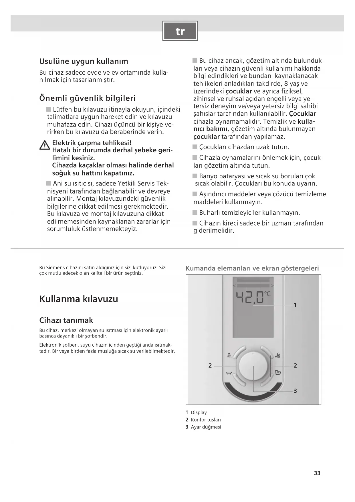 Usulüne uygun kullanım Bu cihaz sadece evde ve ev ortamında kulla- nılmak için tasarlanmıştır. Önemli güvenlik bilgileri ■ Lütfen bu kılavuzu itinayla okuyun, içindeki talimatlara uygun hareket edin ve kılavuzu muhafaza edin. Cihazı üçüncü bir kişiye ve- rirken bu kılavuzu da beraberinde verin. Elektrik çarpma tehlikesi! Hatalı bir durumda derhal şebeke geri- limini kesiniz. Cihazda kaçaklar olması halinde derhal soğuk su hattını kapatınız. ■ Ani su ısıtıcısı, sadece Yetkili Servis Tek- nisyeni tarafından bağlanabilir ve devreye alınabilir. Montaj kılavuzundaki güvenlik bilgilerine dikkat edilmesi gerekmektedir. Bu kılavuza ve montaj kılavuzuna dikkat edilmemesinden kaynaklanan zararlar için sorumluluk üstlenmemekteyiz. ■ Bu cihaz ancak, gözetim altında bulunduk- ları veya cihazın güvenli kullanımı hakkında bilgi edindikleri ve bundan kaynaklanacak tehlikeleri anladıkları takdirde, 8 yaş ve üzerindeki çocuklar ve ayrıca fiziksel, zihinsel ve ruhsal açıdan engelli veya ye- tersiz deneyim ve/veya yetersiz bilgi sahibi şahıslar tarafından kullanılabilir. Çocuklar cihazla oynamamalıdır. Temizlik ve kulla- nıcı bakımı, gözetim altında bulunmayan çocuklar tarafından yapılamaz. ■ Çocukları cihazdan uzak tutun. ■ Cihazla oynamalarını önlemek için, çocuk- ları gözetim altında tutun. ■ Banyo bataryası ve sıcak su boruları çok sıcak olabilir. Çocukları bu konuda uyarın. ■ Aşındırıcı maddeler veya çözücü temizleme maddeleri kullanmayın. ■ Buharlı temizleyiciler kullanmayın. ■ Cihazın kireci sadece bir uzman tarafından giderilmelidir. Bu Siemens cihazını satın aldığınız için sizi kutluyoruz. Sizi çok mutlu edecek olan kaliteli bir ürün seçtiniz. Kullanma kılavuzu Cihazı tanımak Bu cihaz, merkezi olmayan su ısıtması için elektronik ayarlı basınca dayanıklı bir şofbendir.Elektronik şofben, suyu cihazın içinden geçtiği anda ısıtmak-tadır. Bir veya birden fazla musluğa sıcak su verilebilmektedir. Kumanda elemanları ve ekran göstergeleri