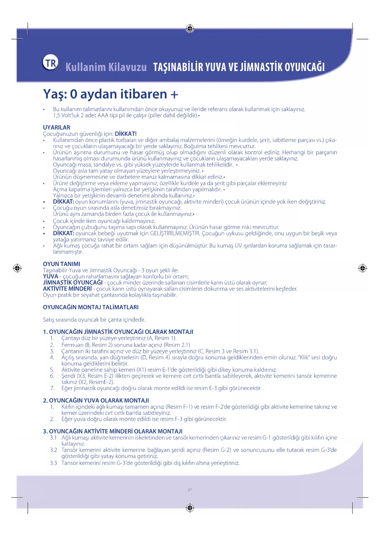 Yaş: 0 aydan itibaren + Bu kullanım talimatlarını kullanımdan önce okuyunuz ve ileride referans olarak kullanmak için saklayınız.• 1,5 Volt’luk 2 adet AAA tipi pil ile çalışır (piller dahil değildir).• UYARILAR Çocuğunuzun güvenliği için: DİKKAT! Kullanımdan önce plastik torbaları ve diğer ambalaj malzemelerini (örneğin kurdele, şerit, sabitleme parçası vs.) çıka-• rınız ve çocukların ulaşamayacağı bir yerde saklayınız. Boğulma tehlikesi mevcuttur. Ürünün aşınma durumunu ve hasar görmüş olup olmadığını düzenli olarak kontrol ediniz. Herhangi bir parçanın • hasarlanmış olması durumunda ürünü kullanmayınız ve çocukların ulaşamayacakları yerde saklayınız. Oyuncağı masa, sandalye vs. gibi yüksek yüzeylerde kullanmak tehlikelidir. • Oyuncağı asla tam yatay olmayan yüzeylere yerleştirmeyiniz. • Ürünün düşmemesine ve darbelere maruz kalmamasına dikkat ediniz.• Ürüne değiştirme veya ekleme yapmayınız, özellikle kurdele ya da şerit gibi parçalar eklemeyiniz • Açma kapatma işlemleri yalnızca bir yetişkinin tarafından yapılmalıdır. • Yalnızca bir yetişkinin devamlı denetimi altında kullanınız.• DİKKAT: • oyun konumlarını (yuva, jimnastik oyuncağı, aktivite minderi) çocuk ürünün içinde yok iken değiştiriniz. Çocuğu oyun sırasında asla denetimsiz bırakmayınız.• Ürünü aynı zamanda birden fazla çocuk ile kullanmayınız.• Çocuk içinde iken oyuncağı kaldırmayınız. • Oyuncağın çubuğunu taşıma sapı olarak kullanmayınız. Ürünün hasar görme riski mevcuttur.• DİKKAT: • oyuncak bebeği uyutmak için GELİŞTİRİLMEMİŞTİR. Çocuğun uykusu geldiğinde, onu uygun bir beşik veya yatağa yatırmanız tavsiye edilir. Ağlı kumaş çocuğa rahat bir ortam sağlam için düşünülmüştür. Bu kumaş UV ışınlardan koruma sağlamak için tasar-• lanmamıştır. OYUN TANIMI Taşınabilir Yuva ve Jimnastik Oyuncağı - 3 oyun şekli ile: YUVA - çocuğun rahatlamasını sağlayan konforlu bir ortam; JİMNASTİK OYUNCAĞI - çocuk minder üzerinde sallanan cisimlerle karın üstü olarak oynar; AKTİVİTE MİNDERİ - çocuk karın üstü oynayarak sallan cisimlerin dokunma ve ses aktivitelerini keşfeder. Oyun pratik bir seyahat çantasında kolaylıkla taşınabilir.
