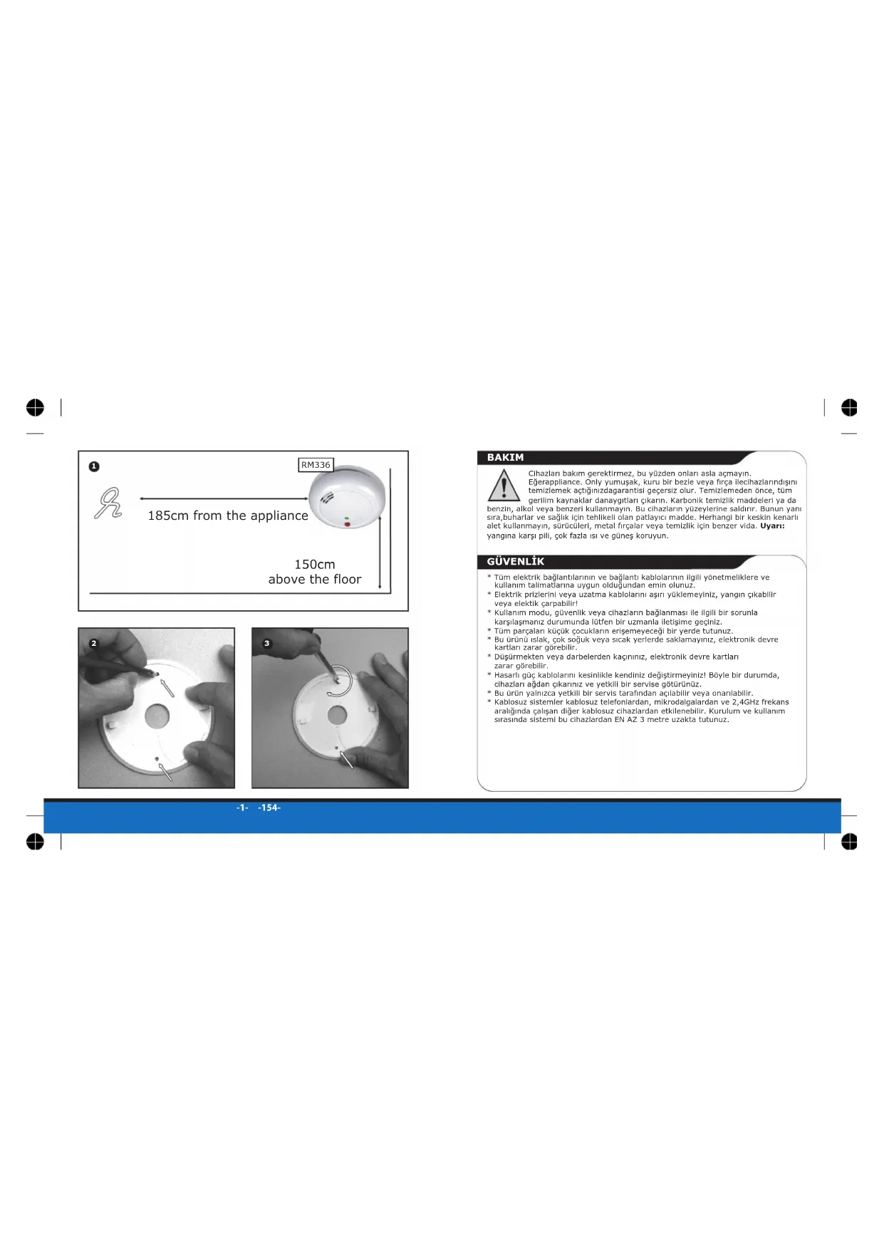 -12--143- RM336 karbon monoksit alarmını satın aldığınız için teşekkür ederiz. Lütfen, kullanım kılavuzunu iyice okumaya ve çalışması ile ilgili kendinizin ve ailenizin cihazı tanımasına birkaç dakikanızı ayırın. Ve ileride başvurmak için saklayın. Uyarı: Alarm yetkili bir kişi tarafından kurulmalıdır Kurulum Yeri Kurulum yerlerini seçerken, tüm uyku alanlarında alarmın duyulduğundan emin olun. Evinizde tek bir karbon monoksit alarmı kurarsanız, alarmı bodrum ya da kilerde değil, yatak odalarına yakın kurun. Dikkat Bu alarm tavana veya duvara monte edilmelidir. Montaj adımı Lütfen krokiye bakın: resim 2 1 Alarm braketinin iki deliğine göre, duvara doğru konumu işaretleyin. 2 Tavan veya duvara iki adet ф5,0mm delik delin, daha sonra deliklerin içine iki plastik dübel yerleştirin. 3 Braketi plastik dübellere takın ve vidaları plastik dübellere sıkıca sabitleyin. KURULUM TALIMATLARı