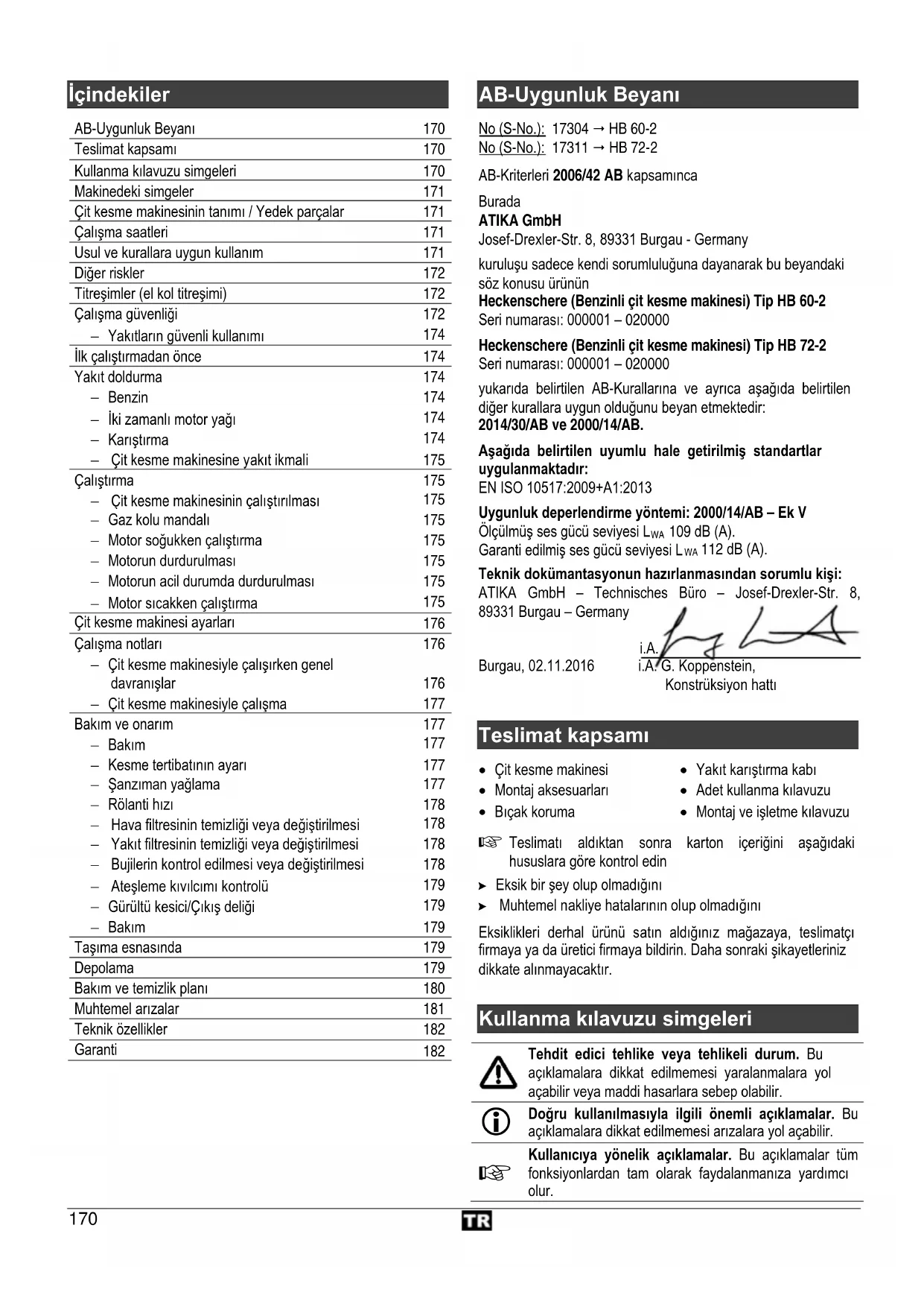 AB-Uygunluk Beyanı No (S-No.): 17304 HB 60-2 No (S-No.): 17311 HB 72-2 AB-Kriterleri 2006/42 AB kapsamınca Burada ATIKA GmbH Josef-Drexler-Str. 8, 89331 Burgau - Germany kuruluşu sadece kendi sorumluluğuna dayanarak bu beyandaki söz konusu ürünün Heckenschere (Benzinli çit kesme makinesi) Tip HB 60-2 Seri numarası: 000001 – 020000 Heckenschere (Benzinli çit kesme makinesi) Tip HB 72-2 Seri numarası: 000001 – 020000 yukarıda belirtilen AB-Kurallarına ve ayrıca aşağıda belirtilen diğer kurallara uygun olduğunu beyan etmektedir: 2014/30/AB ve 2000/14/AB. Aşağıda belirtilen uyumlu hale getirilmiş standartlar uygulanmaktadır: