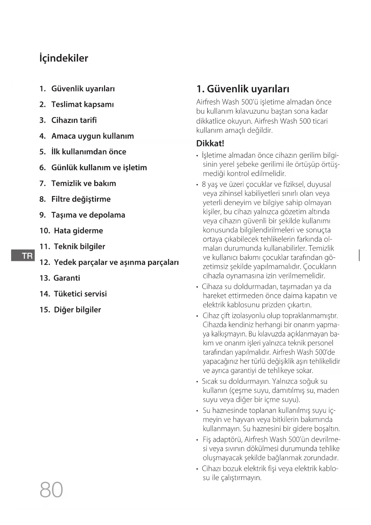 ya kalkışmayın. Bu kılavuzda açıklanmayan ba- kım ve onarım işleri yalnızca teknik personel tarafından yapılmalıdır. Airfresh Wash 500’de yapacağınız her türlü değişiklik aşırı tehlikelidir ve ayrıca garantiyi de tehlikeye sokar.