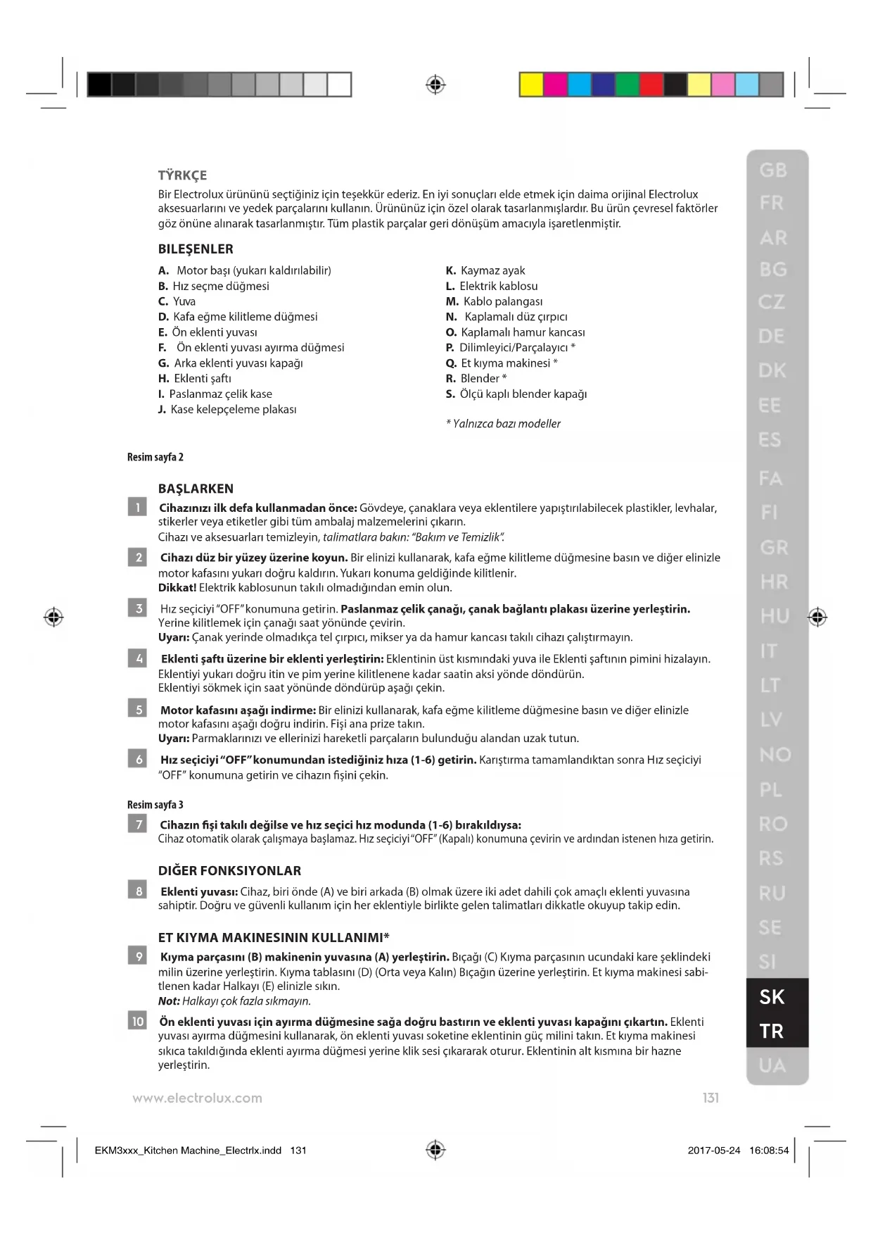- Bu cihaz, yalnızca ev kullanımı amacıyla tasarlanmıştır. Üretici, uygun olmayan veya hatalı kullanımdan kaynaklanan hasarlar açısından herhangi bir sorumluluk kabul etmez. EKM3xxx_Kitchen Machine_Electrlx.indd 133 2017-05-24 16:08:55134 www.electrolux.com