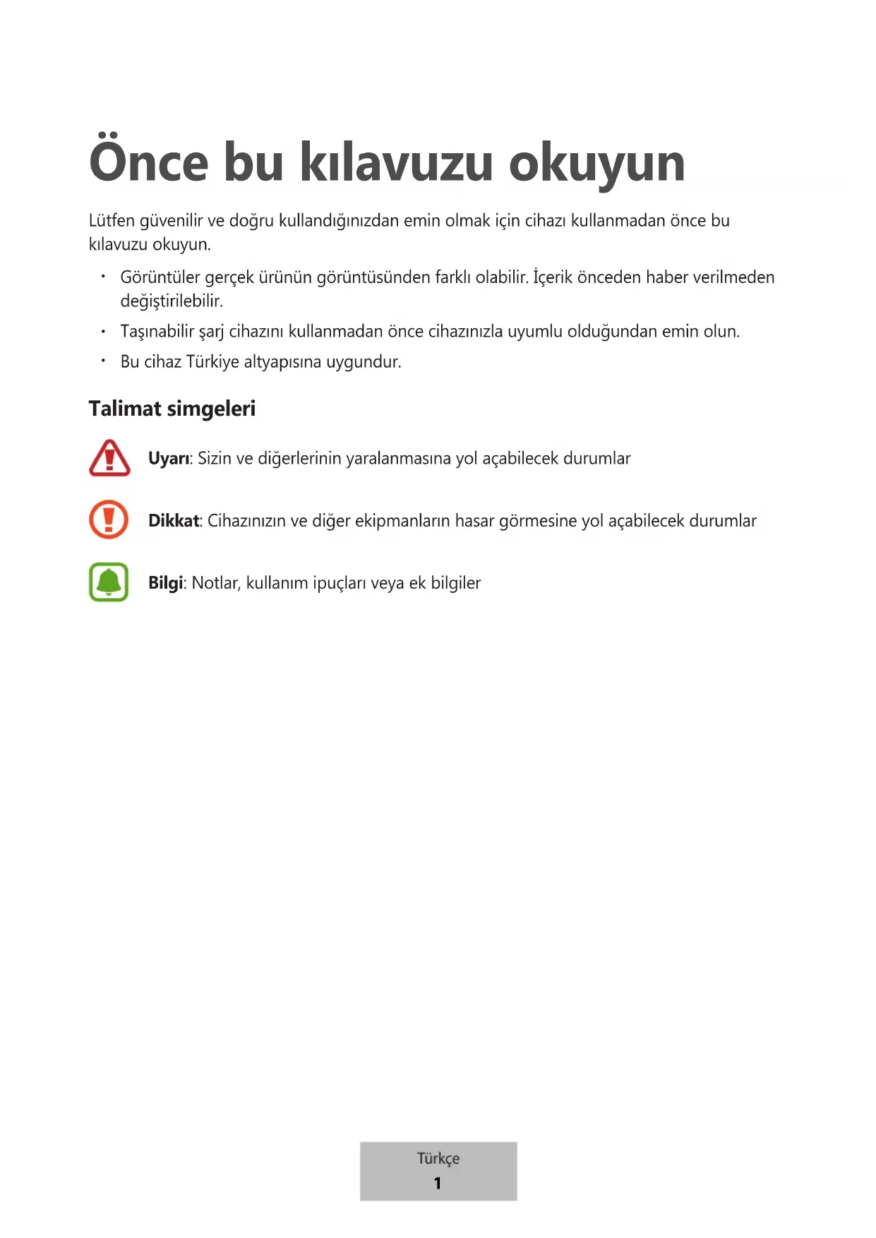 Bu cihaz Türkiye altyapısına uygundur. Talimat simgeleri Uyarı: Sizin ve diğerlerinin yaralanmasına yol açabilecek durumlar Dikkat: Cihazınızın ve diğer ekipmanların hasar görmesine yol açabilecek durumlar Bilgi: Notlar, kullanım ipuçları veya ek bilgiler Türkçe