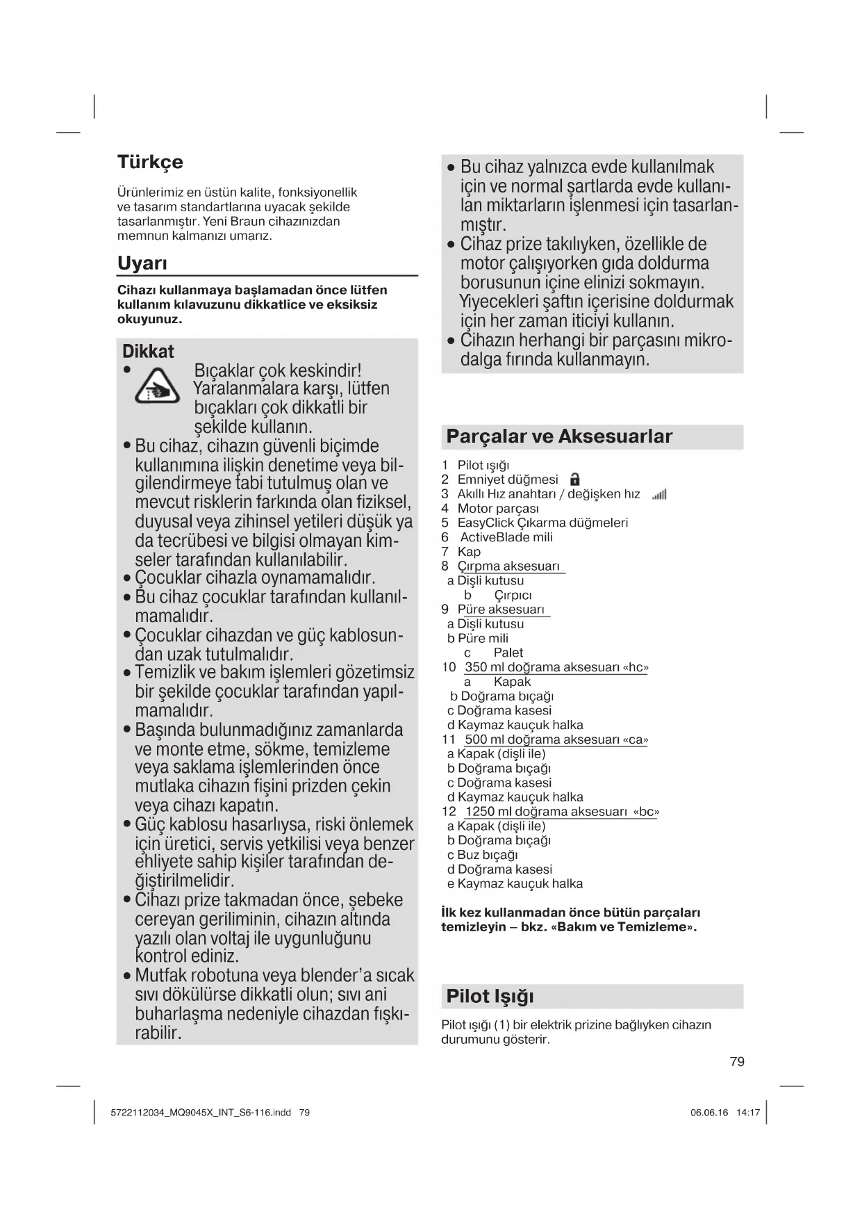 Cihazın herhangi bir parçasını mikro- dalga fırında kullanmayın. Parçalar ve Aksesuarlar 1 Pilot ışığı 2 Emniyet düğmesi 3 Akıllı Hız anahtarı / değişken hız 4 Motor parçası 5 EasyClick Çıkarma düğmeleri 6 ActiveBlade mili 7 Kap 8 Çırpma aksesuarı a Dişli kutusu b Çırpıcı 9 Püre aksesuarı a Dişli kutusu b Püre mili c Palet 10 350 ml doğrama aksesuarı «hc» a Kapak b Doğrama bıçağı c Doğrama kasesi d Kaymaz kauçuk halka 11 500 ml doğrama aksesuarı «ca» a Kapak (dişli ile) b Doğrama bıçağı c Doğrama kasesi d Kaymaz kauçuk halka 12 1250 ml doğrama aksesuarı «bc» a Kapak (dişli ile) b Doğrama bıçağı c Buz bıçağı d Doğrama kasesi e Kaymaz kauçuk halka İlk kez kullanmadan önce bütün parçaları temizleyin – bkz. «Bakım ve Temizleme». Pilot Işığı Pilot ışığı (1) bir elektrik prizine bağlıyken cihazın durumunu gösterir. 5722112034_MQ9045X_INT_S6-116.indd 795722112034_MQ9045X_INT_S6-116.indd 79 06.06.16 14:1706.06.16 14:1780 Pilot ışığı Cihaz / Çalışma durumu Yanıp sönen kırmızı Cihaz kullanıma hazır Sabit yeşil Cihaz serbest (anahtar bırakma düğmesine basılı) ve çalıştırılabilir. Sabit kırmızı Aşırı ısınma erken uyarısı. Motor durana kadar kademeli olarak yavaşlar. Cihazın soğumasını bekleyin. Pilot ışığı kırmızı yanıp söndüğünde yeniden kullanılmaya hazırdır. Maksimum hız, fazla yüke ve uzun çalışma süresine bağlı olarak azalırsa hazırlığınızı bitirebilirsiniz ancak daha sonra cihazı soğumaya bırakmanız gerekir. Cihazın Kullanılması Değişken Hızlar için Akıllı Hız Anahtarı Tüm hızlar için bir kere basmak yeter. Ne kadar basarsanız, hız o kadar yükselir. Hız ne kadar yüksek olursa, karıştırma ve doğrama sonuçları o kadar hızlı ve ince olur. Tek el ile çalıştırma: Akıllı Hız anahtarı (3) cihazı tek elinizle çalıştırmanızı ve hızı tek elinizle kontrol etmenizi sağlar. El Mikserinin Çalıştırılması İlk kullanım: Taşıma kilidini kırmızı şeritten çekerek motor parçasından (4) sökün. Çalıştırma (A) Cihaz, Akıllı Hız anahtarının bırakılmasını sağlayan bir emniyet düğmesine sahiptir. Bunu emniyetli bir şekilde açmak için aşağıdaki hususlara uyun: