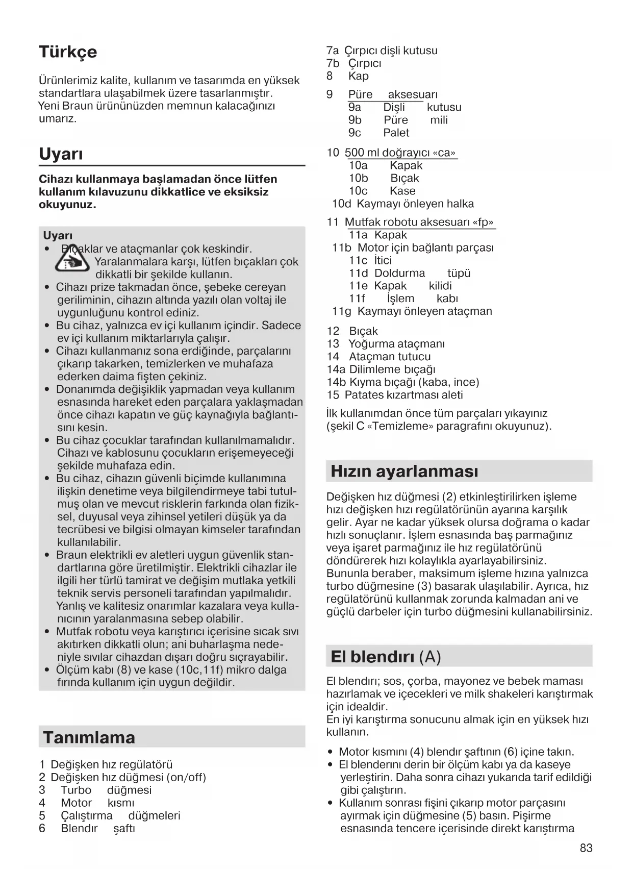 - Ölçüm kabı (8) ve kase (10c,11f) mikro dalga fırında kullanım için uygun değildir. Tanımlama 1 Değişken hız regülatörü 2 Değişken hız düğmesi (on/off) 3 Turbo düğmesi 4 Motor kısmı 5 Çalıştırma düğmeleri 6 Blendır şaftı 7a Çırpıcı dişli kutusu 7b Çırpıcı 8 Kap 9 Püre aksesuarı 9a Dişli kutusu 9b Püre mili 9c Palet 10 500 ml doğrayıcı «ca» 10a Kapak 10b Bıçak 10c Kase 10d Kaymayı önleyen halka 11 Mutfak robotu aksesuarı «fp» 11a Kapak 11b Motor için bağlantı parçası 11c İtici 11d Doldurma tüpü 11e Kapak kilidi 11f İşlem kabı 11g Kaymayı önleyen ataçman 12 Bıçak 13 Yoğurma ataçmanı 14 Ataçman tutucu 14a Dilimleme bıçağı 14b Kıyma bıçağı (kaba, ince) 15 Patates kızartması aleti İlk kullanımdan önce tüm parçaları yıkayınız (şekil C «Temizleme» paragrafını okuyunuz). Hızın ayarlanması Değişken hız düğmesi (2) etkinleştirilirken işleme hızı değişken hızı regülatörünün ayarına karşılık gelir. Ayar ne kadar yüksek olursa doğrama o kadar hızlı sonuçlanır. İşlem esnasında baş parmağınız veya işaret parmağınız ile hız regülatörünü döndürerek hızı kolaylıkla ayarlayabilirsiniz. Bununla beraber, maksimum işleme hızına yalnızca turbo düğmesine (3) basarak ulaşılabilir. Ayrıca, hız regülatörünü kullanmak zorunda kalmadan ani ve güçlü darbeler için turbo düğmesini kullanabilirsiniz. El blendırı (A) El blendırı; sos, çorba, mayonez ve bebek maması hazırlamak ve içecekleri ve milk shakeleri karıştırmak için idealdir. En iyi karıştırma sonucunu almak için en yüksek hızı kullanın.