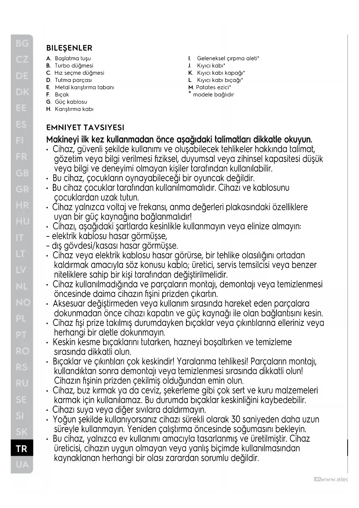 BILEŞENLER A. Başlatma tuşu B. Turbo düğmesi C. Hız seçme düğmesi D. Tutma parçası E. Metal karıştırma tabanı F. Bıçak G. Güç kablosu H. Karıştırma kabı