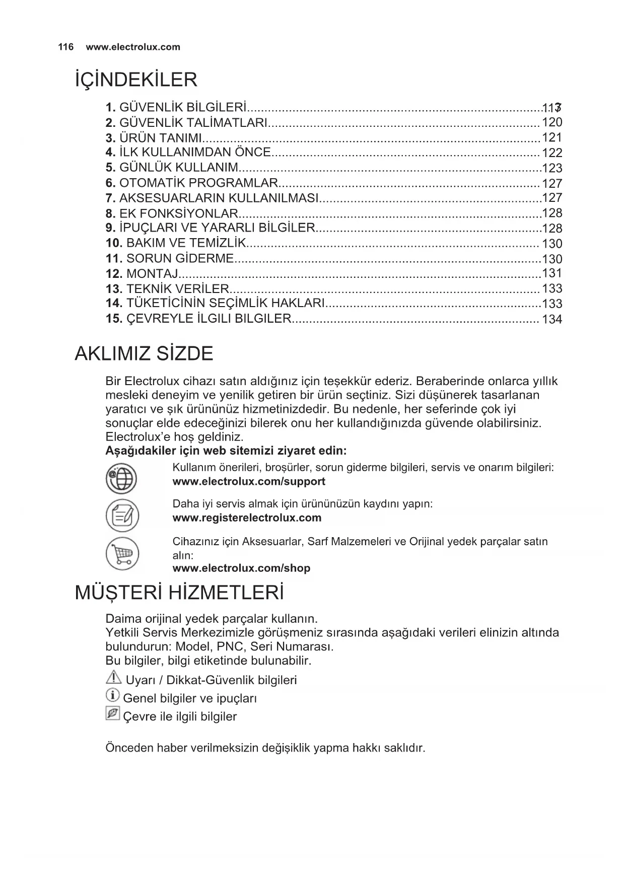 Daima orijinal yedek parçalar kullanın. Yetkili Servis Merkezimizle görüşmeniz sırasında aşağıdaki verileri elinizin altında bulundurun: Model, PNC, Seri Numarası. Bu bilgiler, bilgi etiketinde bulunabilir. Uyarı / Dikkat-Güvenlik bilgileri Genel bilgiler ve ipuçları Çevre ile ilgili bilgiler Önceden haber verilmeksizin değişiklik yapma hakkı saklıdır. www.electrolux.com2