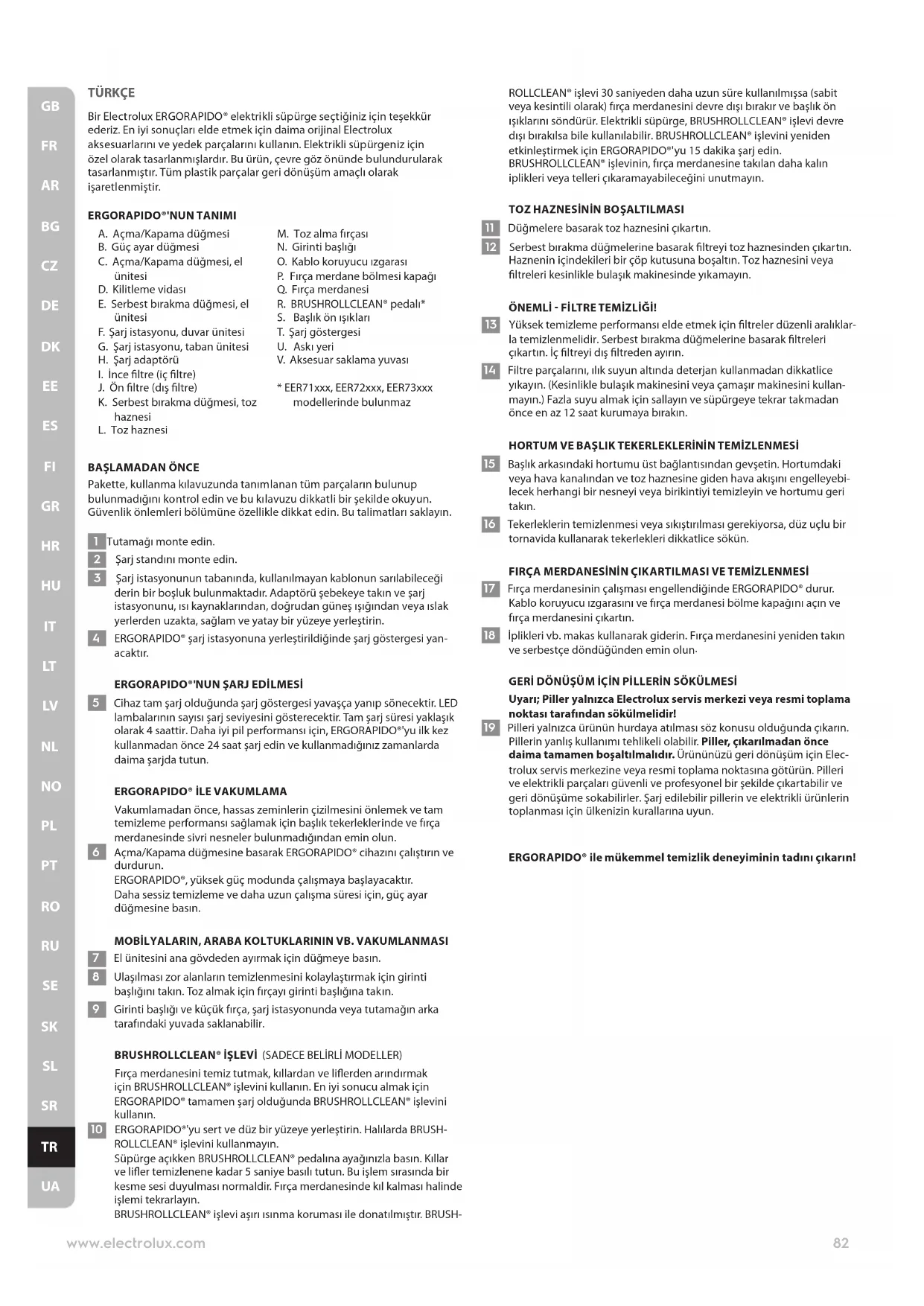 GERİ DÖNÜŞÜM İÇİN PİLLERİN SÖKÜLMESİ Uyarı; Piller yalnızca Electrolux servis merkezi veya resmi toplama noktası tarafından sökülmelidir! 19 Pilleri yalnızca ürünün hurdaya atılması söz konusu olduğunda çıkarın. Pillerin yanlış kullanımı tehlikeli olabilir. Piller, çıkarılmadan önce daima tamamen boşaltılmalıdır. Ürününüzü geri dönüşüm için Elec- trolux servis merkezine veya resmi toplama noktasına götürün. Pilleri ve elektrikli parçaları güvenli ve profesyonel bir şekilde çıkartabilir ve geri dönüşüme sokabilirler. Şarj edilebilir pillerin ve elektrikli ürünlerin toplanması için ülkenizin kurallarına uyun. ERGORAPIDO® ile mükemmel temizlik deneyiminin tadını çıkarın! 82www.electrolux.com