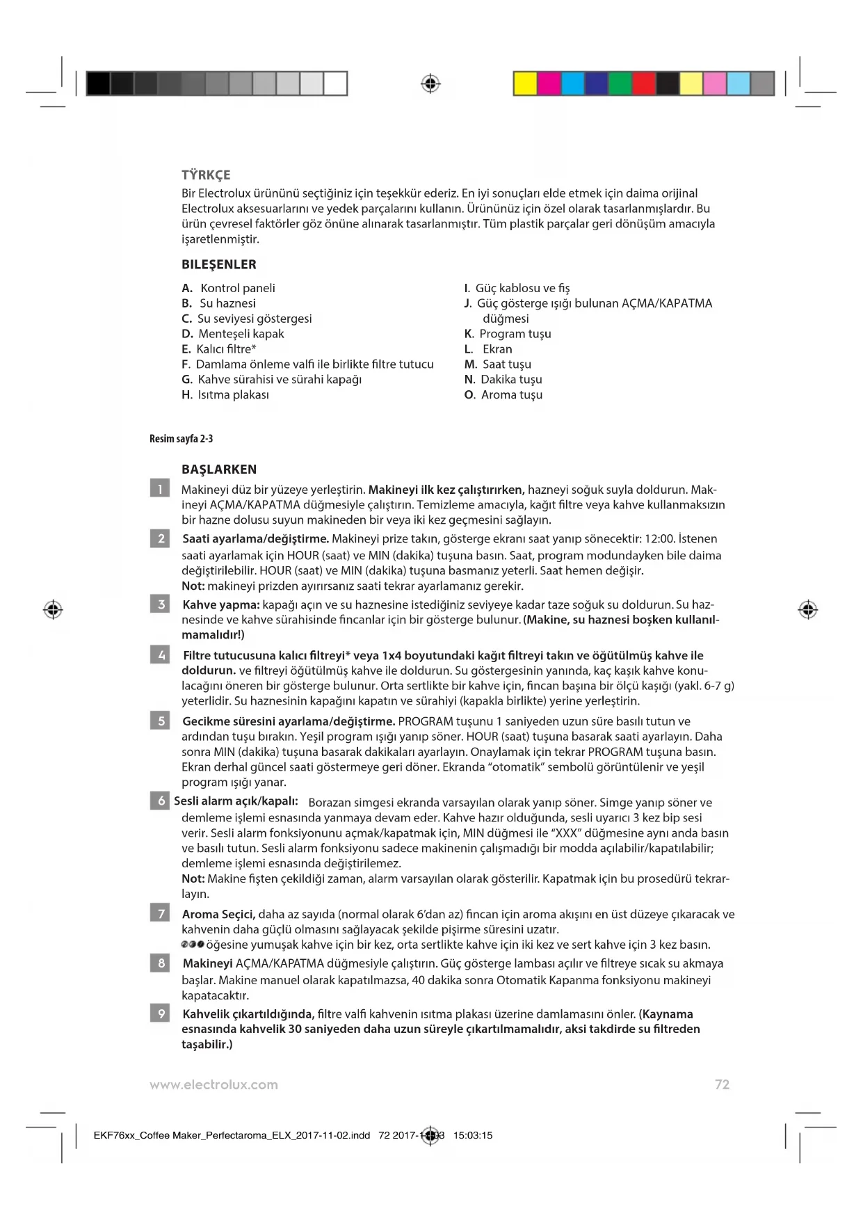 - Cihazı suya veya herhangi bir sıvıya daldırmayın! EKF76xx_Coffee Maker_Perfectaroma_ELX_2017-11-02.indd 73 2017-11-03 15:03:1574 www.electrolux.com