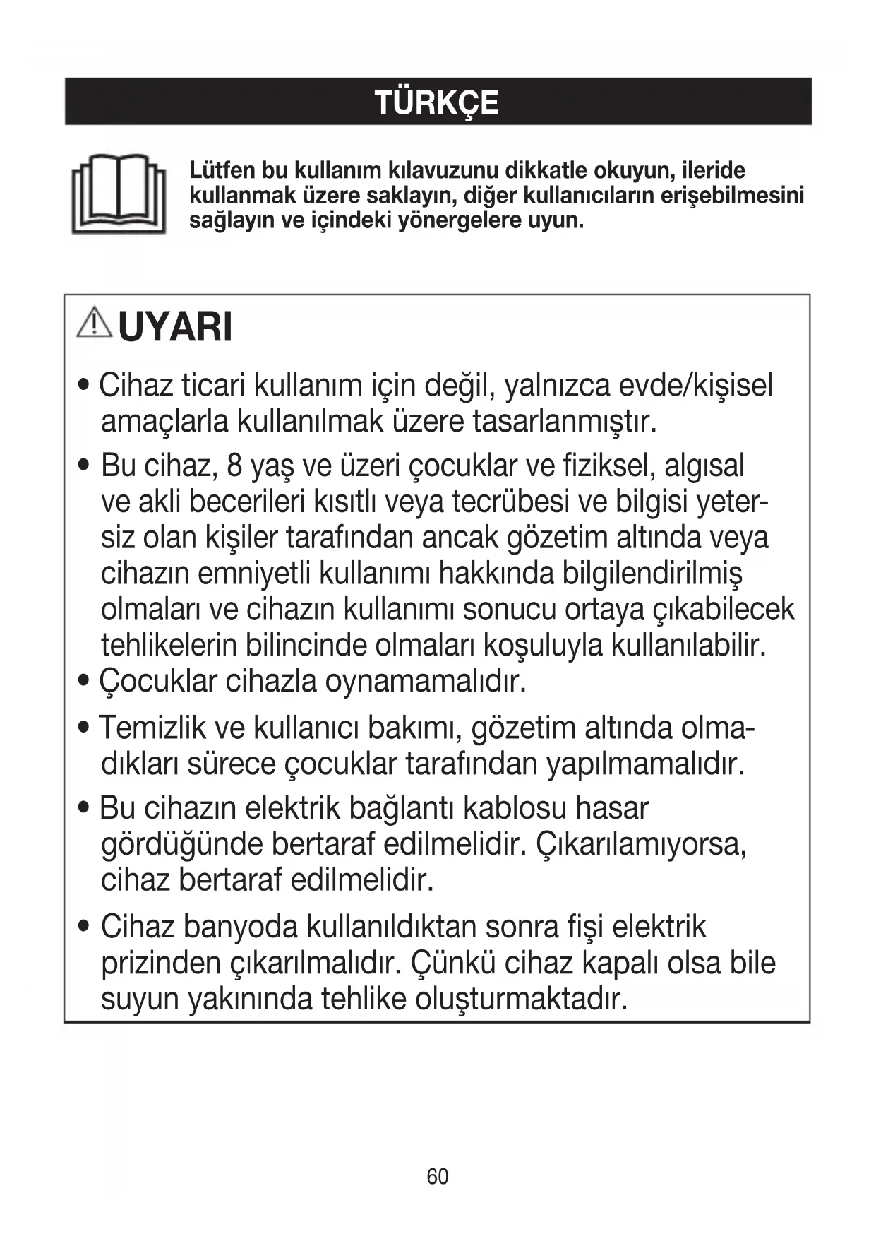 Cihaziışı zaman sehlike olusturabileşigi küvet, lavabo, duş ve benzeri su ya da sivi iceren yerlerde kullanmayın. - Elektrik carpma sehlikesi. - Cihazın ileçini kesinlikle açmayın veya onarmaya calısmayın, aksi halde kusursuz calısması garantı edilemez. Bu husus;dikkate alınmadışı takdirde garanti geleçerliliğinci yitirir.