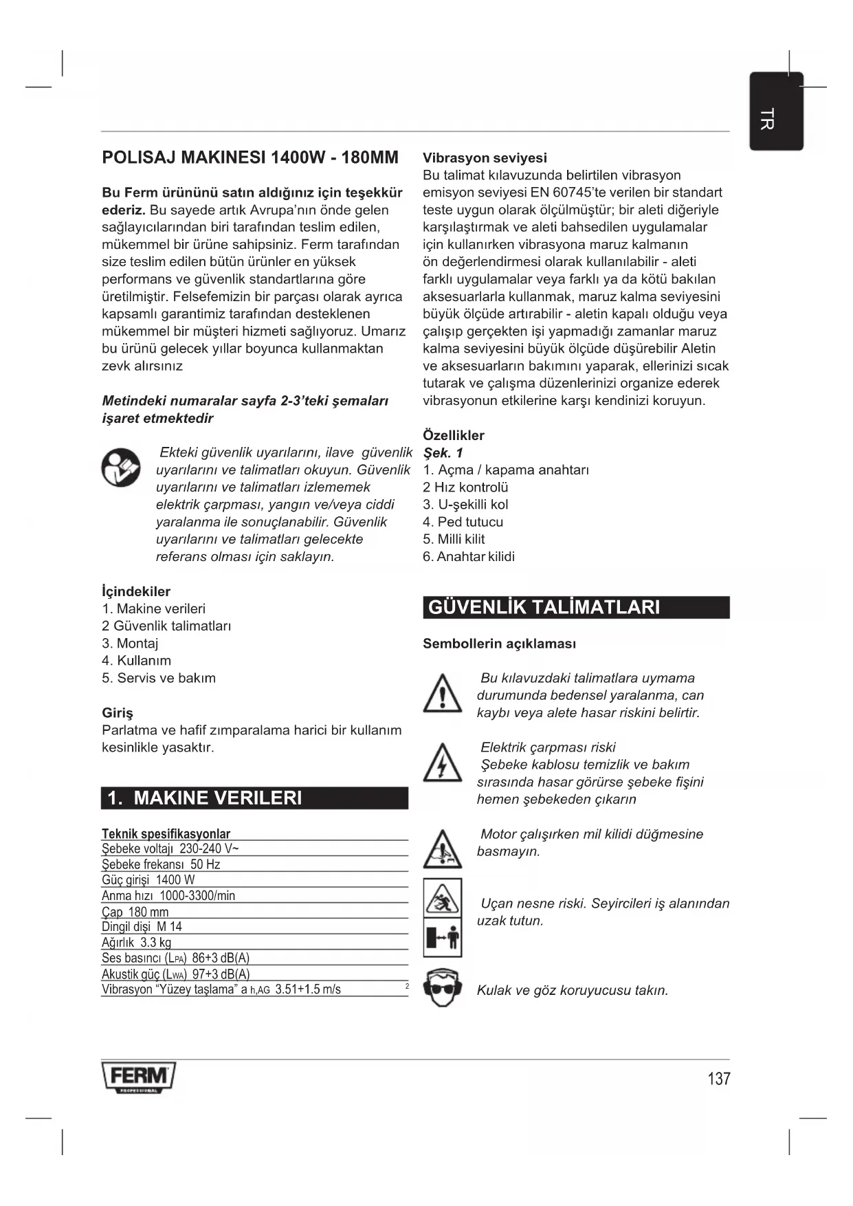 Elektrikl makinerleri kullanirken yangin, elektrik carpmasi ve bedensel yaralanma riskini azaltmak icin ükenizde geleerli güvenlik duzenlemelerine her zaman uyun. Asağidaki güvenlik talimatarlı neve ayrıca ekteki güvenlik talimatarlı okuyun.