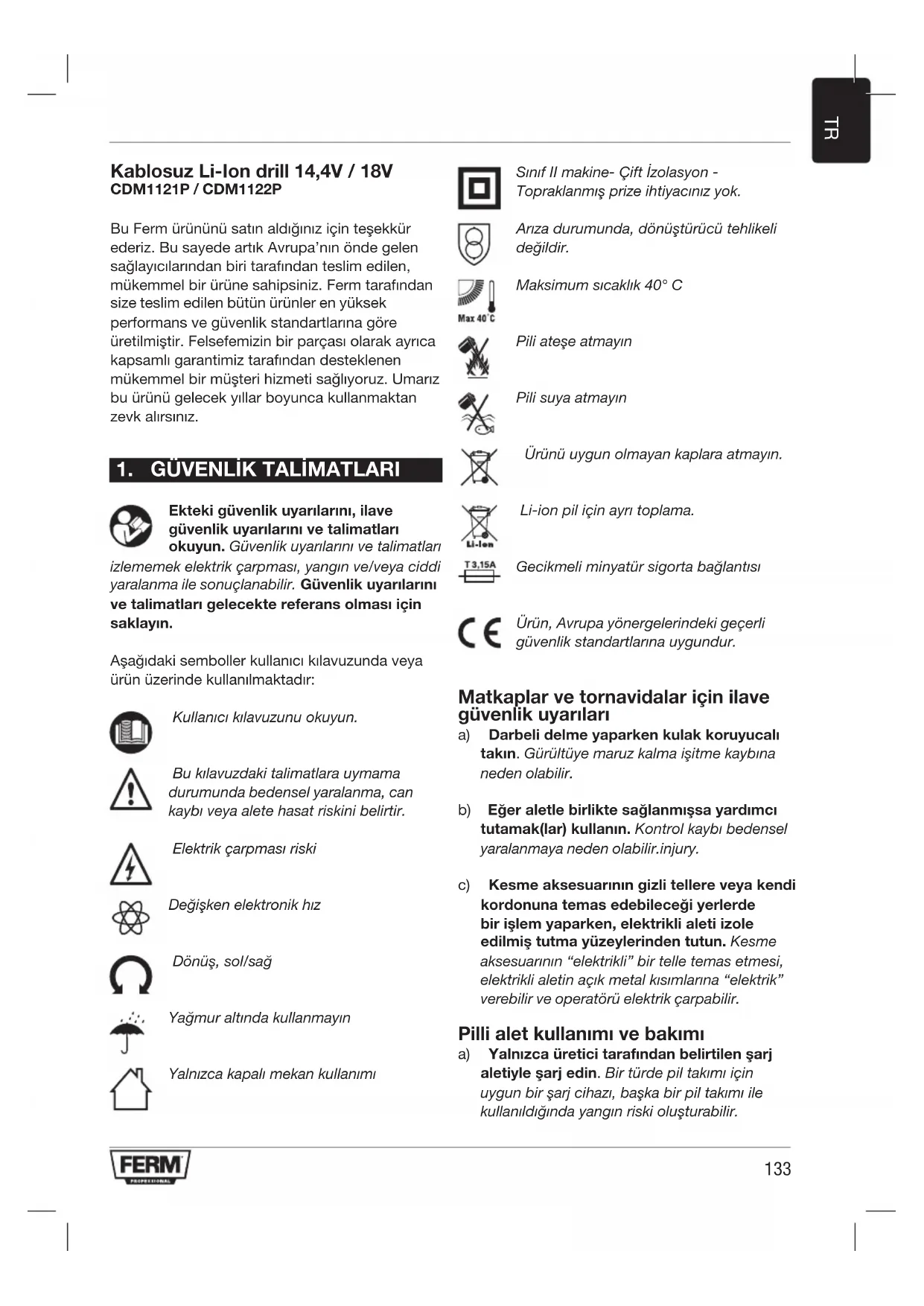 Ekteki güvenlik uyarılarını, ilave güvenlik uyarılarını ve talimatları okuyun. Güvenlik uyarılarını ve talimatları izlememek elektrik çarpması, yangın ve/veya ciddi yaralanma ile sonuçlanabilir. Güvenlik uyarılarını ve talimatları gelecekte referans olması için saklayın. Aşağıdaki semboller kullanıcı kılavuzunda veya ürün üzerinde kullanılmaktadır: Kullanıcı kılavuzunu okuyun. Bu kılavuzdaki talimatlara uymama durumunda bedensel yaralanma, can kaybı veya alete hasat riskini belirtir. Elektrik çarpması riski Değişken elektronik hız Dönüş, sol/sağ Yağmur altında kullanmayın Yalnızca kapalı mekan kullanımı Sınıf II makine- Çift İzolasyon - Topraklanmış prize ihtiyacınız yok. Arıza durumunda, dönüştürücü tehlikeli değildir. Maksimum sıcaklık 40° C Pili ateşe atmayın Pili suya atmayın Ürünü uygun olmayan kaplara atmayın. Li-ion pil için ayrı toplama. Gecikmeli minyatür sigorta bağlantısı Ürün, Avrupa yönergelerindeki geçerli güvenlik standartlarına uygundur. Matkaplar ve tornavidalar için ilave güvenlik uyarıları a) Darbeli delme yaparken kulak koruyucalı takın. Gürültüye maruz kalma işitme kaybına neden olabilir. b) Eğer aletle birlikte sağlanmışsa yardımcı tutamak(lar) kullanın. Kontrol kaybı bedensel yaralanmaya neden olabilir.injury. c) Kesme aksesuarının gizli tellere veya kendi kordonuna temas edebileceği yerlerde bir işlem yaparken, elektrikli aleti izole edilmiş tutma yüzeylerinden tutun. Kesme aksesuarının “elektrikli” bir telle temas etmesi, elektrikli aletin açık metal kısımlarına “elektrik” verebilir ve operatörü elektrik çarpabilir. Pilli alet kullanımı ve bakımı a) Yalnızca üretici tarafından belirtilen şarj aletiyle şarj edin. Bir türde pil takımı için uygun bir şarj cihazı, başka bir pil takımı ile kullanıldığında yangın riski oluşturabilir.134