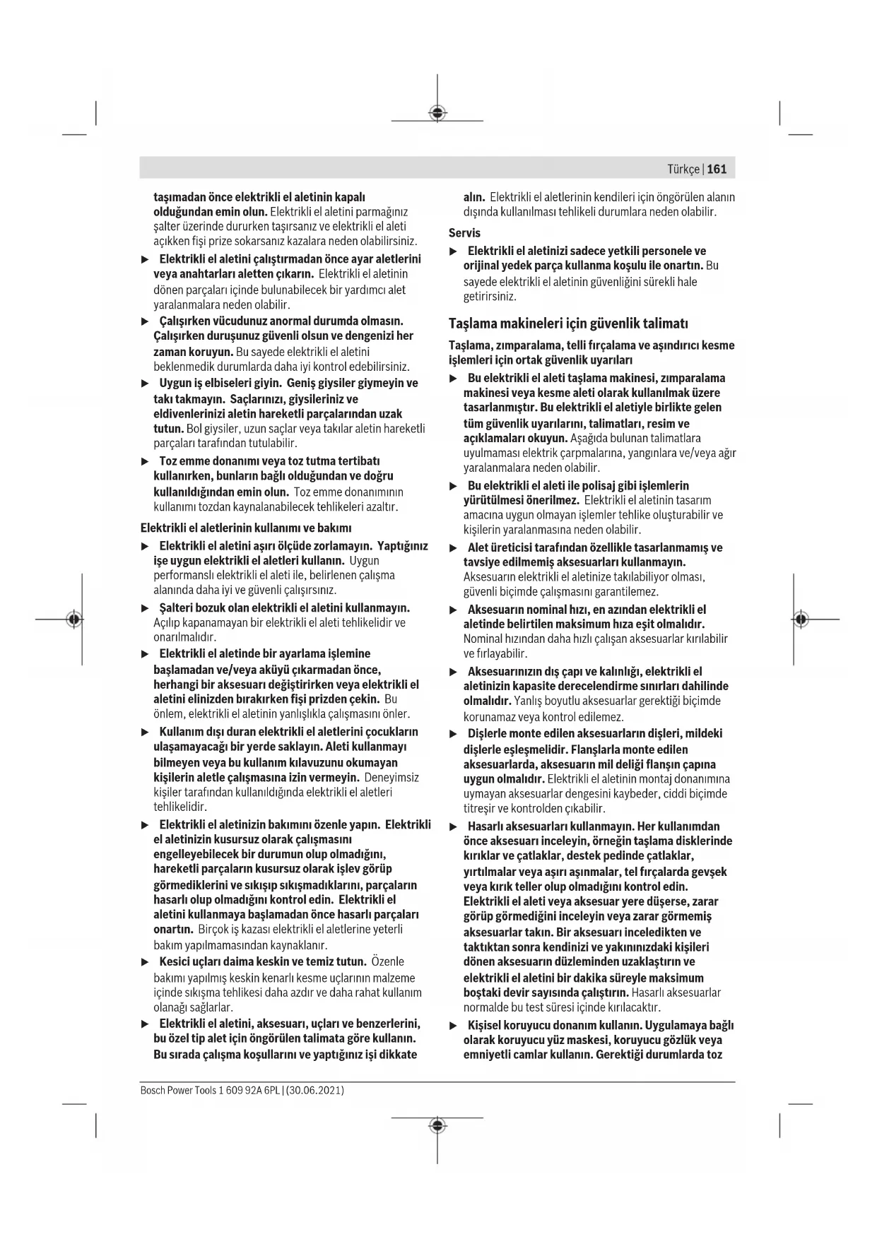 1,5 Bu talimatta belirtilen titreşim seviyesi normlandırılmış bir ölçme yöntemi ile ölçülmüştür ve elektrikli el aletlerinin karşılaştırılmasında kullanılabilir. Bu değer geçici olarak titreşim seviyesinin tahmin edilmesine uygundur. Belirtilen titreşim seviyesi elektrikli el aletinin temel kullanım alanlarını temsil eder. Ancak elektrikli el aleti başka kullanım alanlarında kullanılırken, farklı uçlarla kullanılırken veya yetersiz bakımla kullanılırken, titreşim seviyesi belirtilen değerden farklı olabilir. Bu da kullanıcıya binen titreşim yükünü bütün bir çalışma süresinde belirgin ölçüde yükseltebilir. Titreşim yükünü tam olarak tahmin edebilmek için aletin kapalı olduğu veya çalıştığı halde kullanılmadığı süreler de dikkate alınmalıdır. Bu, toplam çalışma süresi içindeki titreşim yükünü önemli ölçüde azaltabilir. Titreşimin kullanıcıya bindirdiği yük için önceden ek güvenlik önlemleri alın. Örneğin: Elektrikli el aletinin ve uçların bakımı, ellerin sıcak tutulması, iş aşamalarının organize edilmesi. Bosch Power Tools 1 609 92A 6PL | (30.06.2021)168 | Türkçe Montaj Koruyucu donanımın takılması u Elektrikli el aletinin kendinde bir çalışma yapmadan önce her defasında fişi prizden çekin. Not: İşletme esnasında taşlama diskinin kırılmasından veya koruyucu kapakta/elektrikli el aletinde bağlama donanımlarının hasar görmesinden sonra elektrikli el aleti zaman geçirmeden müşteri servisine gönderilmelidir, adresler için „Müşteri servisi ve uygulama danışmanlığı“ bölümüne bakın“. Taşlama işleri için koruyucu kapak Koruyucu kapağı (7) kod tırnakları yuvaya uyum sağlayacak biçimde elektrikli el aleti yuvasına yerleştirin. Boşa alma tuşuna (1). basın ve tuşu basılı tutun Koruyucu kapağı (7) koruyucu kapağın kemeri elektrikli el aletinin flanşı üzerine oturuncaya kadar bastırın ve işitilir biçimde kavrama yapıncaya kadar koruyucu kapağı çevirin. Koruyucu kapağın (7) pozisyonunu yaptığınız işin gereklerine uyarlayın. Boşa alma tuşunu (1) yukarı doğru bastırın ve koruyucu kapağı (7) istediğiniz pozisyona çevirin. u Koruyucu kapağı (7) her zaman boşa alma kolunun (1) her iki tırnağı koruyucu kapağın (7)oluklarını kavrayacak biçimde ayarlayın. u Koruyucu kapağı (7) kullanıcı yönünde kıvılcım sıçraması olmayacak biçimde ayarlayın. u Koruyucu kapak (7) sadece boşa alma tuşuna (1) basıldığında hareket etmelidir! Aksi takdirde elektrikli el aleti kullanılmamalı ve müşteri servisine yollanmalıdır. Not: Koruyucu kapaktaki (7) kod tırnakları sadece elektrikli el aletine uyan bir koruyucu kapağın takılabilmesini sağlar. Taşlama için toz emme kapağı Sert metal çanak disklerle (10) boyaların, lakların ve plastiklerin az toz çıkararak işlenmesi için toz emme kapağını (8) kullanabilirsiniz. Toz emme kapağı (8) metallerin işlenmesine uygun değildir. Toz emme kapağına (8) uygun bir Bosch toz emme makinesi bağlanabilir. Toz emme kapağı (8) koruyucu kapak (7) gibi takılır. Tel tarak değiştirilebilir. Kesme işleri için koruyucu kapak u Bağlı taşlama uçları ile kesme yaparken her zaman kesme işleri için öngörülen koruyucu kapağı kullanın (6). u Taşta kesme yaparken yeterli bir toz emme donanımı kullanın. Kesme işleri için öngörülen koruyucu kapak (6) taşlama işleri için öngörülen koruyucu kapak (7) gibi takılır. Kılavuz kızakla kesme işleri için emici kapak Kılavuz kızakla kesme işleri için toz emme kapağı (18) taşlama işleri için öngörülen koruyucu kapak gibi takılır. El koruma parçası u Kauçuk zımpara tablası (22) veya çanak fırça/disk fırça/yelpaze taşlayıcı ile çalışırken her zaman el koruma parçasını (20) takın. El koruma parçasını (20) ek tutamağa (5) sabitleyin. Ek tutamak u Elektrikli el aletinizi sadece ek tutamakla (5) kullanın. u Ek tutamak hasar gördüğünde elektrikli el aletini kullanmaya devam etmeyin. Ek tutamakta herhangi bir değişiklik yapmayın. Ek tutamağı (5) çalışma durumunuza göre şanzıman başının sağına veya soluna vidalayın. Titreşim emici ilave tutamak İlave tutamağı(5) yaptığınız işe bağlı olarak, şanzıman başının sağına veya soluna vidalayın. Titreşim emici ilave tutamak düşük titreşimli, rahat ve güvenli çalışma olanağı sağlar. u Elektrikli el aletinizi sadece ek tutamakla (5) kullanın. u Ek tutamakta hiçbir değişiklik yapmayın. Hasar gören ilave tutamağı kullanmaya devam etmeyin. Zımpara uçlarının takılması u Elektrikli el aletinin kendinde bir çalışma yapmadan önce her defasında fişi prizden çekin. u Tam olarak soğumadan önce taşlama ve kesme disklerini tutmayın. Diskler çalışırken çok ısınır. Taşlama milini (16) ve takılan bütün parçaları temizleyin. Taşlama ucunu sıkmak ve gevşetmek için taşlama milini sabitlemek üzere mil kilitleme tuşuna (2) basın. u Mil kilitleme tuşunu sadece taşlama mili dururken kullanın. Aksi takdirde elektrikli el aleti hasar görebilir. Taşlama/kesme diski Taşlama uçlarının boyutlarına dikkat edin. Delik çapı bağlama flanşına uymalıdır. Adaptör veya redüktör parçalarını kullanmayın. Elmas kesme diskleri kullanırken, elmas kesme diski üzerindeki dönme yönü oku ile elektrikli el aletinin dönme yönünün (şanzıman başındaki dönme yönü okuna bakın) birbirine uyumlu olmasına dikkat edin. Montaj işleminin sırası grafik sayfasında görülmektedir. Taşlama/Kesme diskini sabitlemek için germe somununu(14) vidalayın ve iki delikli anahtar (Bakınız „ Hızlı germe somunu “, Sayfa169) ile sıkın. u Ucu takıp aleti çalıştırmadan önce, ucun kusursuz biçimde takılıp takılmadığını ve serbest olarak dönüp 1 609 92A 6PL | (30.06.2021) Bosch Power ToolsTürkçe | 1