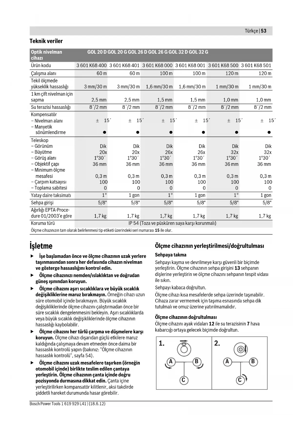 OBJ_BUCH-1239-002.book Page 53 Monday, June 18, 2012 10:51 AM54 | Türkçe 1 619 929 L41 | (18.6.12) Bosch Power Tools İlk iki ayak vidasn A ve B çevirerek hava kabarcğn iki vidann ortasna getirin. Daha sonra üçüncü viday C su terazisinin ortasna gelecek biçimde çevirin. Dairesel su terazisinin ayarndan sonra ölçme cihaznn yataylktan sapmalar kompansatör tarafndan dengelenir. Çalşma esnasnda düzenli aralklarla (örneğin su terazisi aynasna 3 bakarak), hava kabarcğnn su terazisinin merkezinde olup olmadğn kontrol edin. Ölçme cihaznn zemindeki bir noktada merkezlenmesi Gerektiğinde ölçme cihazn zemindeki bir noktada merkezleyin. Bunu yapmak için şakülü 20 sehpann tespit vidasna asn. Ölçme cihazn sehpa üzerinde kaydrarak veya sehpay kaydrarak cihaz zemindeki noktaya doğrultun. Teleskopun (dürbünün) odaklanmas Objektifin kapağn 1 aln. Teleskopu parlak bir nesneye doğrultun veya objektifin 1 önüne beyaz bir kağt tutun. Oküleri 6 art imleci net ve siyah olarak görününceye kadar çevirin. Teleskopu nivelman latasna doğrultun, gerekiyorsa kaba gezden 2 yararlann. Odaklama düğmesini 16 nivelman latasnn taksimat alan net biçimde görününceye kadar çevirin. Hassas yanal hareket düğmesini 14 çevirerek art imlecini nivelman latasnn tam ortasna getirin. Teleskop doğru olarak odaklandğnda, oküler arkasndaki göz hareket etse de art imleci ve nivelman latas görüntüsü birbirine göre yer değiştirmemelidir. Ölçme fonksiyonlar Nivelman latasn her zaman tam dik olarak yerleştirin. Doğrul- tulmuş ve odaklanmş ölçme cihazn art imleci nivelman lata- snn ortasna gelecek biçimde nivelman latasna doğrultun. Yüksekliğin okunmas Yüksekliği nivelman latasnda, art imlecinin orta çizgisinde okuyun. Şekilde ölçülen yükseklik: 1,195 m. Uzaklk ölçümü Ölçme cihazn ölçülecek uzaklğn başladğ noktaya merkezleyin. Yüksekliği nivelman latasnda, art imlecinin üst ve alt çizgilerinde okuyun. Ölçme cihaznn nivelman latasna olan uzaklğn bulmak için iki yükseklik arasndaki fark 100 ile çarpn. Şekilde ölçülen uzaklk: (1,347 m – 1,042 m) x 100 = 30,5 m. Açlarn ölçülmesi Ölçme cihazn ölçülecek açnn başladğ noktaya merkezleyin. Ölçme cihazn A noktasna doğrultun. Yatay dairenin 10 sfr noktasn okuma işaretine 9 çevirin. Daha sonra ölçme cihazn B noktasna doğrultun. Okuma işaretindeki 9 açy okuyun. GOL 20 D/GOL 26 D/GOL 32 D: Örnekte ölçülen aç: 45°. GOL 20 G/GOL 26 G/GOL 32 G: Örnekte ölçülen aç: 45 gon. Ölçme cihaznn hassaslk kontrolü İşe başlamadan önce ve ölçme cihaznn uzak yerlere taşnmasndan sonra her defasnda cihazn nivelman ve gösterge hassaslğn kontrol edin. Dairesel su terazisinin kontrolü Ölçme cihazn ayak vidalar 12 ile su terazisinin 7 hava kabarcğ ortaya gelecek biçimde doğrultun. Dürbünü 180° çevirin. Hava kabarcğ dairesel su terazisinin 7 merkezinde değilse, dairesel su terazisinin ayarnn yaplmas gerekir. Dairesel su terazisinin ayarlanmas Dairesel su terazisinin 7 hava kabarcğn ayak vidalarn 12 çevirerek kontrol işlemi son noktas ile merkez arasna getirin. İç altgen anahtar 17 yardm ile ayar vidalarn 11 hava kabarcğ dairesel su terazisinin merkezine gelinceye kadar çevirin. Dürbünü 180° çevirerek dairesel su terazisini kontrol edin. Gerektiğinde ayar işlemini tekrarlayn veya Bosch Müşteri Servisine başvurun. Kompansatörün kontrolü Ölçme cihazn doğrulttuktan ve odakladktan sonra bir referans noktasndaki yüksekliği ölçün. Daha sonra kompansatörün kilitleme düğmesine 8 basn ve tekrar brakn. Referans noktasndaki yüksekliği tekrar ölçün. Ölçülen her iki yükseklik tam olarak birbiri ile ayn değilse, ölçme cihazn bir Bosch Müşteri Servisinde onarma yollayn. A B