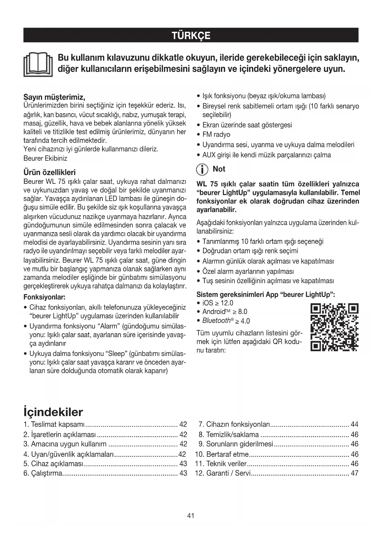 ritti derivanti dalla responsabilità per i prodotti o da altre disposizioni di legge obbligatorie in materia di responsabilità). Le riparazioni o la sostituzione completa non prolungano in alcun caso il periodo di garanzia. Salvo errori e modifiche41 Sayın müşterimiz, Ürünlerimizden birini seçtiğiniz için teşekkür ederiz. Isı, ağırlık, kan basıncı, vücut sıcaklığı, nabız, yumuşak terapi, masaj, güzellik, hava ve bebek alanlarına yönelik yüksek kaliteli ve titizlikle test edilmiş ürünlerimiz, dünyanın her tarafında tercih edilmektedir.Yeni cihazınızı iyi günlerde kullanmanızı dileriz. Beurer Ekibiniz Ürün özellikleri Beurer WL 75 ışıklı çalar saat, uykuya rahat dalmanızı ve uykunuzdan yavaş ve doğal bir şekilde uyanmanızı sağlar. Yavaşça aydınlanan LED lambası ile güneşin do-ğuşu simüle edilir. Bu şekilde siz ışık koşullarına yavaşça alışırken vücudunuz nazikçe uyanmaya hazırlanır. Ayrıca gündoğumunun simüle edilmesinden sonra çalacak ve uyanmanıza sesli olarak da yardımcı olacak bir uyandırma melodisi de ayarlayabilirsiniz. Uyandırma sesinin yanı sıra radyo ile uyandırılmayı seçebilir veya farklı melodiler ayar-layabilirsiniz. Beurer WL 75 ışıklı çalar saat, güne dingin ve mutlu bir başlangıç yapmanıza olanak sağlarken aynı zamanda melodiler eşliğinde bir günbatımı simülasyonu gerçekleştirerek uykuya rahatça dalmanızı da kolaylaştırır.Fonksiyonlar: Cihaz fonksiyonları, akıllı telefonunuza yükleyeceğiniz “beurer LightUp” uygulaması üzerinden kullanılabilir Uyandırma fonksiyonu “Alarm” (gündoğumu simülas-yonu: Işıklı çalar saat, ayarlanan süre içerisinde yavaş-ça aydınlanır Uykuya dalma fonksiyonu “Sleep” (günbatımı simülas-yonu: Işıklı çalar saat yavaşça kararır ve önceden ayar-lanan süre dolduğunda otomatik olarak kapanır) Işık fonksiyonu (beyaz ışık/okuma lambası) Bireysel renk sabitlemeli ortam ışığı (10 farklı senaryo seçilebilir) Ekran üzerinde saat göstergesi FM radyo Uyandırma sesi, uyanma ve uykuya dalma melodileri AUX girişi ile kendi müzik parçalarınızı çalma Not WL 75 ışıklı çalar saatin tüm özellikleri yalnızca “beurer LightUp” uygulamasıyla kullanılabilir. Temel fonksiyonlar ek olarak doğrudan cihaz üzerinden ayarlanabilir.Aşağıdaki fonksiyonları yalnızca uygulama üzerinden kul-lanabilirsiniz: Tanımlanmış 10 farklı ortam ışığı seçeneği Doğrudan ortam ışığı renk seçimi Alarmın günlük olarak açılması ve kapatılması Özel alarm ayarlarının yapılması Tuş sesinin özelliğinin açılması ve kapatılmasıSistem gereksinimleri App “beurer LightUp”: iOS ≥ 12.0 Android ≥ 8.0 Bluetooth ≥ 4.0Tüm uyumlu cihazların listesini gör-mek için lütfen aşağıdaki QR kodu-nu taratın: Bu kullanım kılavuzunu dikkatle okuyun, ileride gerekebileceği için saklayın, diğer kullanıcıların erişebilmesini sağlayın ve içindeki yönergelere uyun.