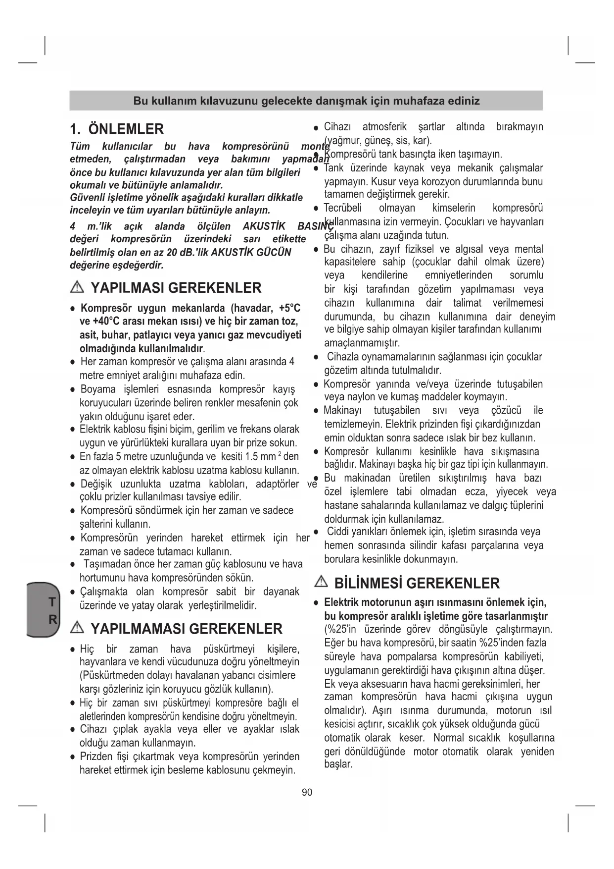 Tüm kullanıcılar bu hava kompresörünü monte etmeden, çalıştırmadan veya bakımını yapmadan öncebukullanıcıkılavuzundayeralantümbilgileri okumalıvebütünüyleanlamalıdır. Güvenliişletimeyönelikaşağıdakikurallarıdikkatle inceleyinvetümuyarılarıbütünüyleanlayın. 4 m.’lik açık alanda ölçülen AKUSTİK BASINÇ değeri kompresörün üzerindeki sarı etikette belirtilmişolanenaz20dB.’likAKUSTİKGÜCÜN değerineeşdeğerdir. YAPILMASI GEREKENLER ● Kompresör uygun mekanlarda (havadar, +5°C ve +40°C arası mekan ısısı) ve hiç bir zaman toz, asit, buhar, patlayıcı veya yanıcı gaz mevcudiyeti olmadığında kullanılmalıdır. ● Herzamankompresörveçalışmaalanıarasında4 metreemniyetaralığınımuhafazaedin. ● Boyama işlemleri esnasında kompresör kayış koruyucularıüzerindebelirenrenklermesafeninçok yakınolduğunuişareteder.