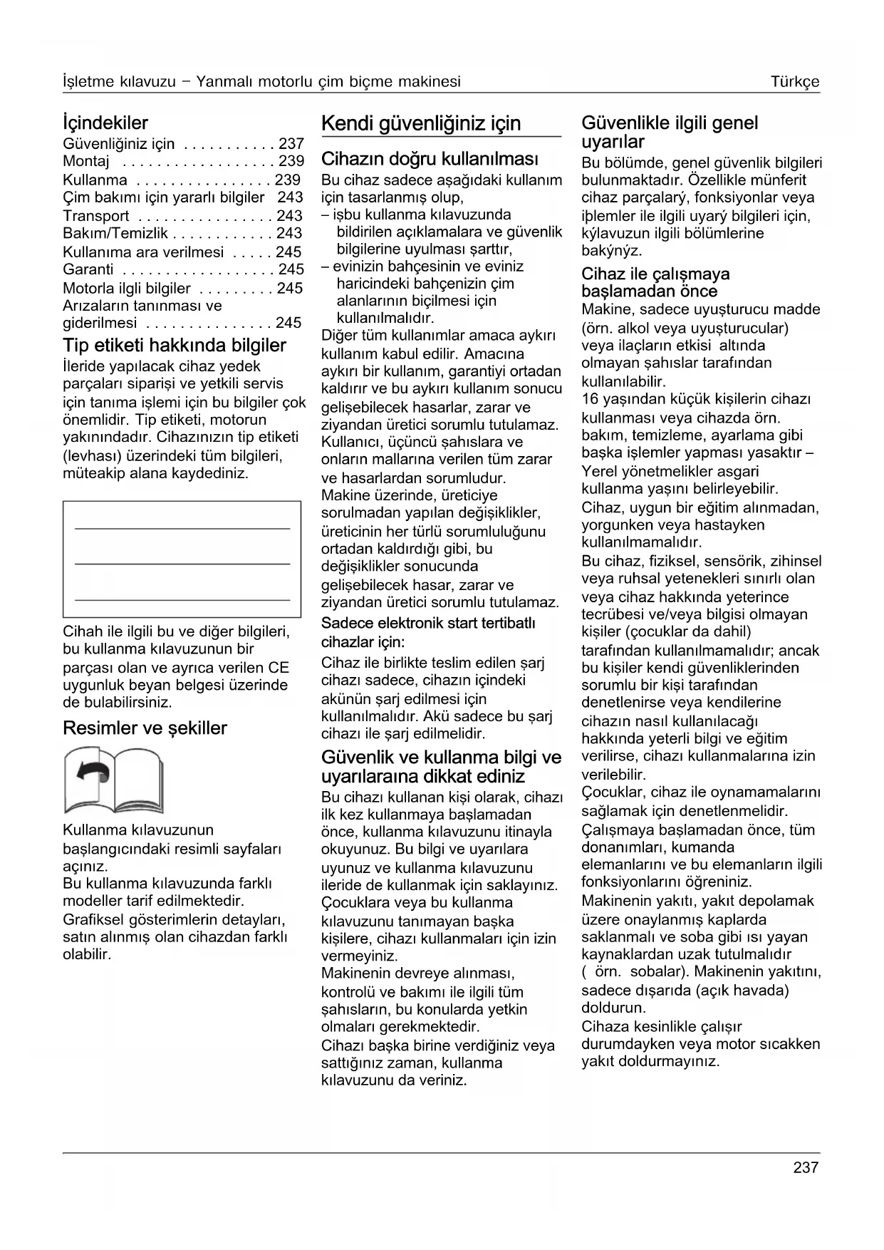 - Arızaların tanınması ve giderilmesi Tip etiketi hakkında bilgiler İleride yapılacak cihaz yedek parçaları siparişi ve yetkili servis için tanıma işlemi için bu bilgiler çok önemlidir. Tip etiketi, motorun yakınındadır. Cihazınızın tip etiketi (levhası) üzerindeki tüm bilgileri, müteakip alana kaydediniz. Cihah ile ilgili bu ve diğer bilgileri, bu kullanma kılavuzunun bir parçası olan ve ayrıca verilen CE uygunluk beyan belgesi üzerinde de bulabilirsiniz. Resimler ve şekiller Kullanma kılavuzunun başlangıcındaki resimli sayfaları açınız. Bu kullanma kılavuzunda farklı modeller tarif edilmektedir. Grafiksel gösterimlerin detayları, satın alınmış olan cihazdan farklı olabilir. Kendi güvenliğiniz için Cihazın doğru kullanılması Bu cihaz sadece aşağıdaki kullanım için tasarlanmış olup, – işbu kullanma kılavuzunda bildirilen açıklamalara ve güvenlik bilgilerine uyulması şarttır, – evinizin bahçesinin ve eviniz haricindeki bahçenizin çim alanlarının biçilmesi için kullanılmalıdır. Diğer tüm kullanımlar amaca aykırı kullanım kabul edilir. Amacına aykırı bir kullanım, garantiyi ortadan kaldırır ve bu aykırı kullanım sonucu gelişebilecek hasarlar, zarar ve ziyandan üretici sorumlu tutulamaz. Kullanıcı, üçüncü şahıslara ve onların mallarına verilen tüm zarar ve hasarlardan sorumludur. Makine üzerinde, üreticiye sorulmadan yapılan değişiklikler, üreticinin her türlü sorumluluğunu ortadan kaldırdığı gibi, bu değişiklikler sonucunda gelişebilecek hasar, zarar ve ziyandan üretici sorumlu tutulamaz. Sadece elektronik start tertibatlı cihazlar için: Cihaz ile birlikte teslim edilen şarj cihazı sadece, cihazın içindeki akünün şarj edilmesi için kullanılmalıdır. Akü sadece bu şarj cihazı ile şarj edilmelidir. Güvenlik ve kullanma bilgi ve uyarılaraına dikkat ediniz Bu cihazı kullanan kişi olarak, cihazı ilk kez kullanmaya başlamadan önce, kullanma kılavuzunu itinayla okuyunuz. Bu bilgi ve uyarılara uyunuz ve kullanma kılavuzunu ileride de kullanmak için saklayınız. Çocuklara veya bu kullanma kılavuzunu tanımayan başka kişilere, cihazı kullanmaları için izin vermeyiniz. Makinenin devreye alınması, kontrolü ve bakımı ile ilgili tüm şahısların, bu konularda yetkin olmaları gerekmektedir. Cihazı başka birine verdiğiniz veya sattığınız zaman, kullanma kılavuzunu da veriniz. Güvenlikle ilgili genel uyarılar Bu bölümde, genel güvenlik bilgileri bulunmaktadır. Özellikle münferit cihaz parçalarý, fonksiyonlar veya iþlemler ile ilgili uyarý bilgileri için, kýlavuzun ilgili bölümlerine bakýnýz. Cihaz ile çalışmaya başlamadan önce Makine, sadece uyuşturucu madde (örn. alkol veya uyuşturucular) veya ilaçların etkisi altında olmayan şahıslar tarafından kullanılabilir. 16 yaşından küçük kişilerin cihazı kullanması veya cihazda örn. bakım, temizleme, ayarlama gibi başka işlemler yapması yasaktır – Yerel yönetmelikler asgari kullanma yaşını belirleyebilir. Cihaz, uygun bir eğitim alınmadan, yorgunken veya hastayken kullanılmamalıdır. Bu cihaz, fiziksel, sensörik, zihinsel veya ruhsal yetenekleri sınırlı olan veya cihaz hakkında yeterince tecrübesi ve/veya bilgisi olmayan kişiler (çocuklar da dahil) tarafından kullanılmamalıdır; ancak bu kişiler kendi güvenliklerinden sorumlu bir kişi tarafından denetlenirse veya kendilerine cihazın nasıl kullanılacağı hakkında yeterli bilgi ve eğitim verilirse, cihazı kullanmalarına izin verilebilir. Çocuklar, cihaz ile oynamamalarını sağlamak için denetlenmelidir. Çalışmaya başlamadan önce, tüm donanımları, kumanda elemanlarını ve bu elemanların ilgili fonksiyonlarını öğreniniz. Makinenin yakıtı, yakıt depolamak üzere onaylanmış kaplarda saklanmalı ve soba gibi ısı yayan kaynaklardan uzak tutulmalıdır p. 245