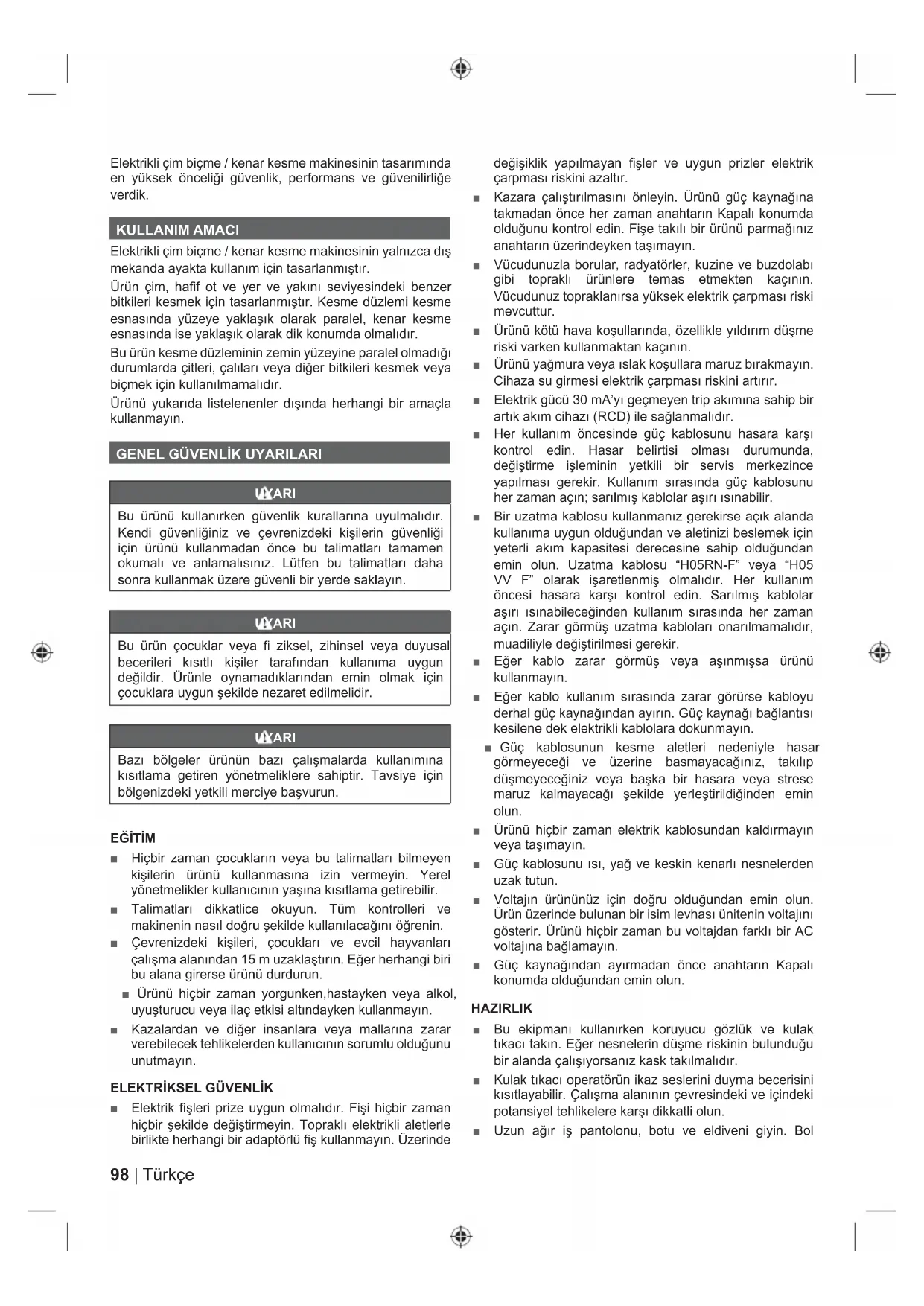 ПОПЕРЕДЖЕННЯ98 | Türkçe Elektrikli çim biçme / kenar kesme makinesinin tasarımında en yüksek önceliği güvenlik, performans ve güvenilirliğe verdik. KULLANIM AMACI Elektrikli çim biçme / kenar kesme makinesinin yalnızca dış mekanda ayakta kullanım için tasarlanmıştır. Ürün çim, hafi f ot ve yer ve yakını seviyesindeki benzer bitkileri kesmek için tasarlanmıştır. Kesme düzlemi kesme esnasında yüzeye yaklaşık olarak paralel, kenar kesme esnasında ise yaklaşık olarak dik konumda olmalıdır. Bu ürün kesme düzleminin zemin yüzeyine paralel olmadığı durumlarda çitleri, çalıları veya diğer bitkileri kesmek veya biçmek için kullanılmamalıdır. Ürünü yukarıda listelenenler dışında herhangi bir amaçla kullanmayın.