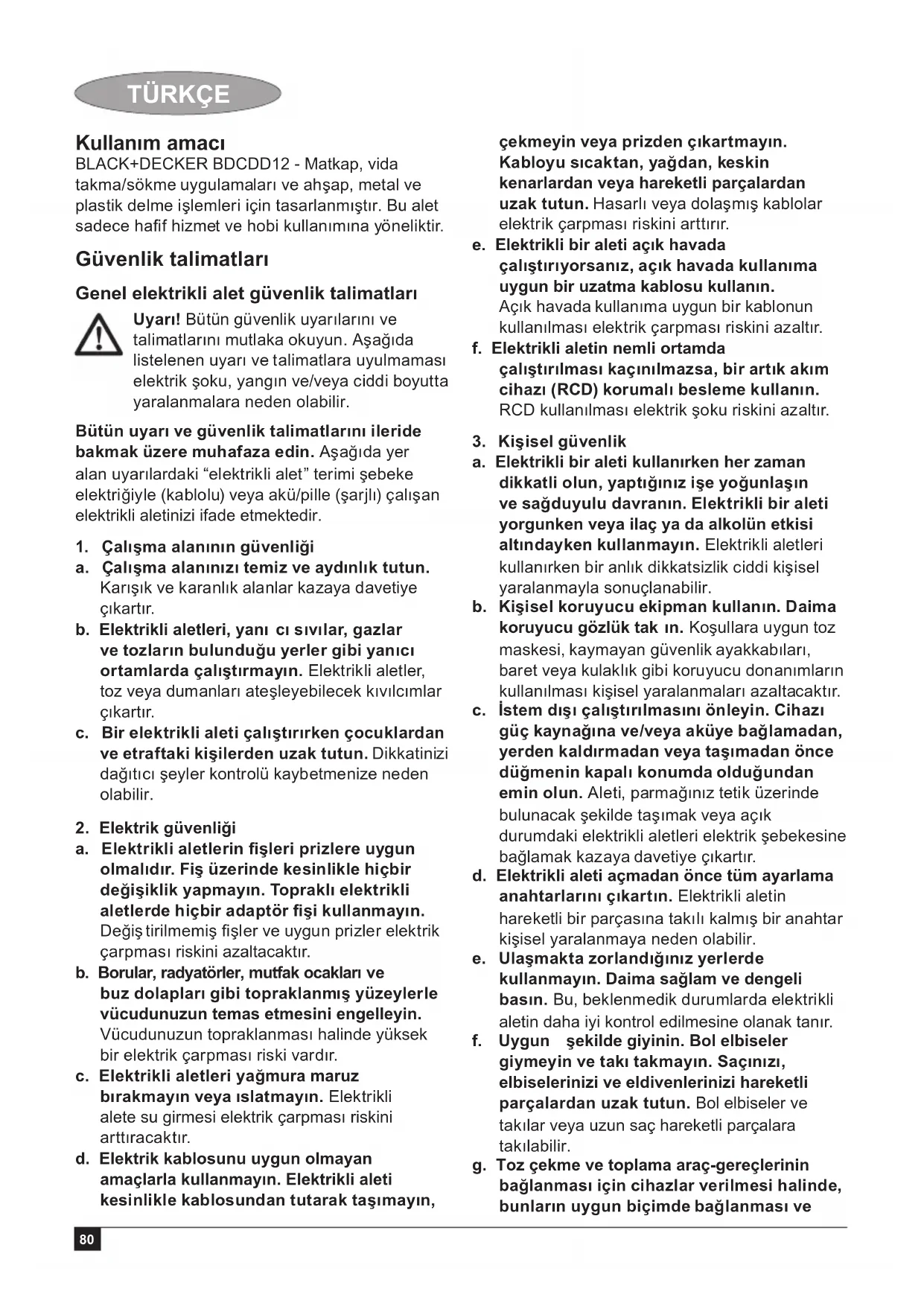 Kullanım amacı BLACK+DECKER BDCDD12 - Matkap, vida takma/sökme uygulamaları ve ahşap, metal ve plastik delme işlemleri için tasarlanmıştır. Bu alet sadece hafi f hizmet ve hobi kullanımına yöneliktir. Güvenlik talimatları Genel elektrikli alet güvenlik talimatları Uyarı! Bütün güvenlik uyarılarını ve talimatlarını mutlaka okuyun. Aşağıda listelenen uyarı ve talimatlara uyulmaması elektrik şoku, yangın ve/veya ciddi boyutta yaralanmalara neden olabilir. Bütün uyarı ve güvenlik talimatlarını ileride bakmak üzere muhafaza edin. Aşağıda yer alan uyarılardaki “elektrikli alet” terimi şebeke elektriğiyle (kablolu) veya akü/pille (şarjlı) çalışan elektrikli aletinizi ifade etmektedir.