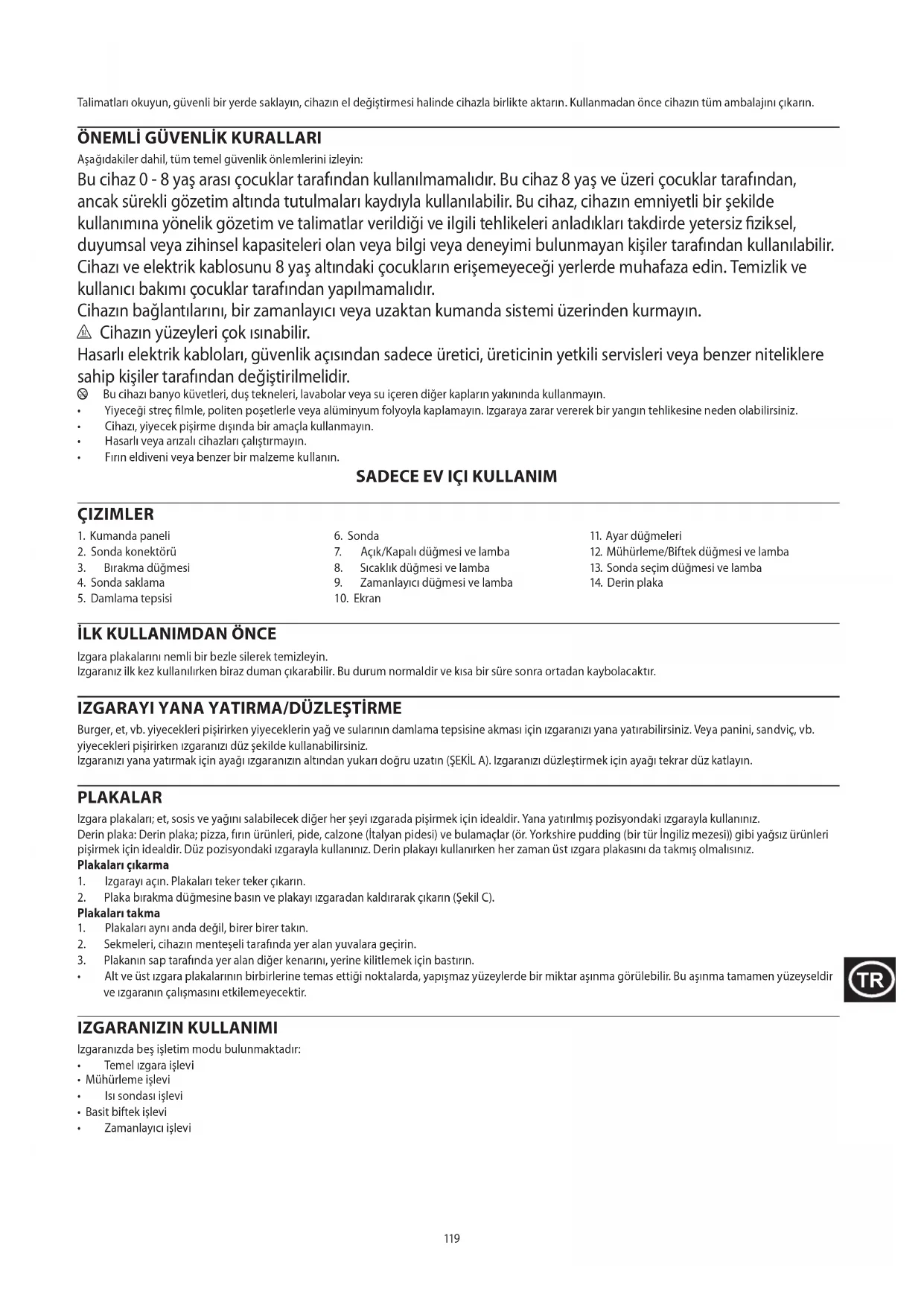 - Alt ve üst ızgara plakalarının birbirlerine temas ettiği noktalarda, yapışmaz yüzeylerde bir miktar aşınma görülebilir. Bu aşınma tamamen yüzeyseldir ve ızgaranın çalışmasını etkilemeyecektir. IZGARANIZIN KULLANIMI Izgaranızda beş işletim modu bulunmaktadır:
