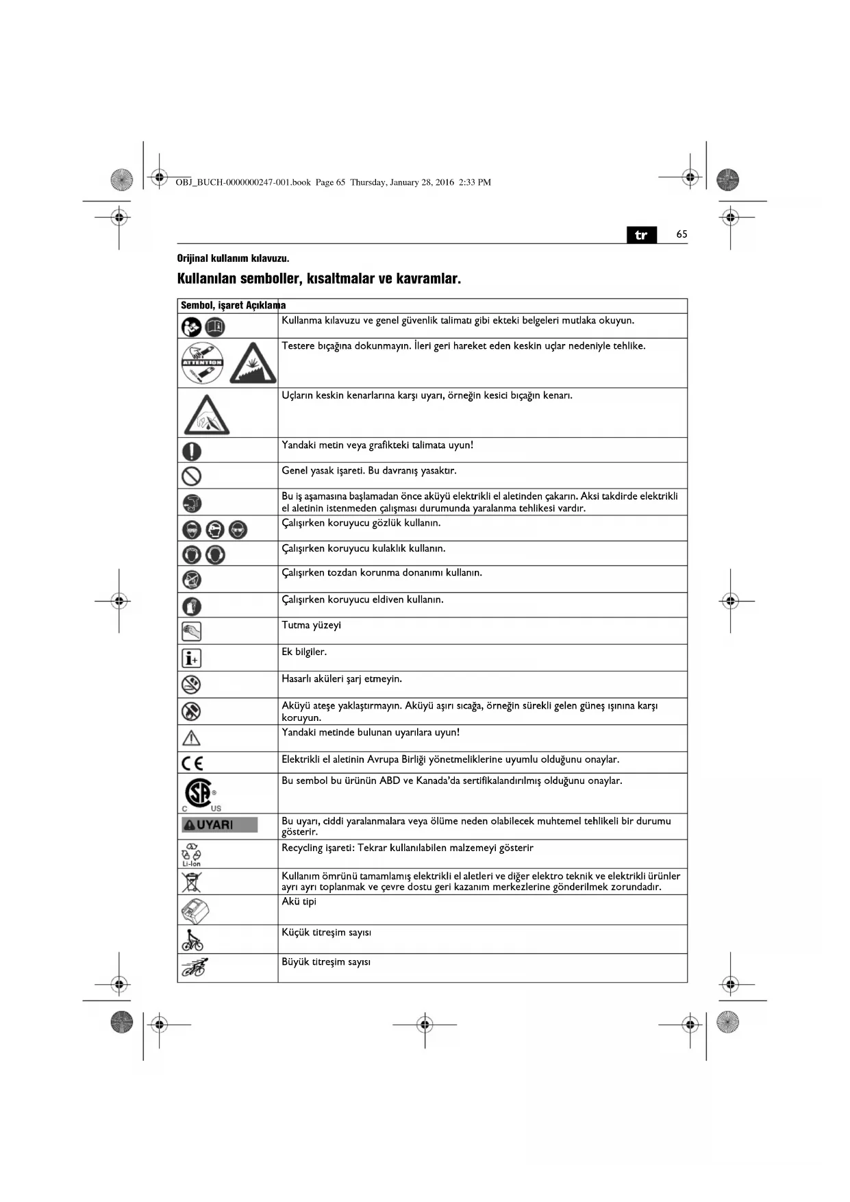 Orijinal kullanım kılavuzu. Kullanılan semboller, kısaltmalar ve kavramlar. Sembol, işaret Açıklama Kullanma kılavuzu ve genel güvenlik talimatı gibi ekteki belgeleri mutlaka okuyun. Testere bıçağına dokunmayın. İleri geri hareket eden keskin uçlar nedeniyle tehlike. Uçların keskin kenarlarına karşı uyarı, örneğin kesici bıçağın kenarı. Yandaki metin veya grafikteki talimata uyun! Genel yasak işareti. Bu davranış yasaktır. Bu iş aşamasına başlamadan önce aküyü elektrikli el aletinden çakarın. Aksi takdirde elektrikli el aletinin istenmeden çalışması durumunda yaralanma tehlikesi vardır. Çalışırken koruyucu gözlük kullanın. Çalışırken koruyucu kulaklık kullanın. Çalışırken tozdan korunma donanımı kullanın. Çalışırken koruyucu eldiven kullanın. Tutma yüzeyi Ek bilgiler. Hasarlı aküleri şarj etmeyin. Aküyü ateşe yaklaştırmayın. Aküyü aşırı sıcağa, örneğin sürekli gelen güneş ışınına karşı koruyun. Yandaki metinde bulunan uyarılara uyun! Elektrikli el aletinin Avrupa Birliği yönetmeliklerine uyumlu olduğunu onaylar. Bu sembol bu ürünün ABD ve Kanada’da sertifikalandırılmış olduğunu onaylar. Bu uyarı, ciddi yaralanmalara veya ölüme neden olabilecek muhtemel tehlikeli bir durumu gösterir. Recycling işareti: Tekrar kullanılabilen malzemeyi gösterir Kullanım ömrünü tamamlamış elektrikli el aletleri ve diğer elektro teknik ve elektrikli ürünler ayrı ayrı toplanmak ve çevre dostu geri kazanım merkezlerine gönderilmek zorundadır. Akü tipi Küçük titreşim sayısı Büyük titreşim sayısı OBJ_BUCH-0000000247-001.book Page 65 Thursday, January 28, 2016 2:33 PM66
