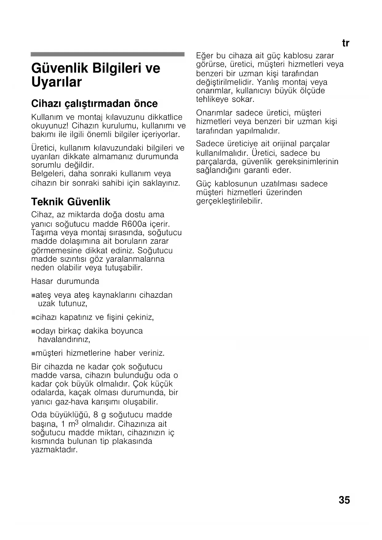 olmalıdır. Cihazınıza ait soğutucu madde miktarı, cihazınızın iç kısmında bulunan tip plakasında yazmaktadır. Eğer bu cihaza ait güç kablosu zarar görürse, üretici, müşteri hizmetleri veya benzeri bir uzman kişi tarafından değiştirilmelidir. Yanlış montaj veya onarımlar, kullanıcıyı büyük ölçüde tehlikeye sokar. Onarımlar sadece üretici, müşteri hizmetleri veya benzeri bir uzman kişi tarafından yapılmalıdır. Sadece üreticiye ait orijinal parçalar kullanılmalıdır. Üretici, sadece bu parçalarda, güvenlik gereksinimlerinin sağlandığını garanti eder. Güç kablosunun uzatılması sadece müşteri hizmetleri üzerinden gerçekleştirilebilir.tr