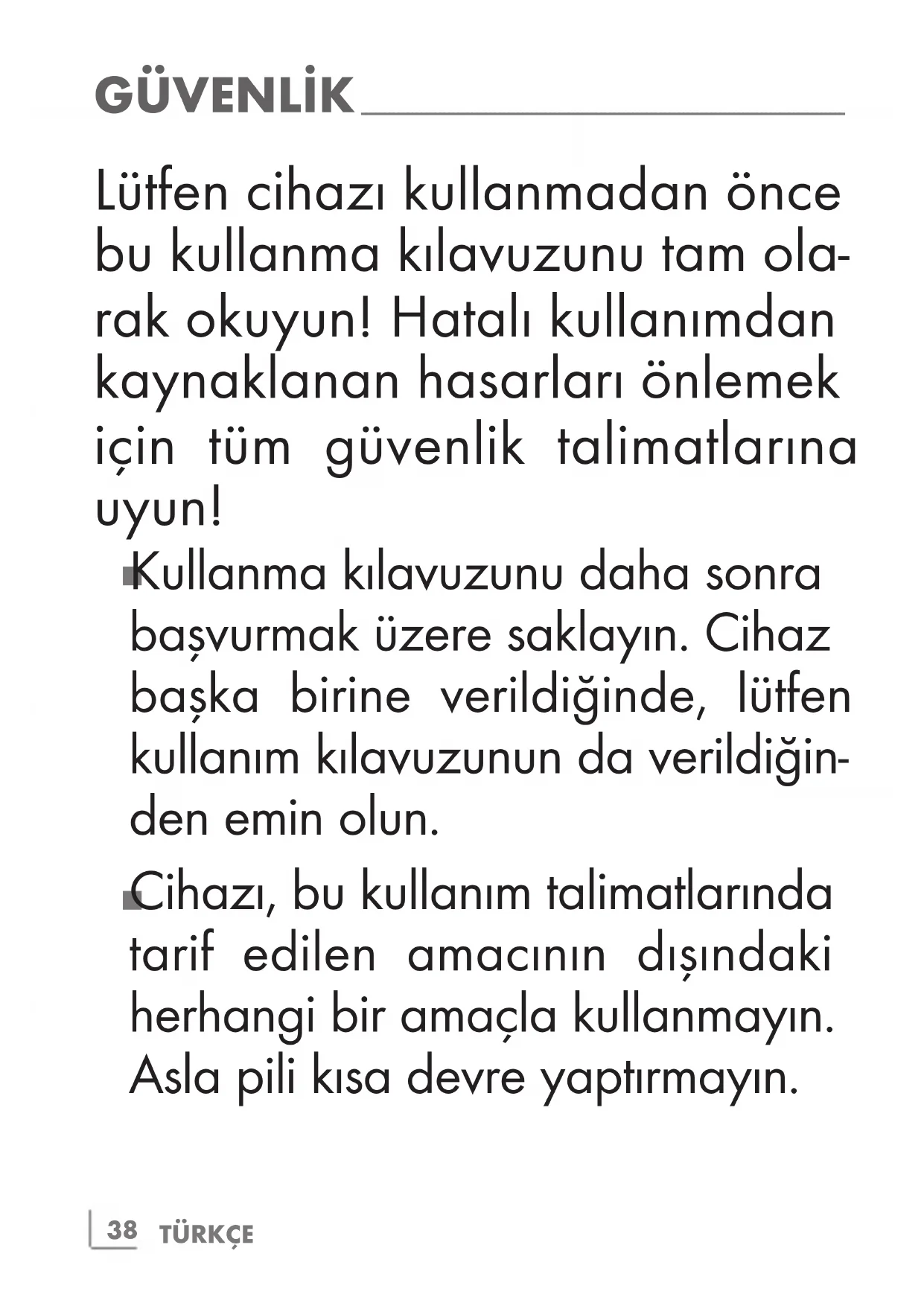 Lütfen cihazı kullanmadan önce bu kullanma kılavuzunu tam ola- rak okuyun! Hatalı kullanımdan kaynaklanan hasarları önlemek için tüm güvenlik talimatlarına uyun! Kullanma kılavuzunu daha sonra başvurmak üzere saklayın. Cihaz başka birine verildiğinde, lütfen kullanım kılavuzunun da verildiğin- den emin olun. Cihazı, bu kullanım talimatlarında tarif edilen amacının dışındaki herhangi bir amaçla kullanmayın. Asla pili kısa devre yaptırmayın.39