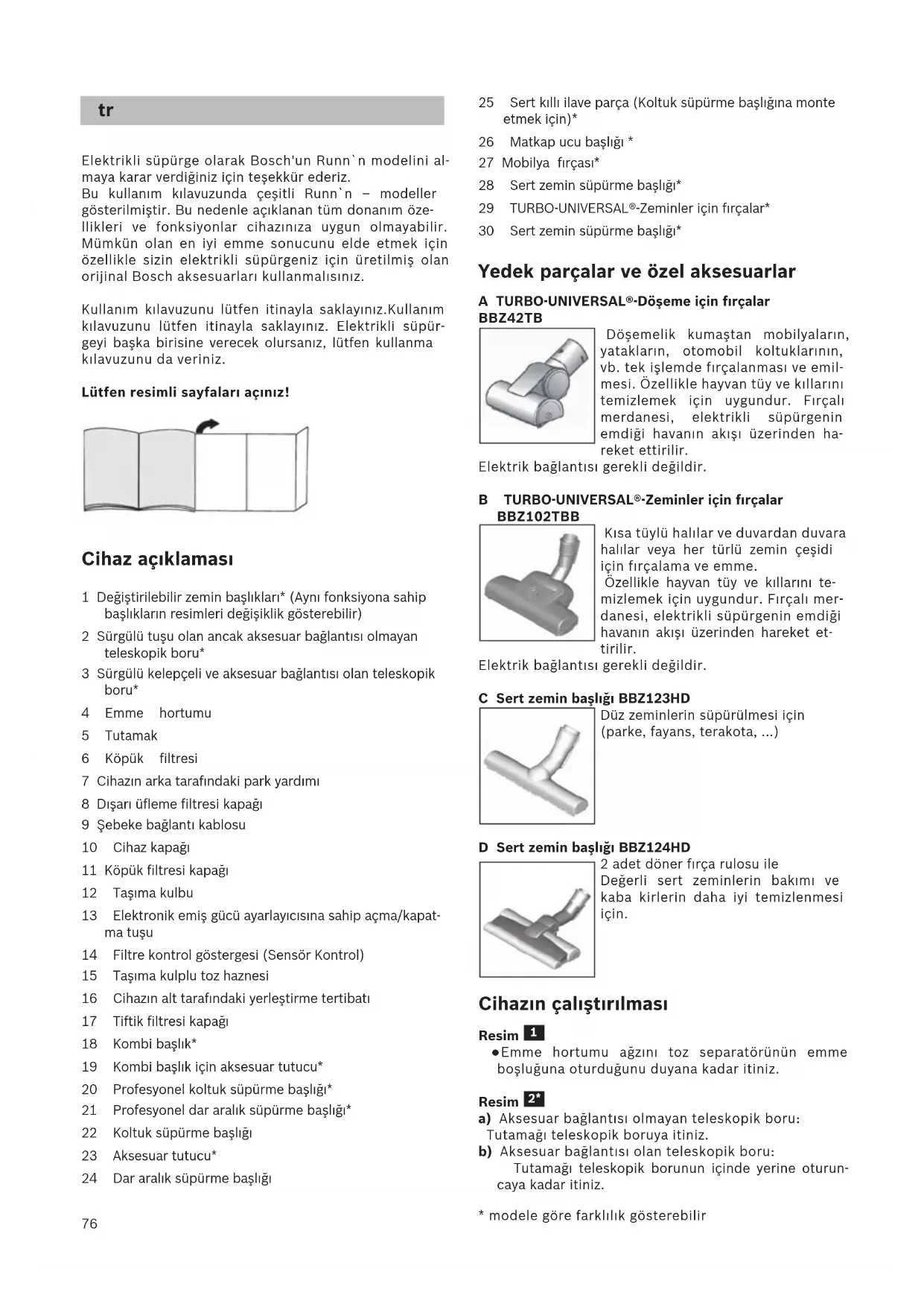 !Μη χρησιμοποιείτε κανένα υλικό τριψίματος, καθαριστικό τζαμιών ή καθαριστικό γενικής χρήσης. Μη βυθίζετε την ηλεκτρική σκούπα ποτέ στο νερό. Διατηρούμε το δικαίωμα των τεχνικών αλλαγών.76 Elektrikli süpürge olarak Bosch'un Runn`n modelini al- maya karar verdiğiniz için teşekkür ederiz. Bu kullanım kılavuzunda çeşitli Runn`n – modeller gösterilmiştir. Bu nedenle açıklanan tüm donanım öze- llikleri ve fonksiyonlar cihazınıza uygun olmayabilir. Mümkün olan en iyi emme sonucunu elde etmek için özellikle sizin elektrikli süpürgeniz için üretilmiş olan orijinal Bosch aksesuarları kullanmalısınız. Kullanım kılavuzunu lütfen itinayla saklayınız.Kullanım kılavuzunu lütfen itinayla saklayınız. Elektrikli süpür- geyi başka birisine verecek olursanız, lütfen kullanma kılavuzunu da veriniz. Lütfen resimli sayfaları açınız! Cihaz açıklaması 1 Değiştirilebilir zemin başlıkları* (Aynı fonksiyona sahip başlıkların resimleri değişiklik gösterebilir) 2 Sürgülü tuşu olan ancak aksesuar bağlantısı olmayan teleskopik boru* 3 Sürgülü kelepçeli ve aksesuar bağlantısı olan teleskopik boru* 4 Emme hortumu 5 Tutamak 6 Köpük filtresi 7 Cihazın arka tarafındaki park yardımı 8 Dışarı üfleme filtresi kapağı 9 Şebeke bağlantı kablosu 10 Cihaz kapağı 11 Köpük filtresi kapağı 12 Taşıma kulbu 13 Elektronik emiş gücü ayarlayıcısına sahip açma/kapat- ma tuşu 14 Filtre kontrol göstergesi (Sensör Kontrol) 15 Taşıma kulplu toz haznesi 16 Cihazın alt tarafındaki yerleştirme tertibatı 17 Tiftik filtresi kapağı 18 Kombi başlık* 19 Kombi başlık için aksesuar tutucu* 20 Profesyonel koltuk süpürme başlığı* 21 Profesyonel dar aralık süpürme başlığı* 22 Koltuk süpürme başlığı 23 Aksesuar tutucu* 24 Dar aralık süpürme başlığı