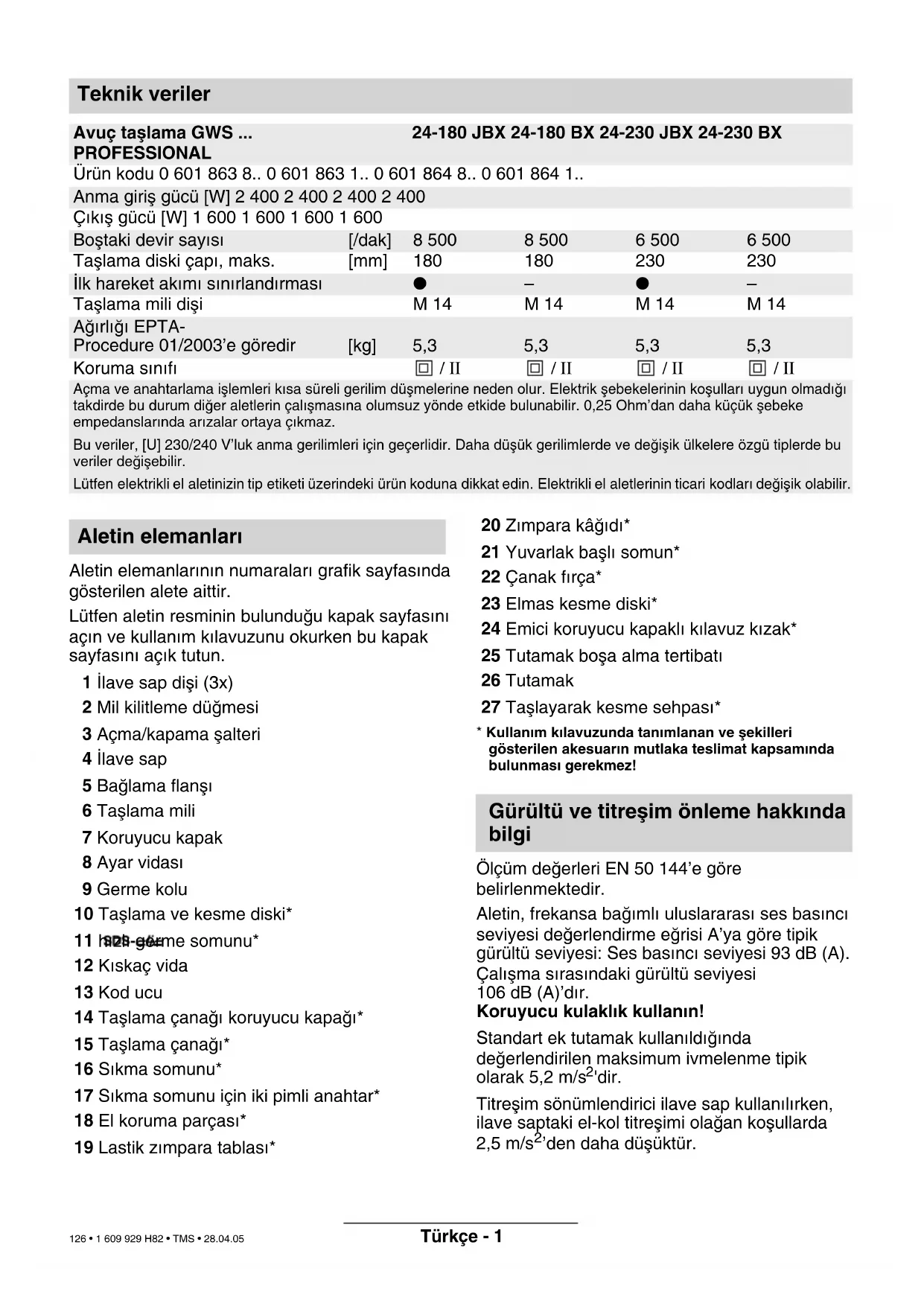 ’den daha düµüktür. Teknik veriler Avuç taµlama GWS ... PROFESSIONAL 24-180 JBX 24-180 BX 24-230 JBX 24-230 BX Ürün kodu 0 601 863 8.. 0 601 863 1.. 0 601 864 8.. 0 601 864 1.. Anma giriµ gücü [W] 2 400 2 400 2 400 2 400 Ç∂k∂µ gücü [W] 1 600 1 600 1 600 1 600 Boµtaki devir say∂s∂ [/dak] 8 500 8 500 6 500 6 500 Taµlama diski çap∂, maks. [mm] 180 180 230 230 ∑lk hareket ak∂m∂ s∂n∂rland∂rmas∂ ● – ● – Taµlama mili diµi M 14 M 14 M 14 M 14 Aπ∂rl∂π∂ EPTA- Procedure 01/2003’e göredir [kg] 5,3 5,3 5,3 5,3 Koruma s∂n∂f∂ / II / II / II / II Açma ve anahtarlama iµlemleri k∂sa süreli gerilim düµmelerine neden olur. Elektrik µebekelerinin koµullar∂ uygun olmad∂π∂ takdirde bu durum diπer aletlerin çal∂µmas∂na olumsuz yönde etkide bulunabilir. 0,25 Ohm’dan daha küçük µebeke empedanslar∂nda ar∂zalar ortaya ç∂kmaz. Bu veriler, [U] 230/240 V’luk anma gerilimleri için geçerlidir. Daha düµük gerilimlerde ve deπiµik ülkelere özgü tiplerde bu veriler deπiµebilir. Lütfen elektrikli el aletinizin tip etiketi üzerindeki ürün koduna dikkat edin. Elektrikli el aletlerinin ticari kodlar∂ deπiµik olabilir. Aletin elemanlar∂ Gürültü ve titreµim önleme hakk∂nda bilgi 1 609 929 H82.book Seite 1 Dienstag, 3. Mai 2005 3:11 15 126 • 1 609 929 H82 • TMS • 28.04.05Türkçe - 2 Bu alet; su kullanmadan metal ve taµ malzemedeki kesme, kaz∂ma ve f∂rçalama iµleri için geliµtirilmiµtir. Taµlar kesilirken k∂lavuz k∂zak kullan∂lmas∂ gereklidir. Taµ∂y∂c∂ duvarlarda aç∂lacak oluk ve kanallar DIN 1053 K∂s∂m 1 normlar∂na veya aletin kullan∂ld∂π∂ ülkenin yönetmeliklerine tabidir. Bu yönetmelik hükümlerine kesin bir biçimde uyulmal∂d∂r. Çal∂µmaya baµlamadan önce, sorumlu statikçi, mimar veya yap∂lardan yetkili merciin görüµünü al∂n. Bütün talimatlar∂ okuyun. Aµaπ∂daki talimat hükümlerine uymada hata yapacak olursan∂z, elektrik çarpmas∂, yang∂n tehlikesi ve/veya aπ∂r yaralanma tehlikesi ortaya ç∂kabilir. Bunlara ek olarak aletle birlikte teslim edilen veya bu kullan∂m k∂lavuzunun aras∂na konan güvenlik talimat∂ hükümlerine uyulmal∂d∂r. BU TAL∑MATI ∑Y∑ VE GÜVENL∑ B∑R B∑Ç∑MDE SAKLAYIN. Koruyucu gözlük tak∂n. Koruyucu kulakl∂k kullan∂n. ■ Çal∂µ∂rken elektrikli el aletini iki elinizle birlikte s∂k∂ca tutun ve duruµ pozisyonunuzun güvenli ve dengeli olmas∂n∂ saπlayan. Bu elektrikli el aleti iki elle daha güvenli yönlendirilir. ■ ∑µ parças∂n∂ emniyete al∂n. ∑µ parças∂n∂ bir s∂kma tertibat∂ veya vidal∂ mengene ile s∂kma elle tutmaktan daha güvenlidir. ■ Çal∂µma s∂ras∂nda saπl∂πa zararl∂ yanabilir veya patlayabilir tozlar ortaya ç∂kma olas∂l∂π∂ varsa gerekli güvenlik önemlerini al∂n. Örneπin: Baz∂ tozlar kanserojen kabul edilir. Bir toz ve talaµ tertibat∂ kullan∂n ve koruyucu toz maskesi tak∂n. ■ Çal∂µma yerinizi temiz tutun. Malzeme kar∂µ∂mlar∂ özellikle tehlikelidir. Hafif metal tozlar∂ yanabilir veya patlayabilir. ■ Bu aletle asbest içeren maddeleri iµlemeyin. Asbest kanserojendir. ■ Hazarl∂ kablo ile elektrikli el aletini kullanmay∂n. Hasarl∂ kabloyu ellemeyin ve çal∂µma s∂ras∂nda kablo hasar görecek olursa µebeke fiµini çekin. Hasal∂ kablolar elektrik çarpma tehlikesini yükseltirler. ■ Aç∂k havada kullan∂lan elektrikli el aletlerine bir hatal∂ ak∂m koruyucu µalteri (FI) baπlay∂n. Taµlama, kumlu z∂mpara kaπ∂d∂ ile z∂mparalama, tel f∂rça ile taµlama, polisaj ve kesici taµlama iµleri için müµterek uyar∂lar: ■ Bu elektrikli el aleti taµlama, kumlu z∂mpara kaπ∂d∂ ile z∂mparalama, polisaj ve kesici taµlama olarak kullan∂lmak üzere geliµtirilmiµtir. Elektrikli el aleti ile birlikte teslim edilen bütün uyar∂lara, talimata, µekillere ve verilere uyun hareket edin. Aµaπ∂daki talimat hükümlerine uymad∂π∂n∂z takdirde elektrik çarpmas∂, yang∂n veya aπ∂r yaralanma tehlikesi ile karµ∂laµabilirsiniz. ■ Üretici taraf∂ndan bu alet için öngörülmeyen ve tavsiye edilmeyen hiçbir aksesuar kullanmay∂n. Çünkü aletinize takabileceπiniz her aksesuar güvenli kullan∂m∂ garanti etmez. ■ Bu aletle kullanacaπ∂n∂z uçlar∂n müsaade edilen devir say∂lar∂ en az∂ndan alet üzerinde belirtilen en yüksek devir say∂s∂ kadar olmal∂d∂r. Müsaade edilenden daha yüksek devir say∂s∂ ile çal∂µan uçlar hasar görebilir. ■ Uçlar∂n d∂µ çaplar∂ ve kal∂nl∂klar∂ elektrikli el aletinizin ölçülerine uymal∂d∂r. Yanl∂µ ölçülere sahip uçlar yeterli ölçüde kontrol edilemez. ■ Taµlama diskleri, flanµlar, z∂mpara tablalar∂ veya diπer aksesuar elektrikli el aletinizin taµlama miline tam olarak uymal∂d∂r. Elektrikli el aletinin taµlama miline tam olarak uymayan uçlar düzensiz döner, yüksek oranda titreµim yapar ve aletin kontrolünün kaybedilmesine neden olabilir. Usulüne uygun kullan∂m Statik konusundaki uyar∂lar Güvenliπiniz ∑çin 1 609 929 H82.book Seite 2 Dienstag, 3. Mai 2005 3:11 15 127 • 1 609 929 H82 • TMS • 28.04.05Türkçe - 3 ■ Hasarl∂ uçlar∂ kullanmay∂n. Her kullan∂mdan önce taµlama disklerini soyulma ve çizik, z∂mpara tablalar∂n∂ çizik, aµ∂nma ve y∂pranma, tel f∂rçalar∂ gevµek ve kopuk tel aç∂s∂ndan kontrol edin. Elektrikli el aleti veya uç yere düµecek olursa, hasar görüp görmediklerini kontrol edin veya hasar görmemiµ bir uç kullan∂n. Ucu kontrol edip takt∂ktan sonra çevrede bulunanlar∂ uzaklaµt∂r∂n ve elektrikli el aletini denemek üzere bir dakika kadar en yüksek devir say∂s∂nda çal∂µt∂r∂n. Hasarl∂ uçlar genellikle bu test çal∂µmas∂nda k∂r∂l∂r. ■ Kiµisel korunma donan∂m∂ kullan∂n. Ya