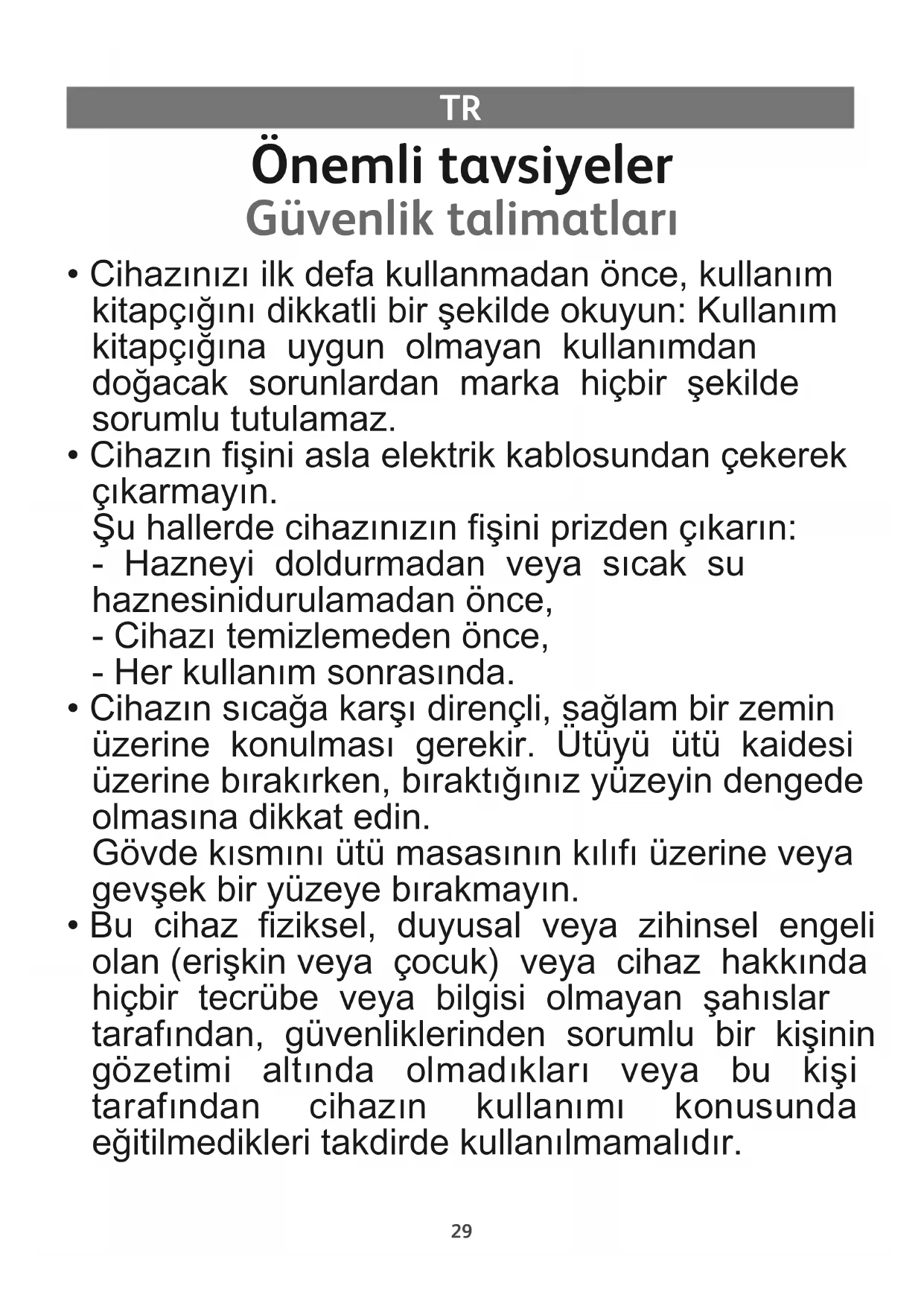 - Bu cihaz fiziksel, duyusal veya zihinsel engeli olan kimseler veya sekiz yaş üzeri çocuklar tarafından, güvenliklerinden sorumlu bir kişinin gözetimi altında olmaları veya bu kişi tarafından cihazın kullanımı konusunda eğitilmeleri halinde kullanılabilir. Çocuklar cihaz ile oynamamalıdır. Bakım ve temizlik işlerinin, bir yetişkin gözetimi altında bulunmadıkları durumlarda 8 yaş ve üzeri çocuklar tarafından gerçekleştirilmesine izin verilmemelidir. Cihazı ve kordonunu 8 yaş altındaki çocukların ulaşamayacakları yerlerde muhafaza edin.