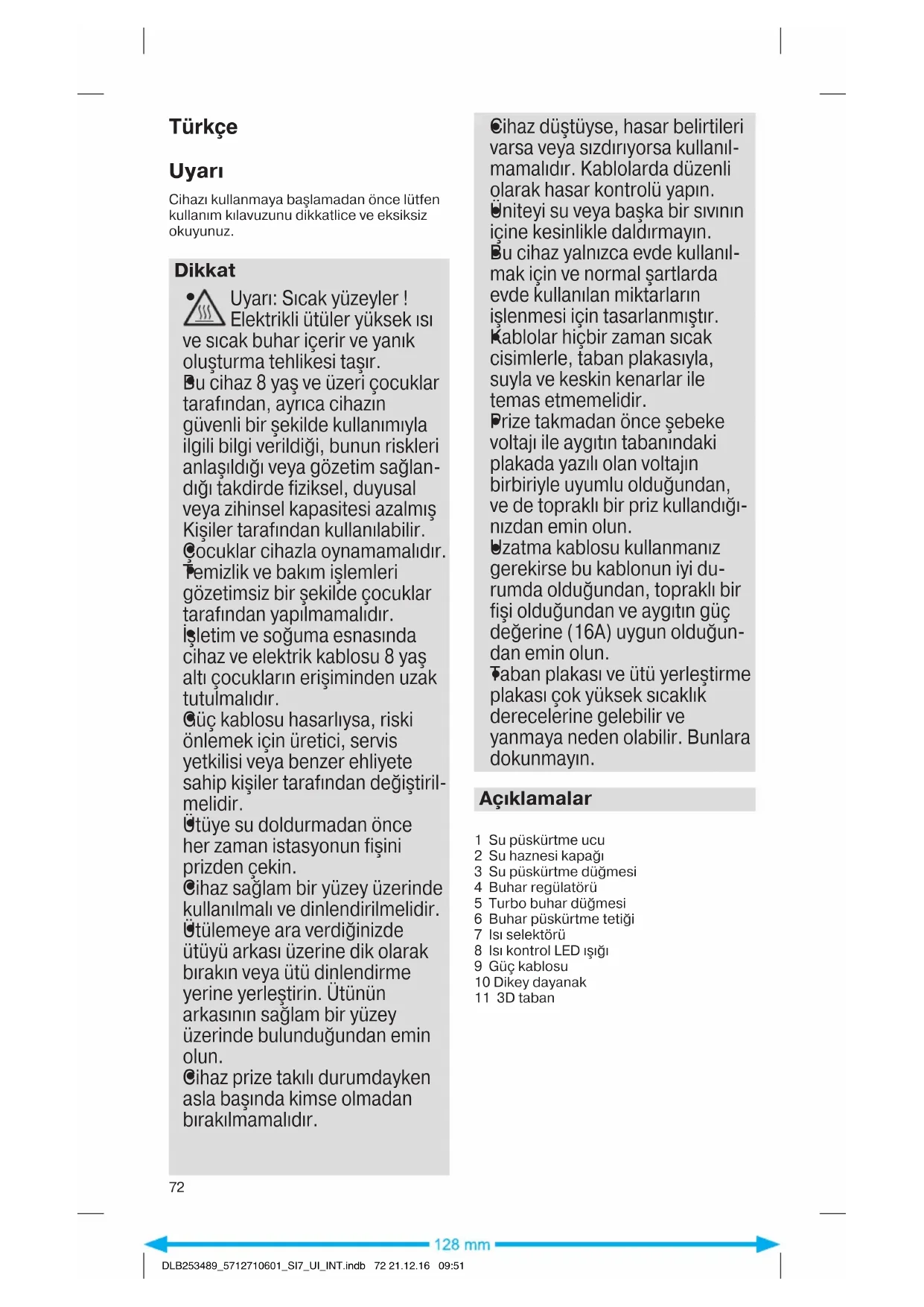 DLB253489_5712710601_SI7_UI_INT.indb 71 21.12.16 09:51Türkçe Uyarı Cihazı kullanmaya başlamadan önce lütfen kullanım kılavuzunu dikkatlice ve eksiksiz okuyunuz. Dikkat