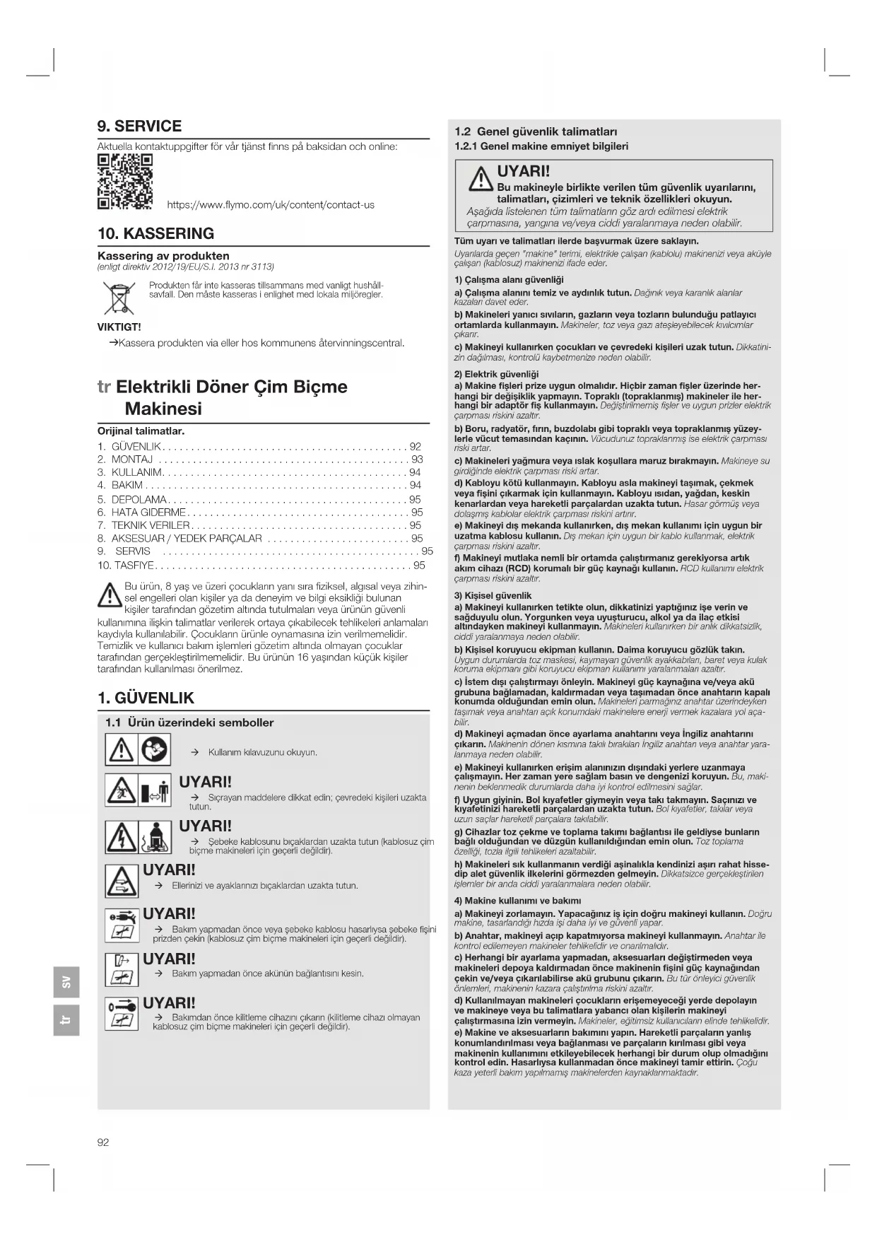 TEHLİKE! Boğulma riski! Küçük parçalar yutulabilir. → Ürünü monte ederken bebekleri uzak tutun. → Makineyi durdurun, şebeke şini duvar prizinden çıkarın ve tüm hareketli parçaların tamamen durmasını bekleyin. − Makine yabancı bir nesneye çarparsa: → Bu durumda, yeniden çalıştırmadan ve tekrar kullanmadan önce makinede hasar olup olmadığını kontrol edin ve onarın. − Makine anormal bir şekilde titremeye başlarsa: → Bu durumda derhal makinede hasar olup olmadığını inceleyin, hasarlı parçaları değiştirin veya onarın ve gevşek parçaları inceleyip sıkın. → Çim biçmeden önce, çim biçilecek alanda dallar gibi gizli nesneler olup olmadığını kontrol edin ve bunları kaldırın. Bu, kesme aletinin sıkışma riskini azaltır. → Çim dışındaki yüzeylerden geçerken makineyi taşımak için yatırmak gerektiğinde ve makineyi çim biçilecek alana götürürken veya bu alandan getirirken kesme aletini durdurun. → Motor çalışırken makineyi yatırmayın. → Depolamadan önce çim toplama sepetini boşaltın. → Öneri: Depolamadan önce temizlik ve bakım işlemlerini gerçekleştirin. → Makinenin bakımını düzenli olarak yapın. Bu, makinenin kullanım ömrünü uzatır. → Yalnızca FLYMO onaylı yedek parçalar kullanın. Uygun olmayan yedek par- çalar yaralanmalara neden olabilir veya makineye zarar verebilir. → Güvenlik bileşenlerini değiştirmeyin. Güvenlik bileşenlerinin değiştirilmesi yaralanma riskini artırır. → Makineyi ayarlarken dikkatli olun. Bu, parmakların hareketli kesme aleti ile makinenin sabit parçaları arasında sıkışmasını önler. → Depolamadan önce her zaman makinenin soğumasını bekleyin. → Kesme aletine bakım yaparken, kesme aletinin kapatıldıktan sonra da hareket edebileceğini unutmayın. → Öneri: Kulak koruma ekipmanı kullanın. → Kayma tehlikesi: − ıslak çimde − dik yamaçlarda − taşıma sırasında → Çim biçme makinesine aşırı yük bindirmeyin. → Geri geri giderken dikkatli olun.