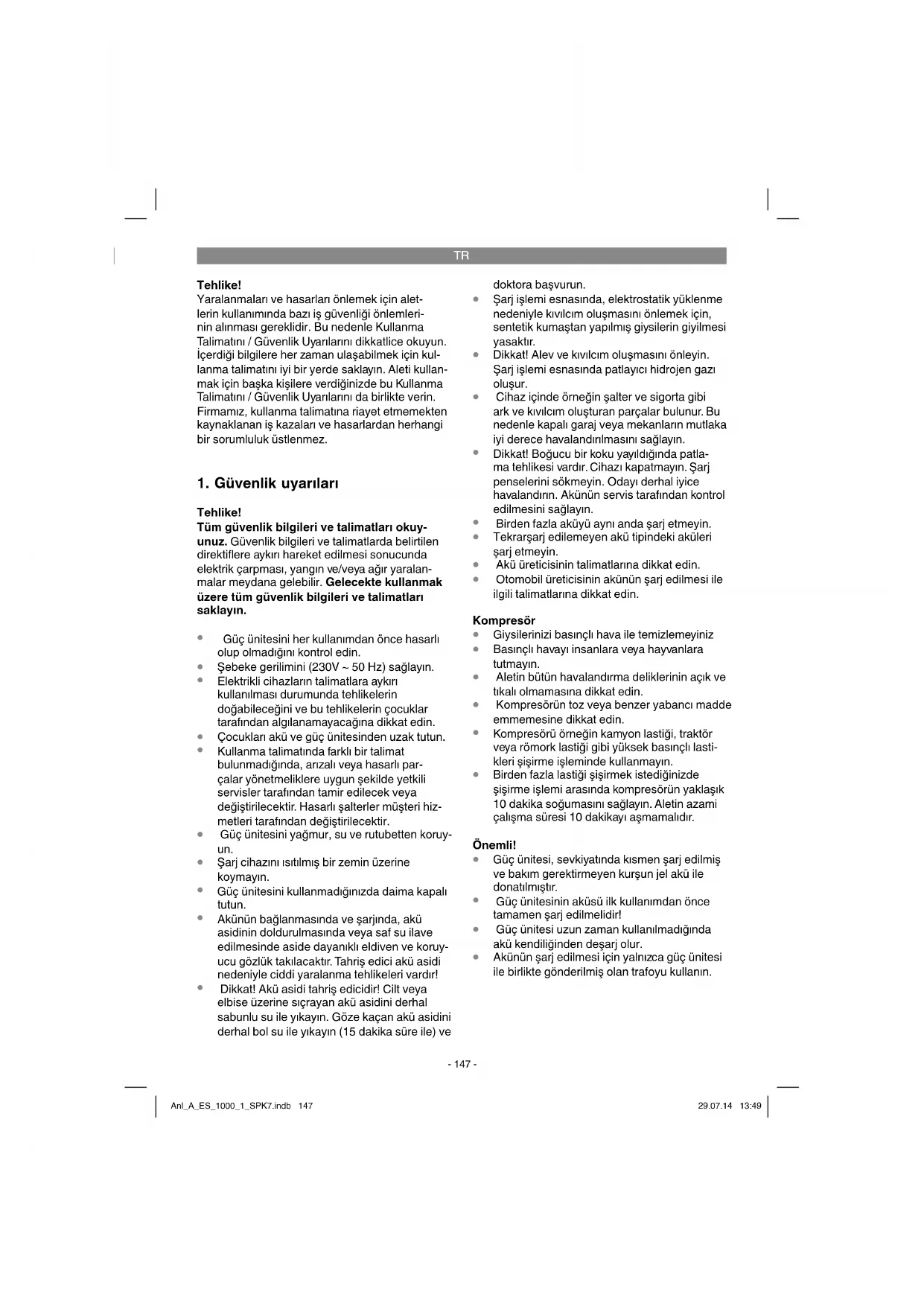 Tehlike! - Yaralanma riskini azaltmak için Kullanma Talimatını okuyunuz Anl_A_ES_1000_1_SPK7.indb 146Anl_A_ES_1000_1_SPK7.indb 146 29.07.14 13:4929.07.14 13:49TR