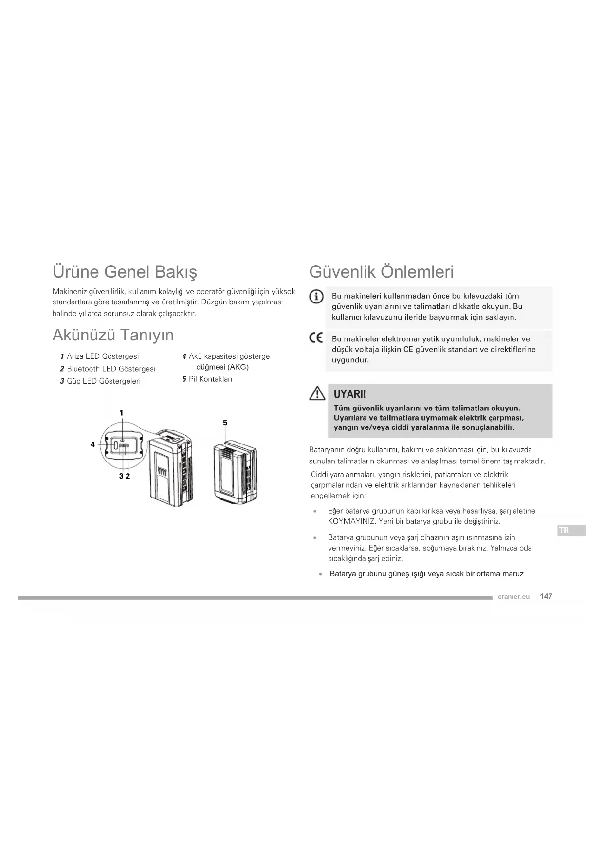 sıcaklık NOT: Eğer LED5 yanıp sönüyorsa, pil paketi çalışmaz. Pil paketinin sıcaklığı normale dönene kadar beklemesi gerekiyor. Akünüzün GreenFleet Uygulamasına Bağlanması Uygulama kullanıcı olarak size ekstra değer sağlamak amacıyla tasarlanmıştır. Uygulamayı indirin ve GreenFleet’in siz işlerinizde nasıl daha verimli yapılandırılmış olmanıza yardımcı olabileceğini keşfedin. Bu UYGULAMA mobil uygulamadan görüntülemek için mevcut olan ayrı şartlar ve koşullara tabidir. Uygulamayı aşağıdaki adresten indirebilirsiniz: IOS Android Bakim UYARI! Fren sıvılarının, benzinin, petrol bazlı ürünlerin, nüfuz edici yağın vb. hiçbir zaman plastik parçalarla temas etmesine izin vermeyin. Plastiğe zarar verebilecek, zayıatabilecek veya yok edebilecek kimyasal maddeler içerirler. UYARI! Ciddi ziksel yaralanmaları önlemek için temizlik veya herhangi bir bakım çalışması yaparken akü takımını aletten çıkartın.152 cramer.eu