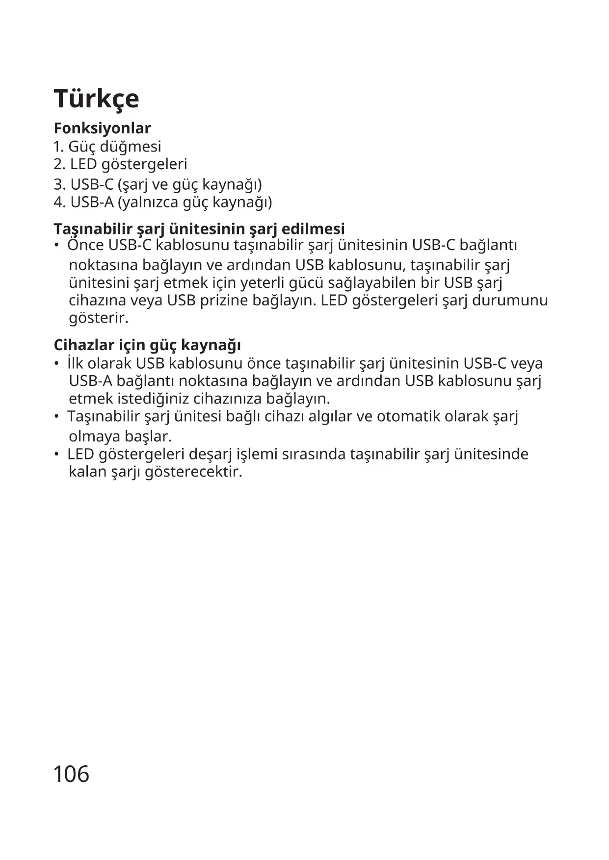 - Önce USB-C kablosunu taşınabilir şarj ünitesinin USB-C bağlantı noktasına bağlayın ve ardından USB kablosunu, taşınabilir şarj ünitesini şarj etmek için yeterli gücü sağlayabilen bir USB şarj cihazına veya USB prizine bağlayın. LED göstergeleri şarj durumunu gösterir. Cihazlariçingüçkaynağı
