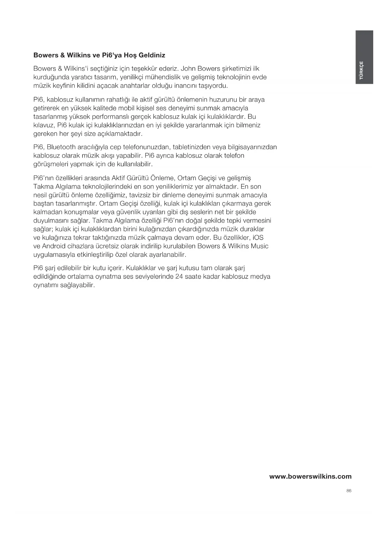 Bowers & Wilkins ve Pi6'ya Hoş Geldiniz Bowers & Wilkins'i seçtiğiniz için teşekkür ederiz. John Bowers şirketimizi ilk kurduğunda yaratıcı tasarım, yenilikçi mühendislik ve gelişmiş teknolojinin evde müzik keyfinin kilidini açacak anahtarlar olduğu inancını taşıyordu. Pi6, kablosuz kullanımın rahatlığı ile aktif gürültü önlemenin huzurunu bir araya getirerek en yüksek kalitede mobil kişisel ses deneyimi sunmak amacıyla tasarlanmış yüksek performanslı gerçek kablosuz kulak içi kulaklıklardır. Bu kılavuz, Pi6 kulak içi kulaklıklarınızdan en iyi şekilde yararlanmak için bilmeniz gereken her şeyi size açıklamaktadır. Pi6, Bluetooth aracılığıyla cep telefonunuzdan, tabletinizden veya bilgisayarınızdan kablosuz olarak müzik akışı yapabilir. Pi6 ayrıca kablosuz olarak telefon görüşmeleri yapmak için de kullanılabilir. Pi6’nın özellikleri arasında Aktif Gürültü Önleme, Ortam Geçişi ve gelişmiş Takma Algılama teknolojilerindeki en son yeniliklerimiz yer almaktadır. En son nesil gürültü önleme özelliğimiz, tavizsiz bir dinleme deneyimi sunmak amacıyla baştan tasarlanmıştır. Ortam Geçişi özelliği, kulak içi kulaklıkları çıkarmaya gerek kalmadan konuşmalar veya güvenlik uyarıları gibi dış seslerin net bir şekilde duyulmasını sağlar. Takma Algılama özelliği Pi6’nın doğal şekilde tepki vermesini sağlar; kulak içi kulaklıklardan birini kulağınızdan çıkardığınızda müzik duraklar ve kulağınıza tekrar taktığınızda müzik çalmaya devam eder. Bu özellikler, iOS ve Android cihazlara ücretsiz olarak indirilip kurulabilen Bowers & Wilkins Music uygulamasıyla etkinleştirilip özel olarak ayarlanabilir. Pi6 şarj edilebilir bir kutu içerir. Kulaklıklar ve şarj kutusu tam olarak şarj edildiğinde ortalama oynatma ses seviyelerinde 24 saate kadar kablosuz medya oynatımı sağlayabilir. www.bowerswilkins.com87