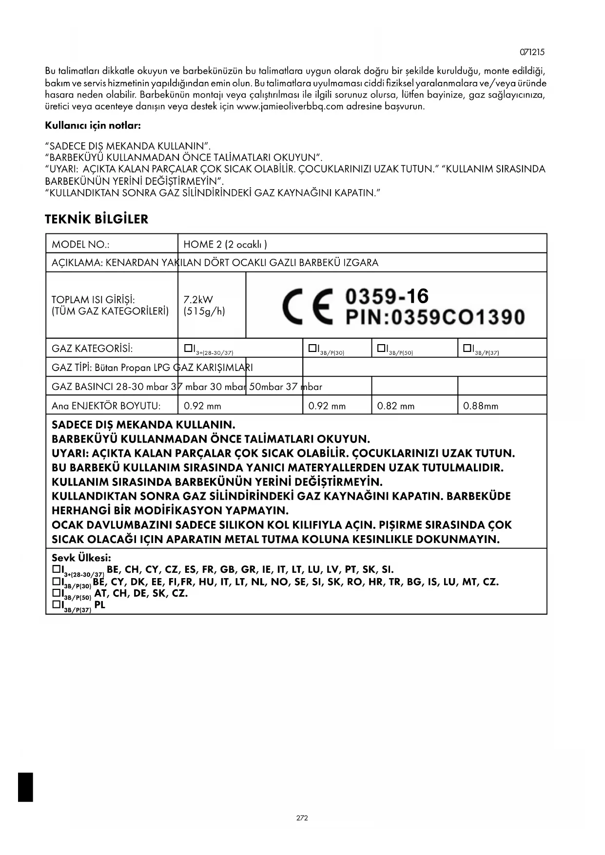 Bu talimatları dikkatle okuyun ve barbekünüzün bu talimatlara uygun olarak doğru bir şekilde kurulduğu, monte edildiği, bakım ve servis hizmetinin yapıldığından emin olun. Bu talimatlar a uyulmaması ciddi fiziksel yaralanmalara ve/veya üründe hasara neden olabilir. Barbekünün montajı veya çalıştırılması ile ilgili sorunuz olursa, lütfen bayinize, gaz sağlayıcınıza, üretici veya acenteye danışın veya destek için www.jamieoliverbbq.com adresine başvurun. Kullanıcı için notlar: “SADECE DIŞ MEKANDA KULLANIN”. “BARBEKÜYÜ KULLANMADAN ÖNCE TALİMATLARI OKUYUN”. “UYARI: AÇIKTA KALAN PARÇALAR ÇOK SICAK OLABİLİR. ÇOCUKLARINIZI UZAK TUTUN.” “KULLANIM SIRASINDA BARBEKÜNÜN YERİNİ DEĞİŞT