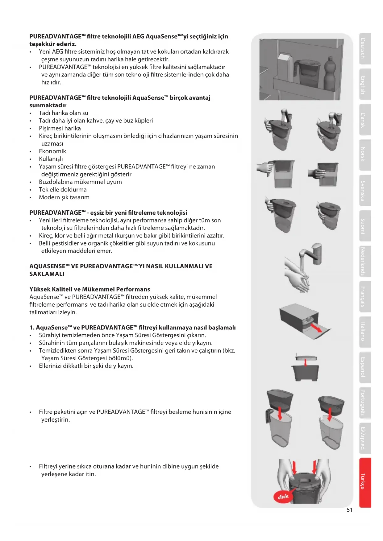 ltreyi değiştirin.53 Deutsch English Dansk Norsk Svenska Suomi Nederlands Français Italiano Español Português Ελληνικά Türkçe ÖNEMLİ NOTLAR AquaSense™ ve PUREADVANTAGE™ ltrenin kullanımı için ideal koşullar