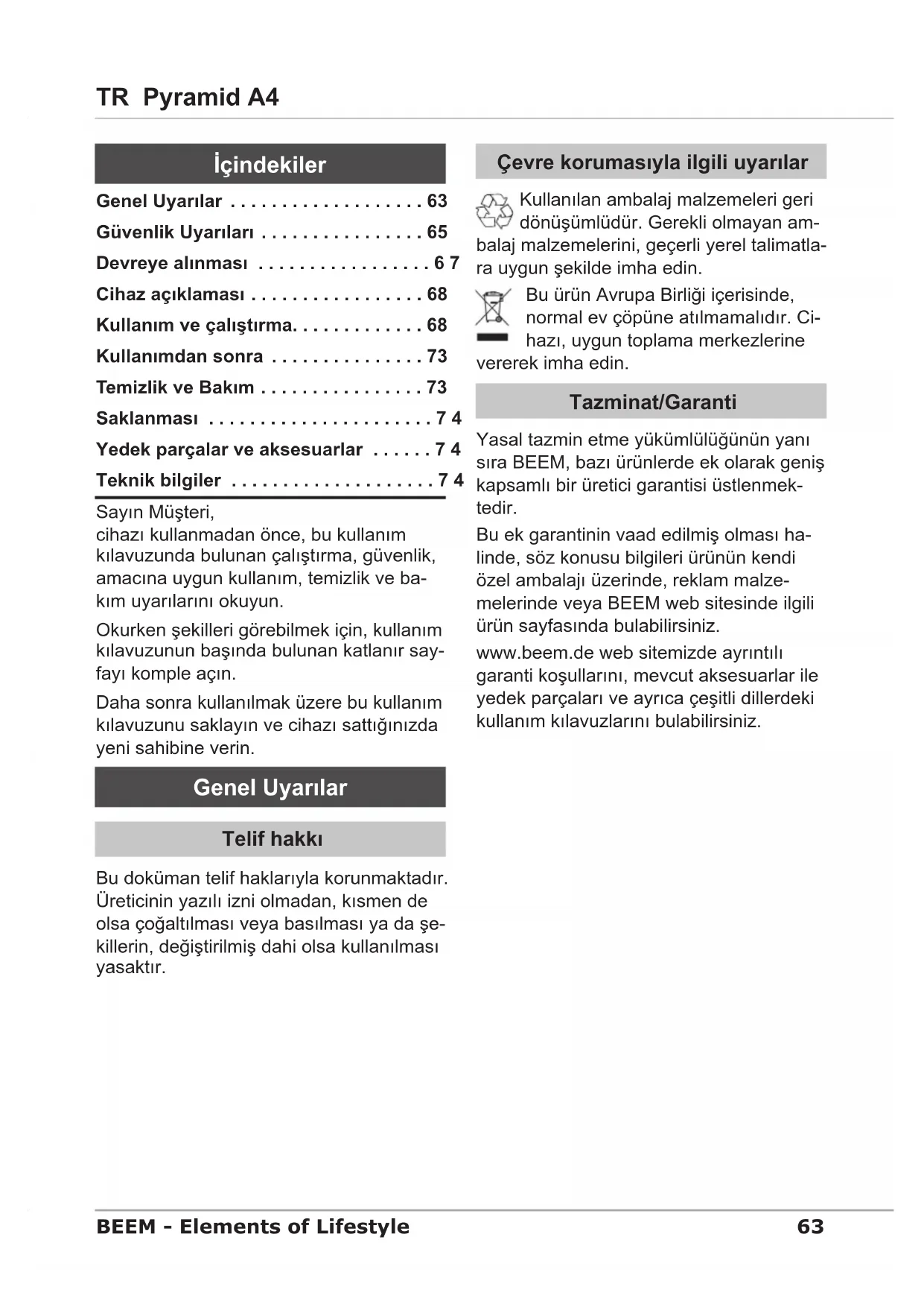 - Teknik bilgiler İçindekiler64 Pyramid A4 TR BEEM - Elements of Lifestyle UYARI Bu cihazdan, amacına uygun olmayan kullanım ve/veya farklı amaçla kullanım nedeniyle tehlike doğabilir. Cihazı yalnızca amacına uygun ► olarak kullanın. Bu kılavuzda tarif edilen yöntemlere ► uyun. Amacına uygun olmayan kullanımdan kay- naklanan zararlar nedeniyle herhangi bir hak talebinde bulunmak mümkün değildir. Risk sadece cihazı çalıştırana aittir. Sınırlı sorumluluk Aşağıdaki nedenlerden kaynaklanan direkt veya dolaylı zararlardan sorumluluk almı- yoruz: Kullanım kılavuzunun dikkate alınma- ■ ması, Amacına uygun olmayan kullanım, ■ Usulüne aykırı veya uygun olmayan ■ davranış tarzı, Usulüne uygun davranmadan yapılan ■ onarımlar, İzin verilmeyen değişiklikler, ■ Yabancı parçaların ya da yedek parça- ■ ların kullanılması, Uygun olmayan ilave veya aksesuar ■ parçaların kullanılması. Uygunluk beyanı İşbu belgeyle BEEM rması, bu cihazın 2006/95/EG, 2004/108/EG ve 2009/125/ EG sayılı yönergelerdeki taleplere ve diğer ilgili düzenlemelere uygun olduğunu beyan eder. Kullanılan semboller TEHLİKE Ağır yaralanmalara veya ölüme neden olan, doğrudan bir tehlike için kullanılır. Riski önlemek için, burada belirtilen ► talimatlara riayet edin. UYARI Ağır yaralanmalara veya ölüme neden olabilen, olası bir tehlikeli durum için kullanılır. Riski önlemek için, burada belirtilen ► talimatlara riayet edin. DİKKAT Haf yaralanmalara veya maddi hasar- lara neden olabilen, olası bir tehlikeli durum için kullanılır. Riski önlemek için, burada belirtilen ► talimatlara riayet edin. UYARI Uyarı işareti, cihazın kullanımını ► kolaylaştıran ek bilgilere işaret eder. Amacına Uygun Kullanım Bu cihaz özellikle kapalı ortamlarda ticari amaçlı kullanımın dışında, çay ve diğer sıcak içeceklerin hazırlanması için öngö- rülmüştür. Bunun dışında veya bu sınırları aşan kul- lanım, amacına uygun olmayan kullanım olarak değerlendirilir.65 TR Pyramid A4 BEEM - Elements of Lifestyle Güvenlik Uyarıları Cihazı kullanmadan önce, gözle gö- ■ rülür dış hasarlar bakımından kontrol edin. Hasarlı bir cihazı asla çalıştırma- yın. Bu cihaz, kendi güvenliklerinden so- ■ rumlu bir şahıs tarafından gözetim al- tında bulunmadıkları veya cihazın nasıl kullanılacağı hakkında bilgi edinmedik- leri sürece, ziksel, zihinsel ve ruhsal açıdan engelli veya yetersiz deneyim ve/veya yetersiz bilgi sahibi şahıslar (çocuklar dahil) tarafından kullanılma- ya uygun değildir. Cihazla oynamadıklarından emin ol- ■ mak amacıyla, çocuklar gözetim altın- da tutulmalıdır. Cihazı ve aksesuar parçalarını çocuk- ■ ların ulaşamayacağı yerlerde saklayın. Cihazı çalışma esnasında kontrolsüz ■ bırakmayın. Tazminat veya garanti süresi içinde ■ cihazın tamiri sadece, üreticinin yetki- lendirdiği bir müşteri servisi tarafından yapılabilir; aksi takdirde, hasarlar oluştuğunda ve bunların sebep olduğu başka arızalar meydana geldiğinde, tazminat veya garanti hakkı bulunmaz. Arızalı parçalar, sadece orijinal yedek ■ parçalarla değiştirilmelidir. Ancak bu parçalarla, güvenlik taleplerinin yerine getirilmesi teminat altına alınmış olur. Sadece üreticiye ait veya üretici tara- ■ fından açıkça önerilmiş olan aksesuar parçalarını kullanın. Aksi halde, tazmi- nat veya garanti hakkı geçersiz olur. Bu cihazı, harici bir ayarlı çalıştırma ■ saatiyle veya ayrıca bir uzaktan ku- mandalı sistemle birlikte kullanmayın. TEHLİKE Elektrik çarpma tehlikesi! Elektrik kablosu veya elektrik prizi ► hasarlıysa, cihazı kullanmayın. Asla cihazın gövdesini açmayın. ► Gerilim ileten bağlantılara dokunul- duğunda ve elektriksel ve mekanik yapıda değişiklik yapıldığında, elekt- rik çarpma tehlikesi söz konusudur. Cihazı veya elektrik şini asla, suya ► veya başka sıvılara daldırmayın. Şu durumlarda elektrik şini prizden ► çekin: Cihazı kullanmıyorsanız, – Çalıştırma sırasında bir arıza mey- – dana geldiğinde, Cihazı temizlemeden önce. – Boğulma tehlikesi! Ambalaj malzemeleri oyun oynamak ► amacıyla kullanılamaz. Boğularak ölme tehlikesi söz konusudur.66 Pyramid A4 TR BEEM - Elements of Lifestyle UYARI Cihazda asla, sudan başka sıvıları ► ısıtmayın. Sıcak su buharı ve sıcak su nedeniyle tehlike! Cihazı asla, azami doluluk işaretinin ► üzerinde doldurmayın. Su kaynarken, su haznesinin ► kapağını açmayın; dışarı sıçrayan sıcak su ve buhar, yanmalara neden olabilir. Mikroorganizmalar nedeniyle sağlık tehlikesi! Sağlık için tehlikeli mikroorganiz- ► maların oluşumunun önlenmesi amacıyla, cihazın su haznesinin düzenli aralıklarla komple boşaltıl- ması, temizlenmesi ve dezenfekte edilmesi şarttır. DİKKAT Yüzeyleri temizlemek için, keskin ► nesneler veya aşındırıcı temizlik maddeleri kullanmayın. Cihazı asla, elektrik kablosundan ► tutarak kaldırmayın veya hareket ettirmeyin. Bağlantı kablosunu her zaman şin- ► den çekerek prizden çıkarın, elektrik kablosunu asla çekmeyin. Hazneler boşken, cihazı çalıştırma- ► yın. Konulacağı yere ilişkin talepler Cihazın güvenli ve hatasız çalıştırılması için, konulacağı yerde aşağıdaki önkoşul- ların sağlanmış olması gerekir: Cihazı sağlam, kuru, düz, su geçirme- ■ yen ve ısıya dayanıklı bir altlığın üzeri- ne koyun. Cihazı sıcak, ıslak veya çok nemli or- ■ tamda bulunan bir yere koymayın. Elektrik devresinden çabuk ayırabilmek ■ amacıyla, kullanılan priz kolay erişilebi- lir yerde olmalıdır. Mobilyaların yüzeyinde, cihazın ayak- ■ larını aşındırabilecek ve yumuşatabile- cek maddeler olabilir. Gerekirse, ciha- zın ayaklarının altına bir altlık koyun.67 TR Pyramid A4 BEEM 