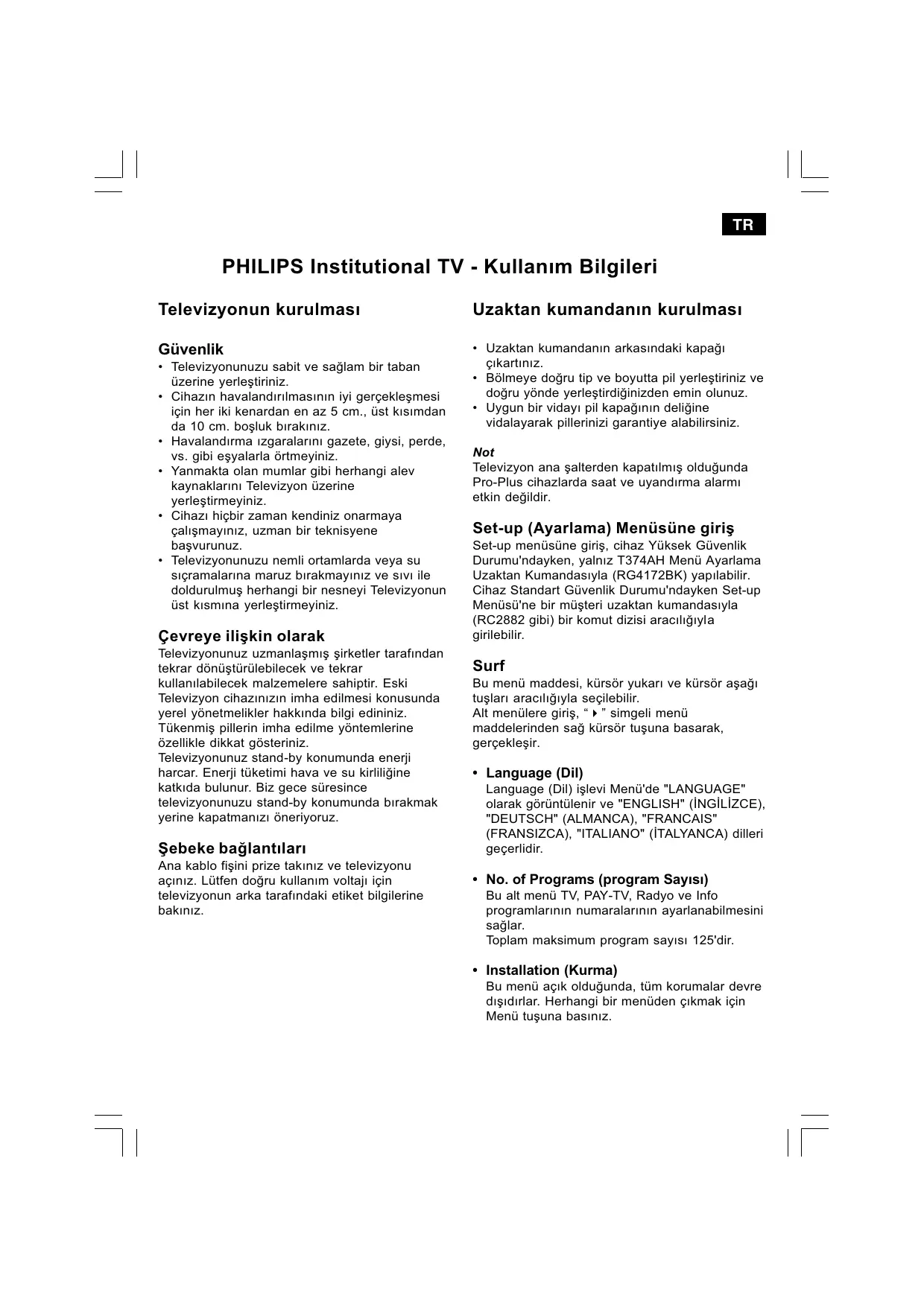 PHILIPS Institutional TV - Kullaným Bilgileri Televizyonun kurulmasý Uzaktan kumandanýn kurulmasý Güvenlik Uzaktan kumandanýn arkasýndaki kapaðý çýkartýnýz. Bölmeye doðru tip ve boyutta pil yerleþtiriniz ve doðru yönde yerleþtirdiðinizden emin olunuz. Uygun bir vidayý pil kapaðýnýn deliðine vidalayarak pillerinizi garantiye alabilirsiniz. Televizyonunuzu sabit ve saðlam bir taban üzerine yerleþtiriniz. Cihazýn havalandýrýlmasýnýn iyi gerçekleþmesi için her iki kenardan en az 5 cm., üst kýsýmdan da 10 cm. boþluk býrakýnýz. Havalandýrma ýzgaralarýný gazete, giysi, perde, vs. gibi eþyalarla örtmeyiniz. Yanmakta olan mumlar gibi herhangi alev kaynaklarýný Televizyon üzerine yerleþtirmeyiniz. Cihazý hiçbir zaman kendiniz onarmaya çalýþmayýnýz, uzman bir teknisyene baþvurunuz. Televizyonunuzu nemli ortamlarda veya su sýçramalarýna maruz býrakmayýnýz ve sývý ile doldurulmuþ herhangi bir nesneyi Televizyonun üst kýsmýna yerleþtirmeyiniz. Çevreye iliþkin olarak Televizyonunuz uzmanlaþmýþ þirketler tarafýndan tekrar dönüþtürülebilecek ve tekrar kullanýlabilecek malzemelere sahiptir. Eski Televizyon cihazýnýzýn imha edilmesi konusunda yerel yönetmelikler hakkýnda bilgi edininiz. Tükenmiþ pillerin imha edilme yöntemlerine özellikle dikkat gösteriniz. Televizyonunuz stand-by konumunda enerji harcar. Enerji tüketimi hava ve su kirliliðine katkýda bulunur. Biz gece süresince televizyonunuzu stand-by konumunda býrakmak yerine kapatmanýzý öneriyoruz. Þebeke baðlantýlarý Ana kablo fiþini prize takýnýz ve televizyonu açýnýz. Lütfen doðru kullaným voltajý için televizyonun arka tarafýndaki etiket bilgilerine bakýnýz. Not Televizyon ana þalterden kapatýlmýþ olduðunda Pro-Plus cihazlarda saat ve uyandýrma alarmý etkin deðildir. Set-up (Ayarlama) Menüsüne giriþ Set-up menüsüne giriþ, cihaz Yüksek Güvenlik Durumu'ndayken, yalnýz T374AH Menü Ayarlama Uzaktan Kumandasýyla (RG4172BK) yapýlabilir. Cihaz Standart Güvenlik Durumu'ndayken Set-up Menüsü'ne bir müþteri uzaktan kumandasýyla (RC2882 gibi) bir komut dizisi aracýlýðýyla girilebilir. Surf Bu menü maddesi, kürsör yukarý ve kürsör aþaðý tuþlarý aracýlýðýyla seçilebilir. Alt menülere giriþ, " simgeli menü maddelerinden sað kürsör tuþuna basarak, gerçekleþir. Language (Dil) Language (Dil) iþlevi Menü'de "LANGUAGE" olarak görüntülenir ve "ENGLISH" (ÝNGÝLÝZCE),